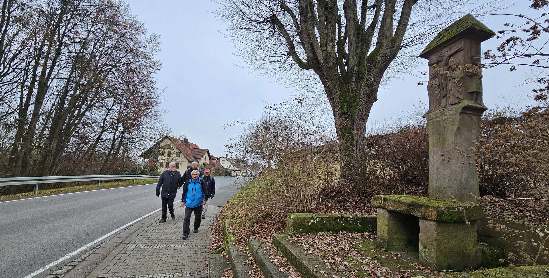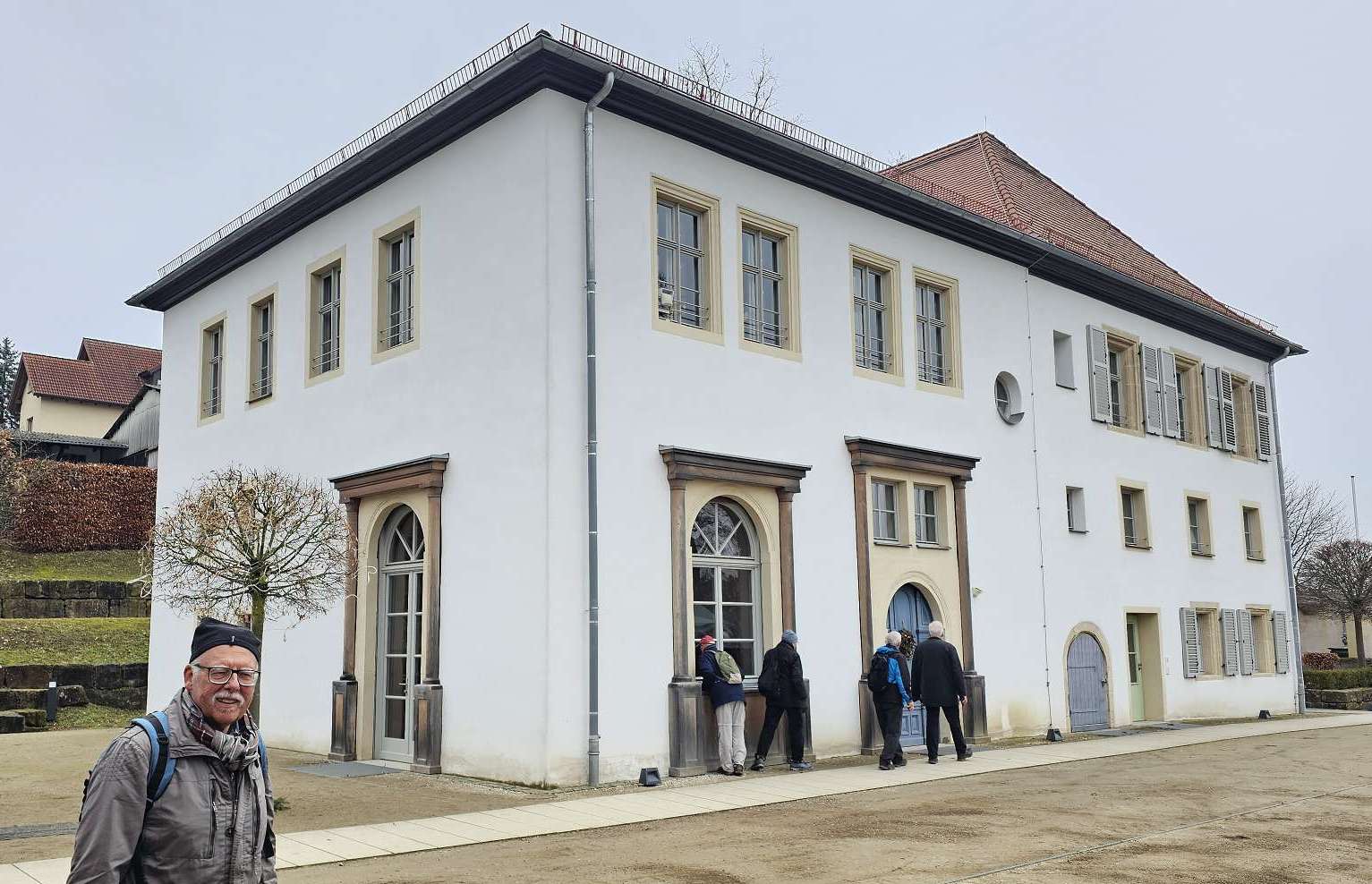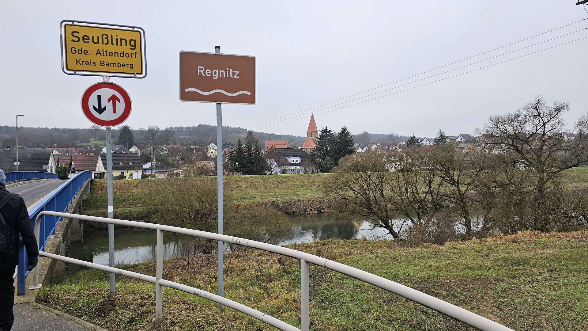 Darstellung" im Tempel). Schnell erreichen wir Sassanfarth, gehen durch den Schlosshof und werfen einen kurzen Blick auf das Schloss. Auch Goethe soll das getan haben - und offensichtlich hat er sich hier ordentlich benommen, im Gegensatz zu seinem Besuch in Tübingen 😂; Jedenfalls ist nichts Gegenteiliges bekannt. Weiter geht es (wieder zurück) über die Regnitz und über den Kanal, der hier ca. doppelt so breit ist, wie in Erlangen (warum so breit?). Wir schaffen die lange Brücke aber ohne Mühe und freuen uns trotzdem, dass sich der Brauerei-Gasthof Kraus gleich dahinter, am Ortseingang von Hirschaid befindet. Wie immer sind wir sehr zufrieden und hätten beinahe unseren extra vorverlegten Termin verpasst, weil ManniKe, mit dem Stichwort "Siemens-Gerätewerk", die kohärente Logorrhoe der Wirtin aktiviert hat. Als Dankeschön für den Austausch alter Erinnerungen hat sie ihm ein Tragerl Bier spendiert, dass er, Kamerad wie er ist, sofort an seine Mitwanderer verteilt! Tatsächlich wartet Herr