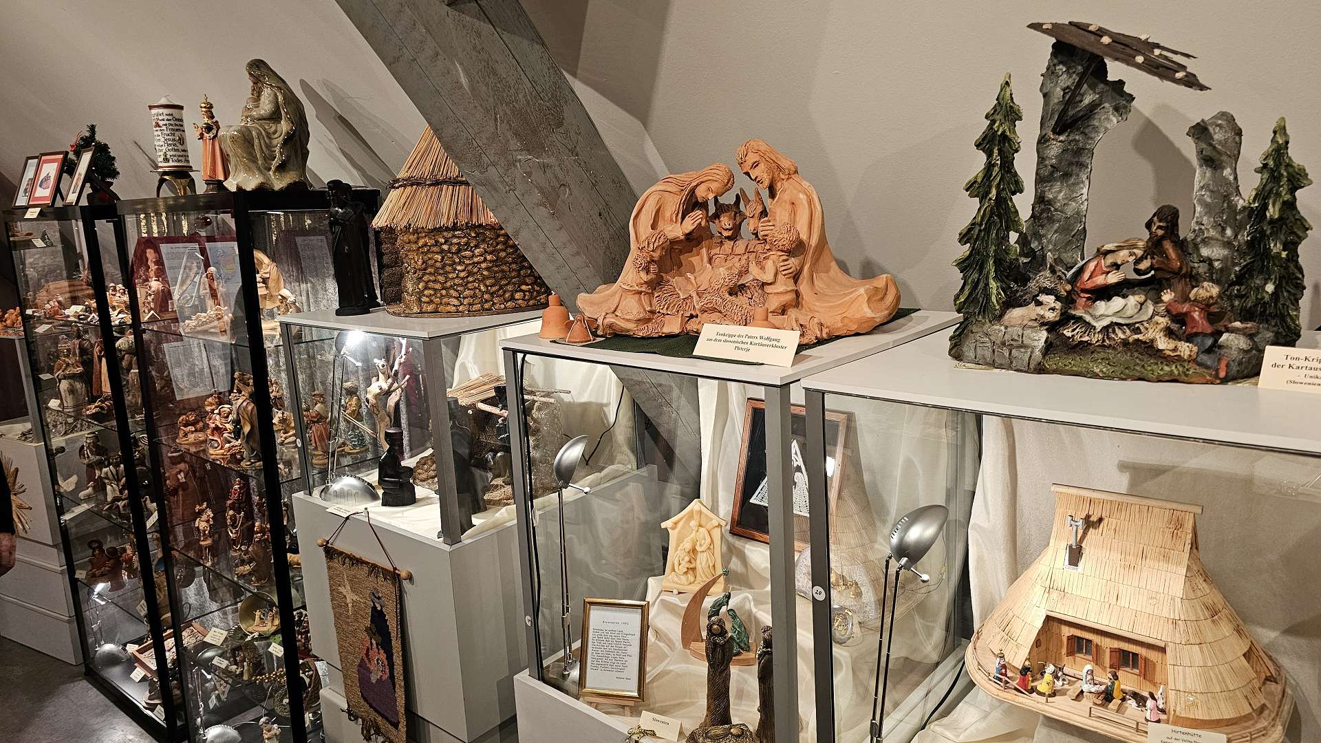 Nun aber folgt der Höhepunkt - der wahrlich einer ist: Das Krippenmuseum mit seinen ca. 450 Krippen aus über 40 Ländern aus 4 Erdteilen. Liebevoll und mit viel Fleiß in über 50 Jahren zusammengetragen vom 2014 verstorbenen Ehepaar Ingeborg und Hubert Patzelt, gepflegt und ergänzt durch das Ehepaar Bergmann, das von ihren Reisen immer wieder neue, besondere Krippen, Skulpturen und Bilder, die zur Weihnachtsgeschichte passen, mitbringt. Obwohl Kunst bei uns,