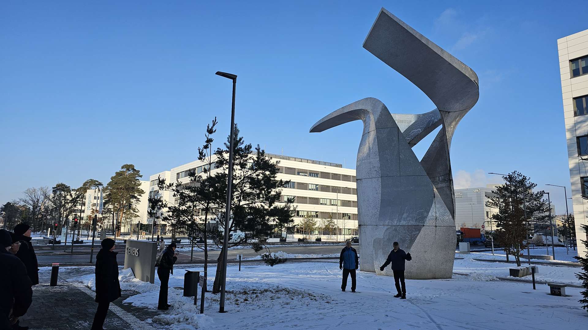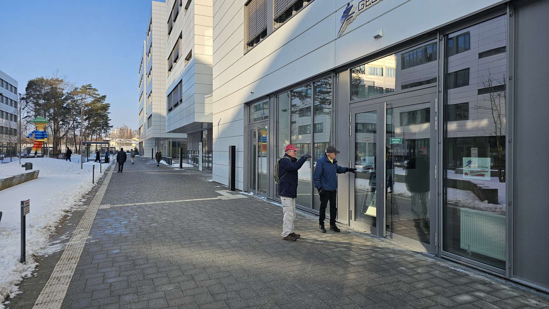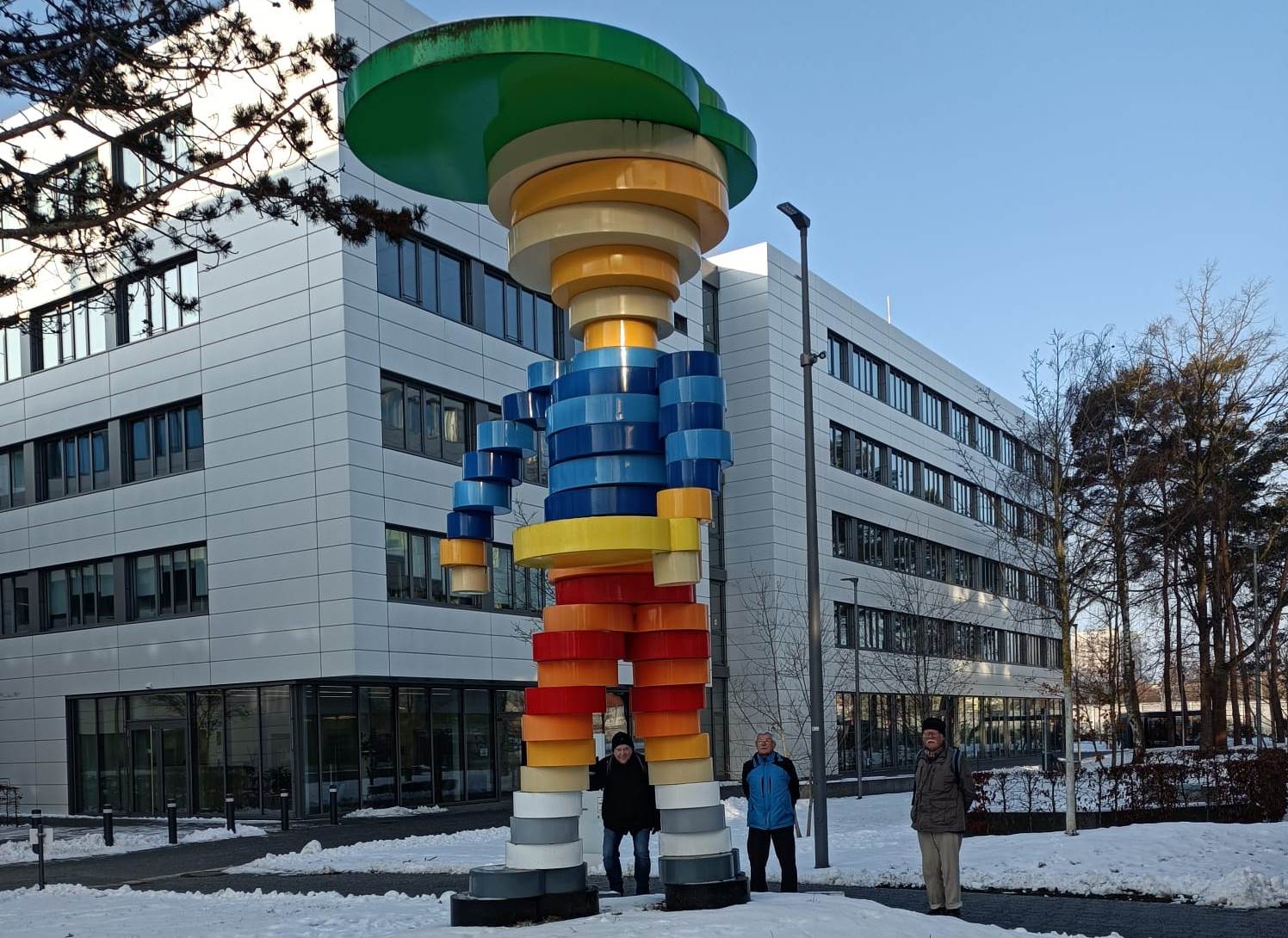 erstreckt, zu erkunden. Dann stehen wir auch schon vor dem ersten Heileit des heutigen Ausfluges: "The Wings ", ein ca. 10 Meter hoher und 15 Tonnen schwerer Koloss des Architekten Daniel Libeskind. Aber warum englisch "The Wings"? Weil man sich für die deutsche Sprache schämt? oder möchte man den ausländischen Besuchern, die zwar nach Deutschland gekommen sind, um etwas deutsches zu sehen, zu lernen, nicht zumuten, sich mit der deutschen Sprache zu beschäftigen? Oder sollte der Betrachter nur im Unklaren darüber gelassen werden ob es sich hier um Flügel oder um Tragflächen handelt? Vielleicht kann ein Besuch am späten Abend zumindest Aufschluss darüber geben, denn dann kann das Werk mit in die Oberfläche eingelassen LEDs beleuchtet werden - was eher auf den zweiten Begriff hindeutet.Das Gelände auf der anderen Seite der Günter-Scharowsky-Staße ist nun tatsächlich komplett zugänglich, die neuen Gebäude können alle "umrundet" werden - ob man in alle auch hinein kann, haben wir nicht getestet. Hier gibt es mehrere Lokale, ein Büro der IGM und das Health-Care-Center, das ehemalige Gesundheitszentrum - offensichtlich auch für englisch sprechende Kundschaft gedacht Zwischen den Gebäuden steht die bunte, ca. 4 m hohe 'in eine offene Zukunft scheibenschleudernde Figur "The Entwurf'". Seine Internationalität erhält sie aus dem Artikel; Leider sagt der nichts über das Genus aus, weswegen "Inges Idee" wohl eine gendergerechte "Figur" beschreibt, bei der sich durch den gewählten Artikel sogar das "...*in" erübrigt.