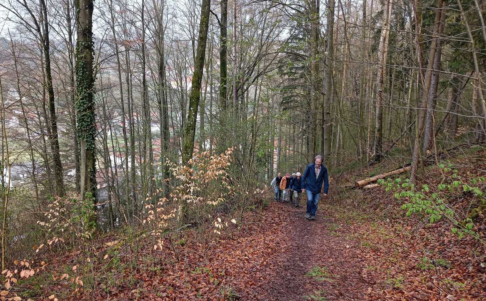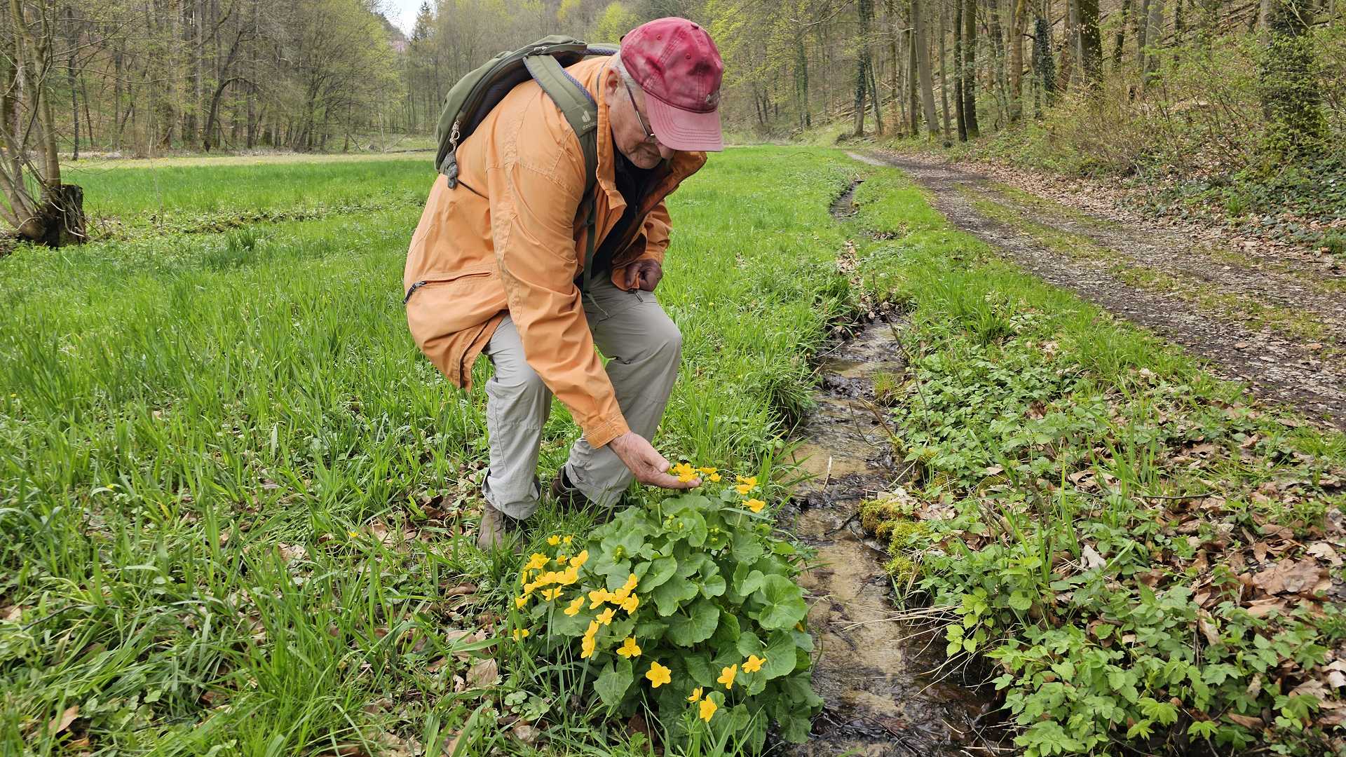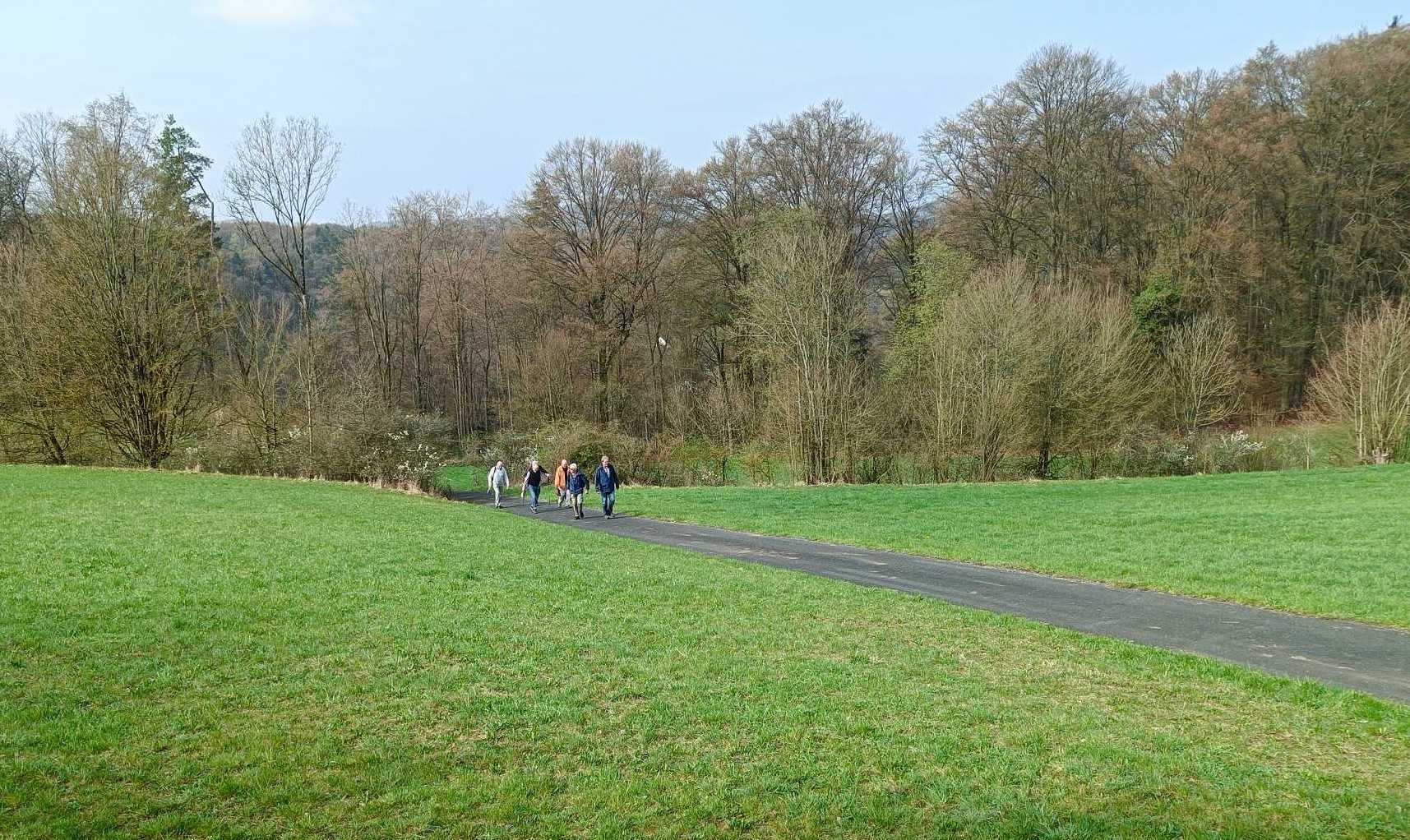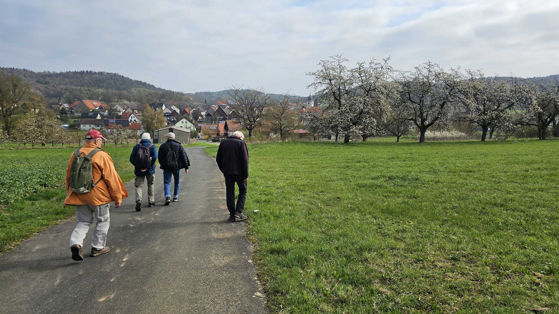 Bedeutung. Wir verlassen Affalterthal in nordöstlicher Richtung und vermissen am Ortsausgang Henry und Roland, die nach ihrem Nickerchen in der Kirche, während wir am Osterbrunnen waren, nicht rechtzeitig aufgewacht sind. So marschieren wir, nach einem Weckruf, in zwei Gruppen hintereinander mit Blau-Punkt auf der Straße nach Bieberbach. Auch als Blaupunkt nach rechts abbiegt bleiben wir noch ca. 200 m auf der Straße und biegen dann mit Rot-Punkt nach rechts in ein Wiesental, das uns nach Bieberbach führt. Ein stilles, ruhiges Tal, das mit seinem hellen Grün und dem bunten Laub der Bäume vor dem dunklen Wald gleich an das schöne Volkslied erinnert: "dich mein stilles Tal, grüß ich tausendmal".