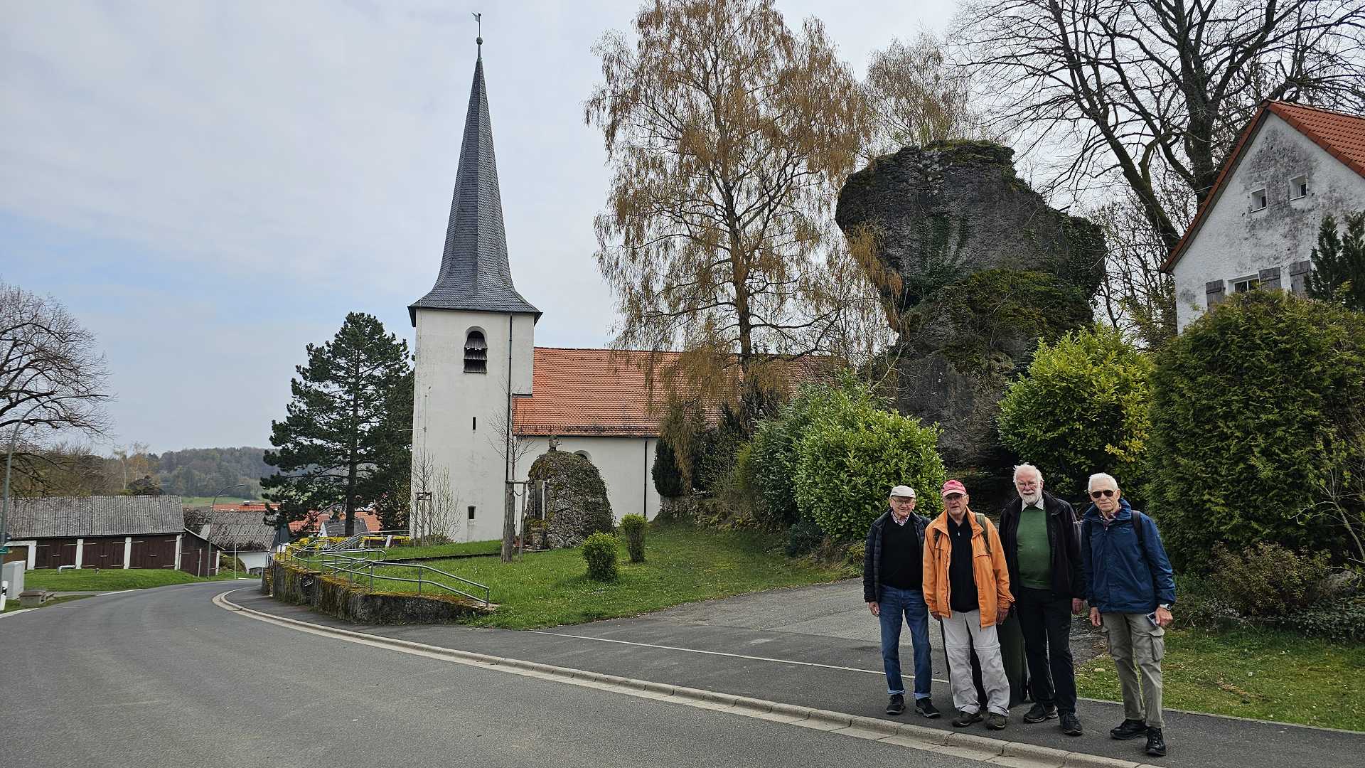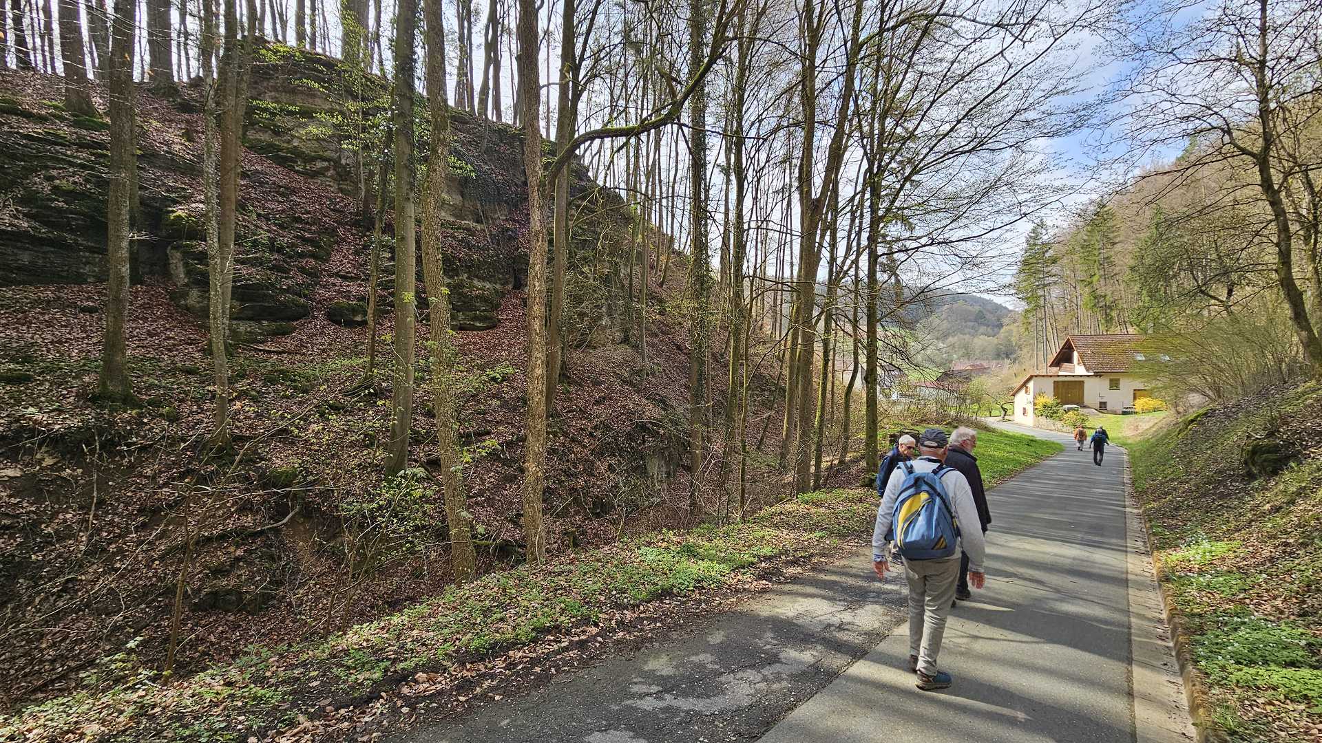auch so bleiben. Wir gehen weiter auf dem Egloffsteiner Kulturweg Nr. 2, zuerst ein Stück auf der Straße, dann durch ein schmales Tal nördlich der Straße, zur Schlehenmühle. Hier freuen wir uns, dass der Wirt auch dann für Gruppen öffnet, wenn eigentlich Ruhetag ist und vor allem über die reichlichen, wirklich hervorragend mundenden Schäufele, Sauerbraten und Schnitzel.
