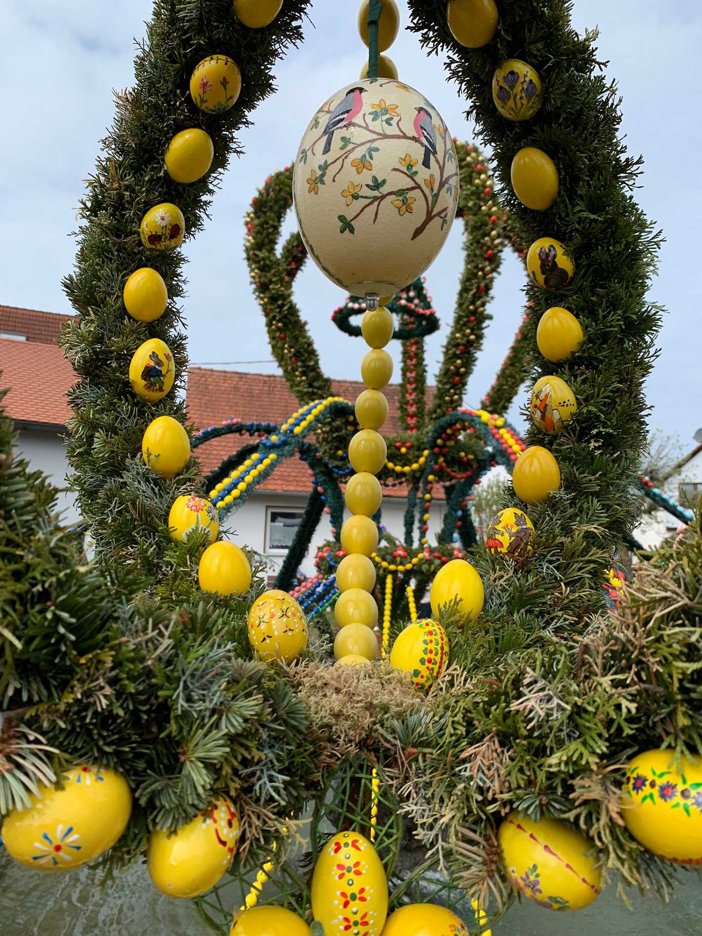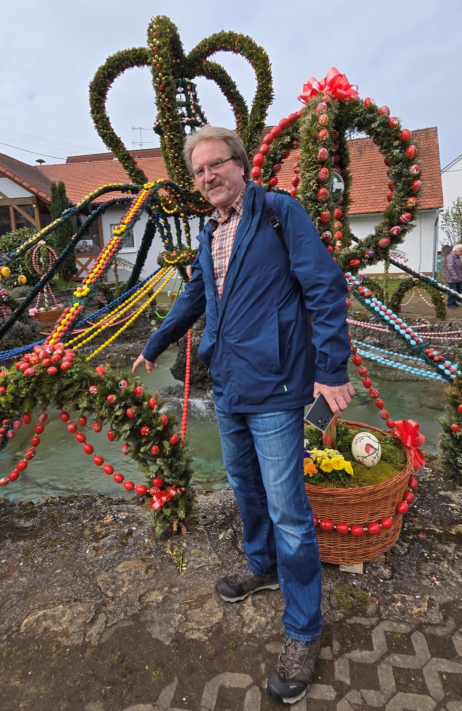FCN-Fans klicken auf das rechte Bild (aus 2025) Der "größte Osterbrunnen der Welt" in Bieberbach und Einkehr im Gasthof Schlehenmühle Unsere heutige Wanderung beginnt in Egloffstein mit einem ordentlichen Anstieg nach Affalterthal. Als kleine Entschädigung bietet sich ein schöner Blick durch die noch nur spärlich belaubten Bäume auf Egloffstein und seine tausendjährige Burg. Auf der Höhe blühen dann in Wald und Wiesen Frühlingsblumen und in den Affalterthaler Gärten wecken spätestens jetzt die bunten Tulpen, Hyazinthen und Osterglocken, leuchtend gelbe Forsythien, Japanische Kirschen und Magnolien, Frühlingsgefühle. In Affalterthal am Kirchplatz treffen wir auf unseren ersten Osterbrunnen. Mit seinem Osterlamm (und dem Kirschenemblem) ist er ein schönes Beispiel für die Tradition des Brunnenschmückens in dieser Gegend.
