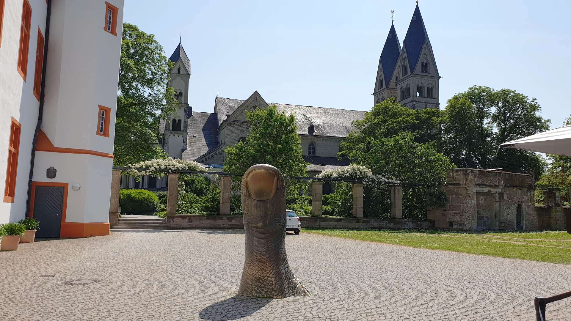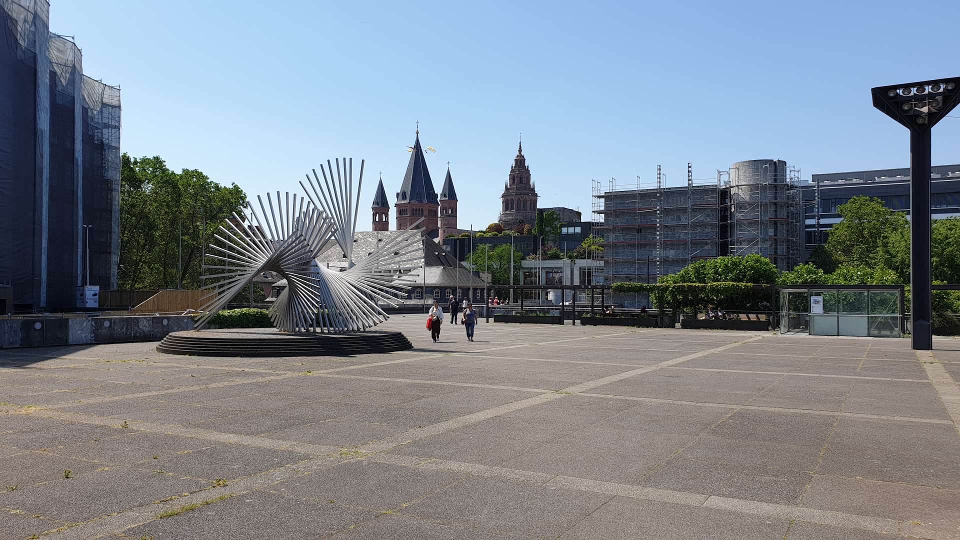Jockel-Fuchs-Platz, "Lebenskraft" von Andreu Alfaro / im Hintergrund: Dom St. Martin |