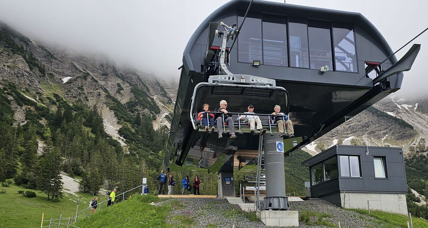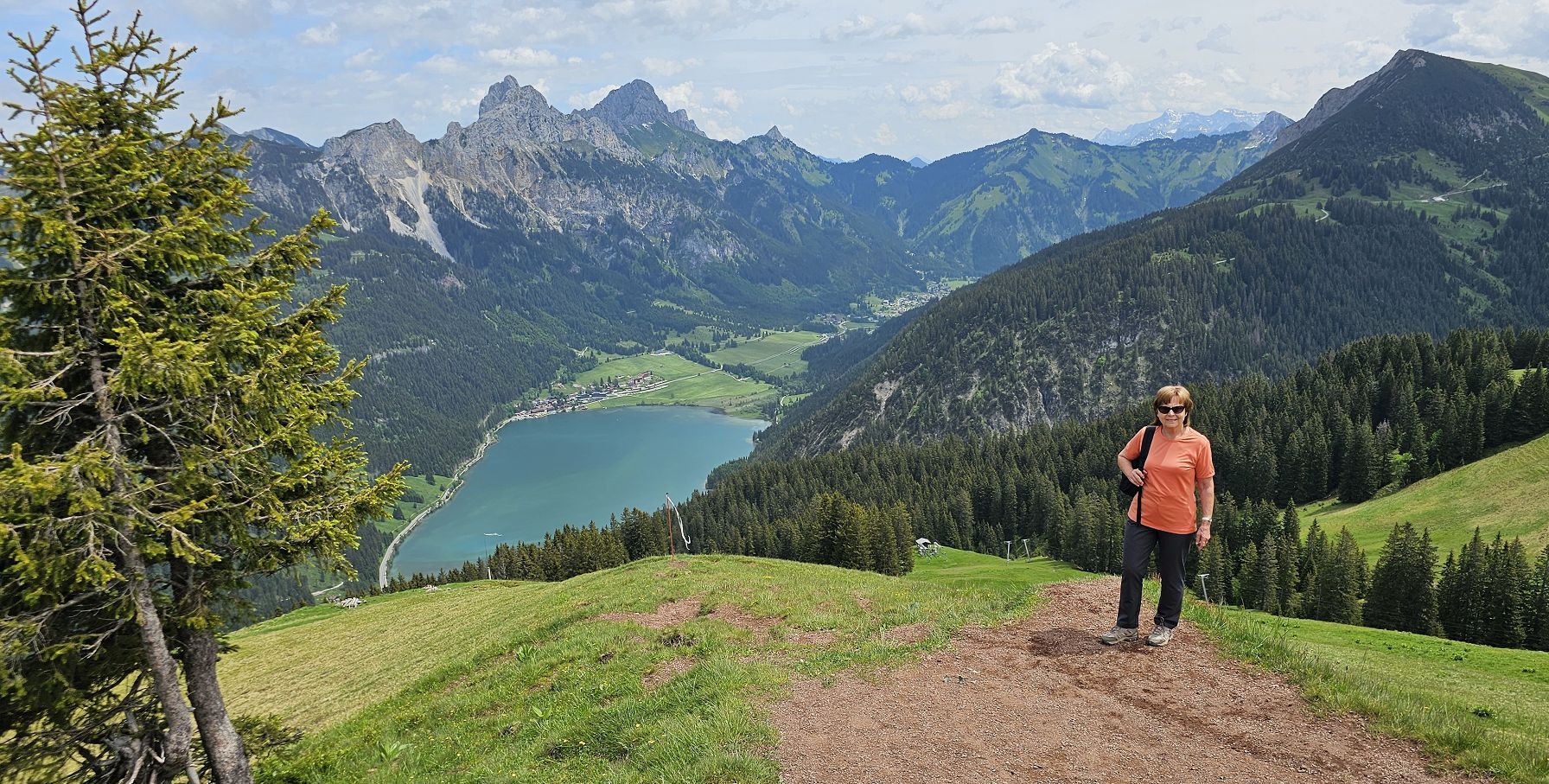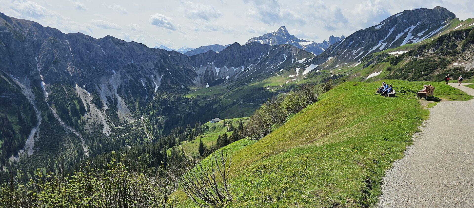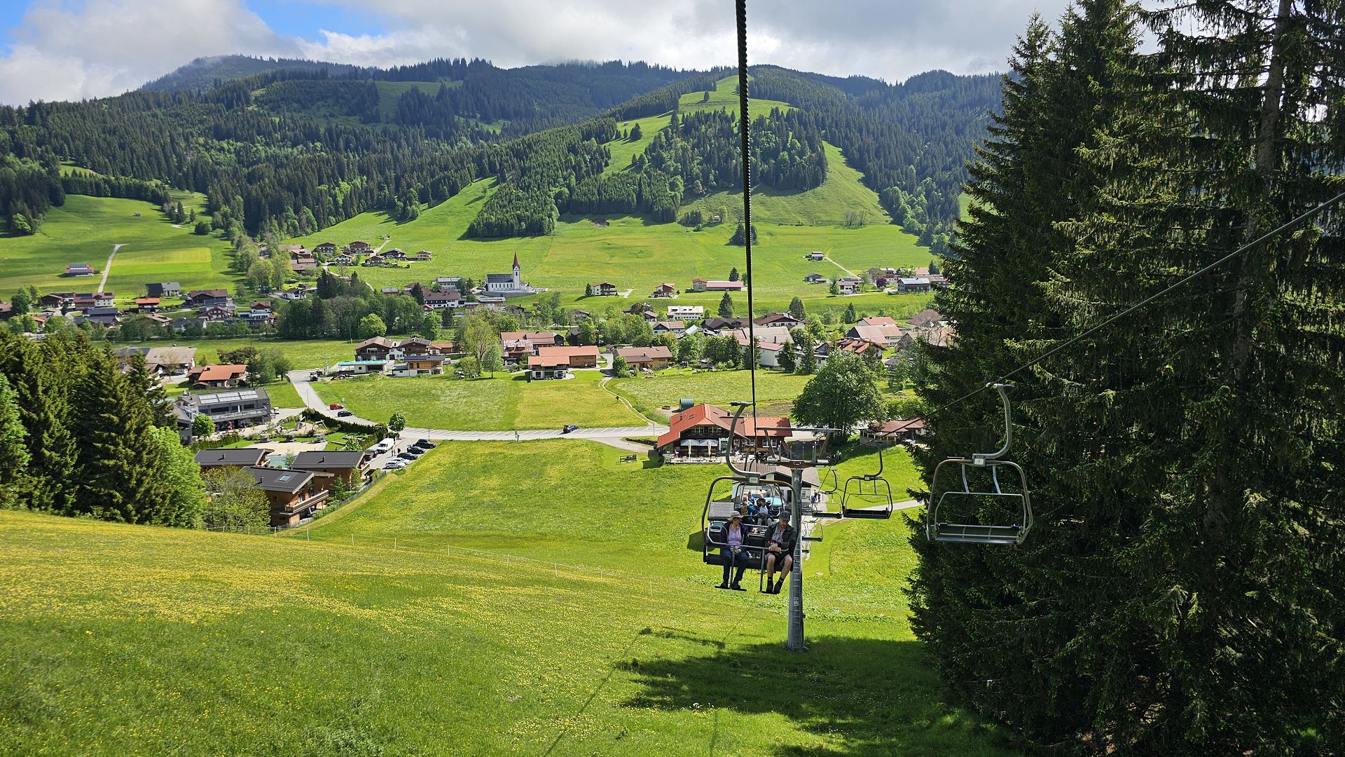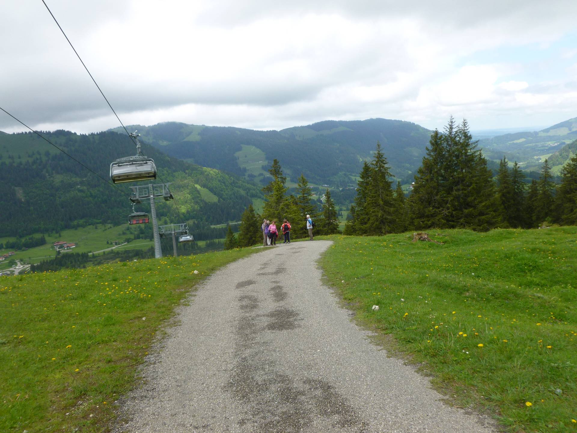 ![]() oben: am Heimweg zwischen Tannheim und Haldensee - links die Gondel zum Füssener Jöchle Tag 6, Samstag, 8.6.24: von Tannheim mit der Gondel aufs 9er-Köpfle |