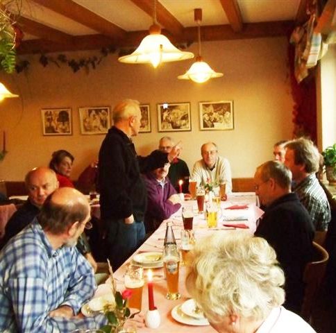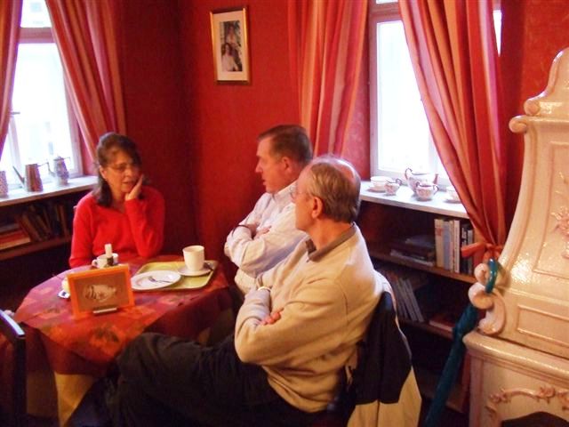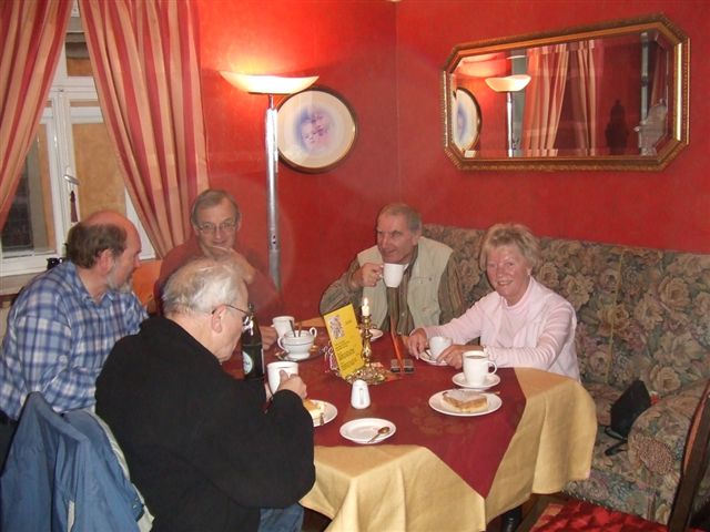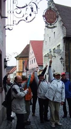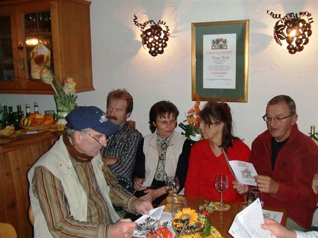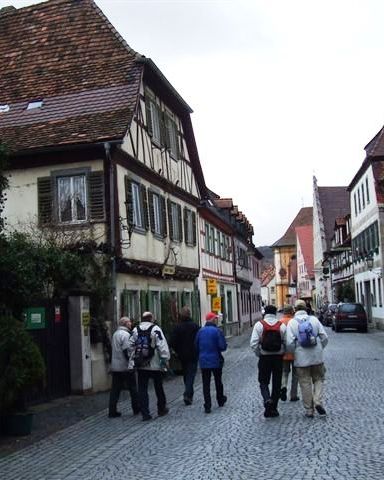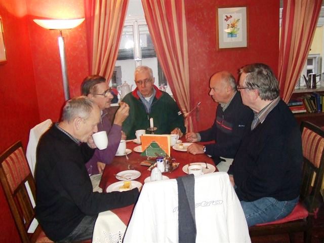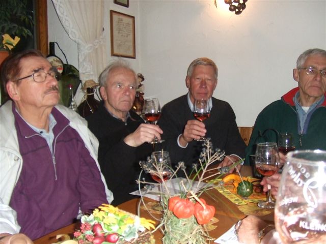 vorbereitet. Also schön Futter fassen und für den nächsten Teil stärken. Das Wetter war wohl etwas diesig, aber nicht regnerisch, so daß einer kleinen Wanderung oder mittlerem Spaziergang nichts im Wege stand. Also auf ging's nach Sommerhausen. Zunächst leicht bergauf zwischen Feldern und Wäldern. Dann aber durch die Weinberg hinab nach Sommerhausen. Ziel war ein Cafe, in welchem Udo und Manfred als Servierdamen auftraten und die Versorgung meisterten. Kaffee und Dresdner Eierschecke waren die Renner. Direkt am