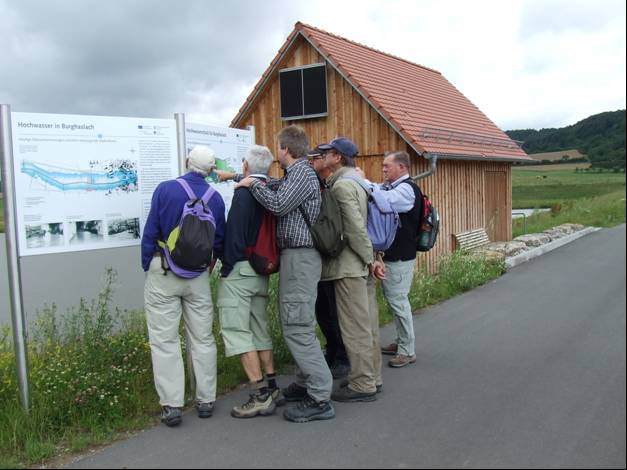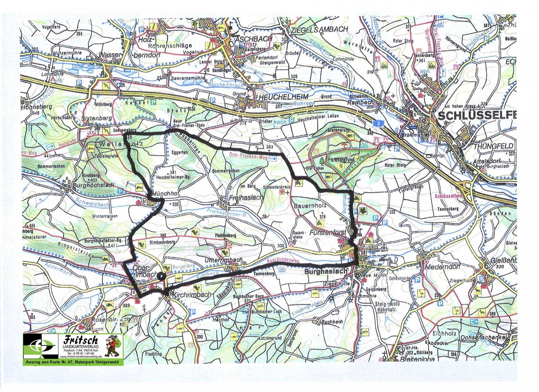 Schmetterlingswiese. Von der Höhe aus hatten wir eine herrliche Aussicht in das weite Frankenland mit seiner herrlichen Landschaft und beeindruckenden Wolkenbildungen. Ein sehr schöner Weg. Bald nahmen wir wieder Kurs auf und über das kleine vorgelagerte Dörflein Fürstenforst und erreichten so wieder Burghaslach. |