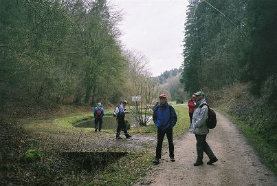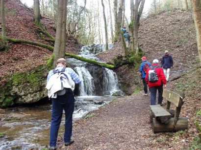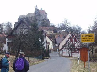 Aber frischgemut ging es dann weiter. An der etwas betagten aber sehr schönen Griesmühle vorbei, langsam den Berg hinauf. Nächste Etappe war der kleine Ort Treuf. Eine saubere kleine Ortschaft mit großen Bauernhäusern. Am nördlichen Ortsende schwenkten wir auf die Fahrstraße nach Hohenstein ein, bewunderten noch die Schafe und die Puten. Nach ca. 400 m bog die Fahrstraße nach links ab, aber wir liefen weiter in Richtung Nordwest auf dem Feldweg in Richtung Hohenstein. Auf der Höhe angekommen grüßte auch schon die markante Burg herüber zu uns. Kurz darauf trafen wir noch unseren Wanderkameraden Rudi, der sein Auto in Hohenstein abgestellt hatte und uns entgegenlief. Este Frage: „Ist der Hohensteiner Hof auf?“ Seine Antwort: „Alles dunkel“. Ab sofort ließen wir Natur Natur sein und die Märzenbecher waren uns wurscht. Einziges beherrschendes Thema war eine offene Gastwirtschaft.