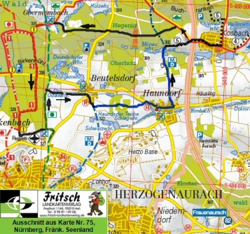 geradeaus in Richtung Herzogenaurach. Am Ende des Waldes noch kurz einen Haken
