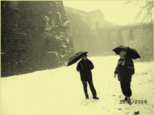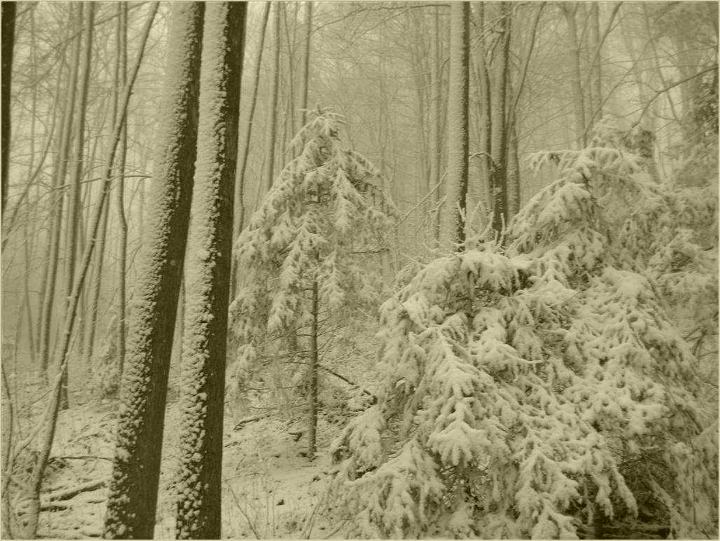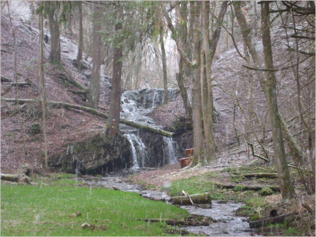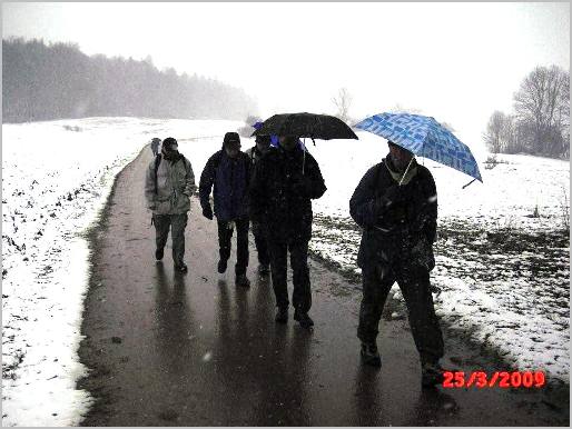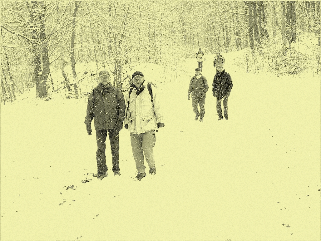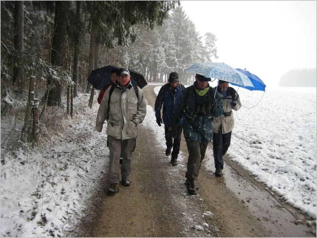 den Märzenbechern hinauf. Der Schneefall hat in der Zwischenzeit zugenommen und