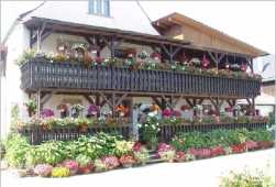 Eine Ortschaft in der unendlich viele Blumendie Häuser und Straßen zieren.