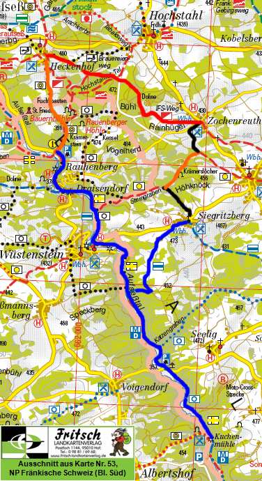 weiter nach Hochstahl. Nun verlassen wir Siegritzberg und bleiben bis zu einem kleinen Teich auf der Straße nach Wüstenstein. Dort halten wir uns auf dem Feldweg ziemlich südlich und haben nun tatsächlich eine Markierung, den blauen Querstrich. Nun kann nichts mehr schieflaufen, denn der Weg führt direkt ins Tal der Aufseß. Das erreichen wir nun südlich von Wüstenstein und traben locker zurück bis zur Kuchenmühle. Hier stärken wir uns mit Kaffee und Kuchen und lassen so den Wandertag ausklingen. Fazit: Das Aufseßtal ist zu jeder Jahreszeit ein Genuß. |