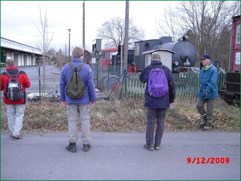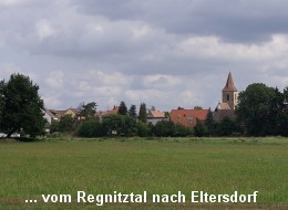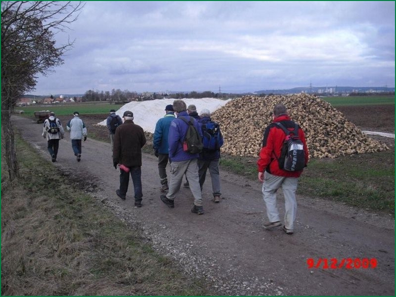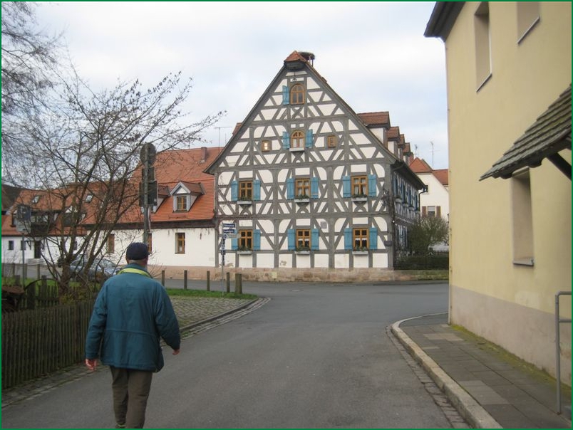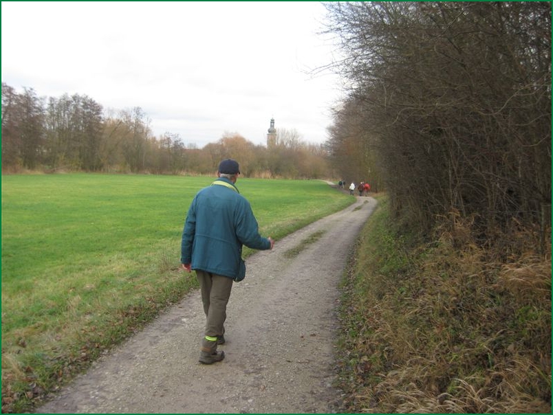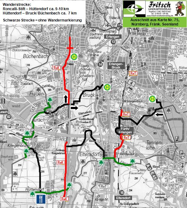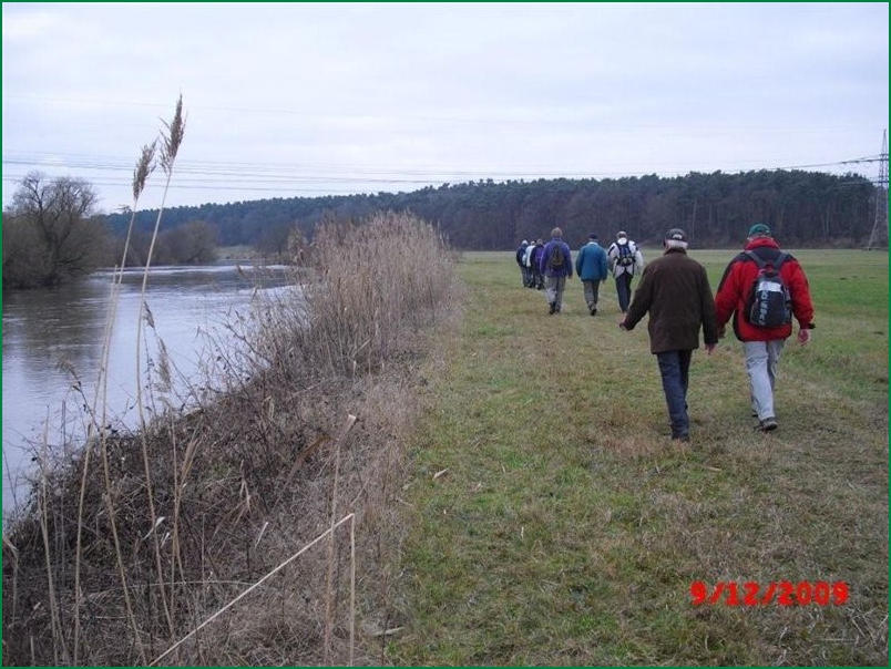 Direkt auf der Westseite des Kan als liefen wir dann weiter, bis zum Weg der von Hüttendorf nach Eltersdorf führt. Wir streben dem Ortskern von Hüttendorf zu und meinen dort die Gastwirtschaft Popp. Hier wartet bereits Wil li mit reservierten Plätzen auf uns. Also das wichtigste der Wanderungen, die Speisekarte wird studiert und jeder nordet sich mit der Speise seiner Wahl ein Frisch gestärkt machen wir uns nun auf den Weg nach Kriegenbrunn, also erstmal raus in westlicher Richtung, dann nehmen wir den Feldweg, der in nördlicher Richtung geht. Von hier ist es nur noch eine kurze Strecke und wir kommen auch schon in Kriegenbrunn an. Wir kennen ja schon die schöne alte – noch romanische – Kirche mit ihren tollen Fresken und sehen deshalb von einer näheren Untersuchung ab. Eher interessiert uns die ausgehängte Speisekarte am nahen Gasthof. Nun laufen wir durch den Ort und streben dann entlang der Aurach durch das schöne Tal nach Frauenaurach. Hier können wir Achims liebevoll gemeinte Einladung zu Kaffee, Kuchen und anschließend Rotweinprobe gerade noch abwehren und laufen nun leider hungrig und durstig weiter in Richtung Erlangen. Hier trennen sich unsere Wege, die „Westler“ bleiben am Kanal und laufen nach Büchenbach, während die „Süd- und Ostgruppe“ nun unter dem Kanal weiter in Richtung Bruck marschiert.
