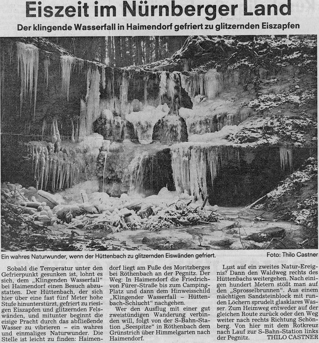 am Leinleiterweg auf das Hinweisschild «Klingender Wasserfall -