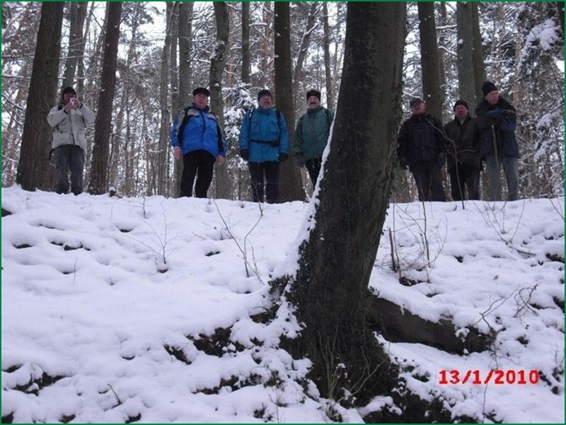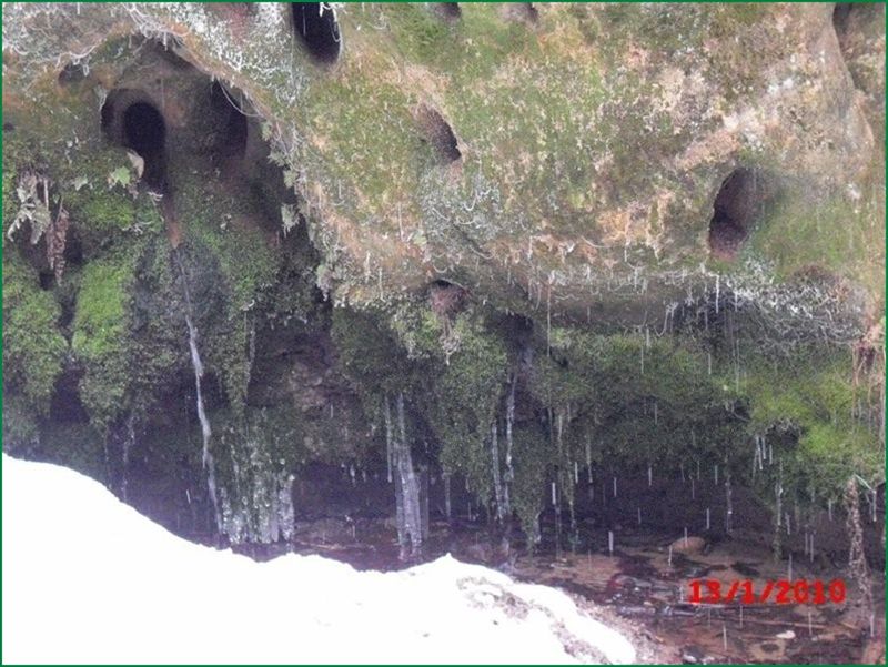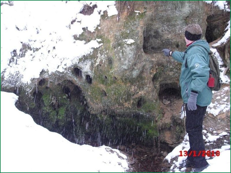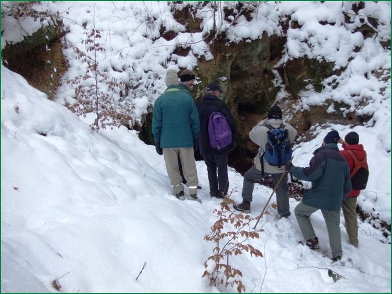 kleinen Abhang hinunter, und wir stehen vor einer Sandsteinwand mit runden
