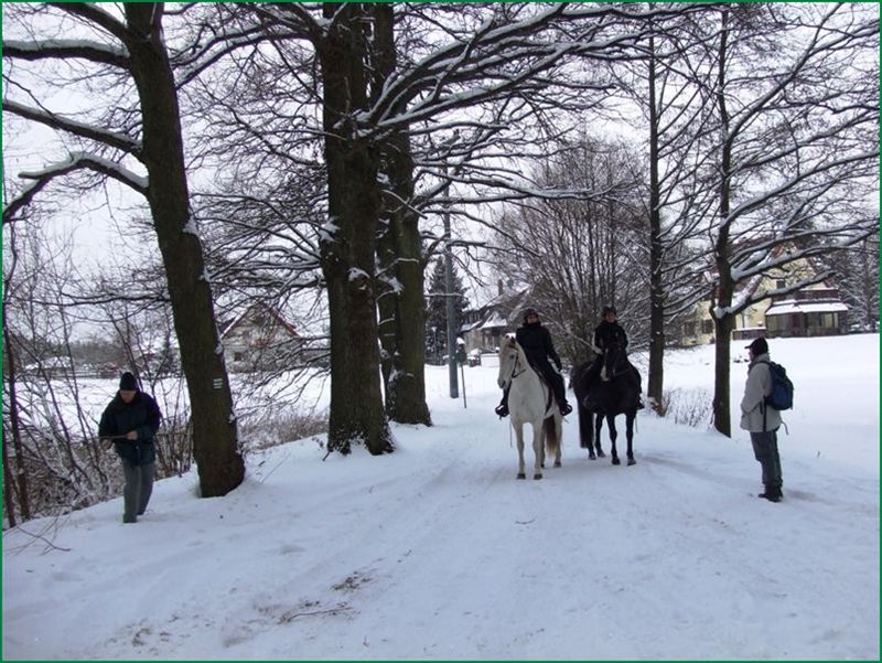aufpassen! Wir gehen den Leinleiterweg geradeaus, vorbei an einer Pferdekoppel.