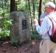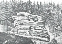 Hochstraße. Bald erreichten wir wieder "unseren blauen Querstrich“, dem wir nun bedenkenlos folgten. Oberhalb von Stinzendorf am Rand des Dillenbergs stand bis zum Jahre 1890 der sogenannte Drudenstein. Er wurde erstmals von Johann Bernhard Fischer erwähnt, der über Stinzendorf schreibt: "ein kleiner Weiler, lediglich merkwürdig wegen des ohnfern davon, an der Höhe des Dillenberges, bei der Waldspitze nach Deberndorf, befindlichen Druidensteins." Diesem Stein werden nun magische Kräfte zugeschrieben. Aber wie kam er dorthin? "Über den Dillenberg sollte einst der Teufel einen riesigen Felsbrocken transportieren. Als er dort angekommen war, krähte in Stinzendorf der Hahn. Die Nacht war vorbei. Der Teufel mußte den Felsen fallen lassen. Jedes Jahr in der Walpurgisnacht tanzen die Hexen und Druiden um ihn herum – So jedenfalls behauptet die Sage.