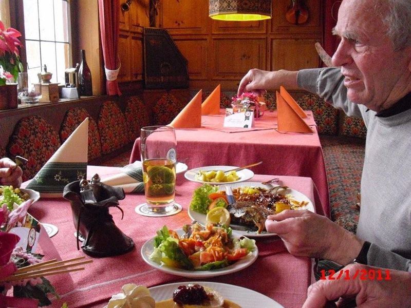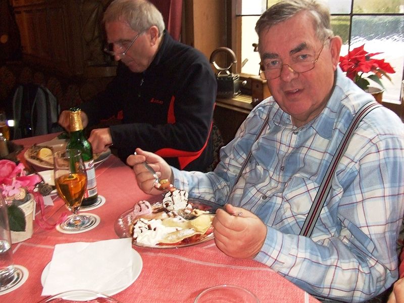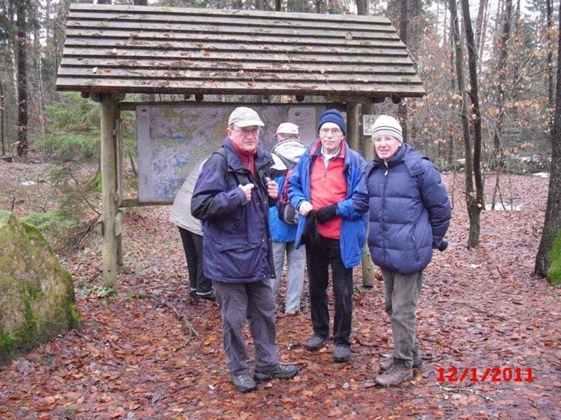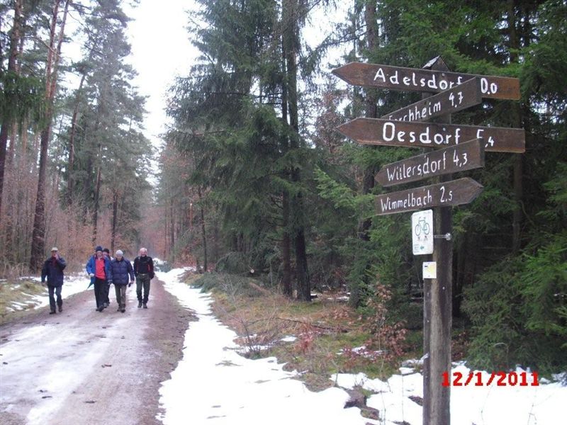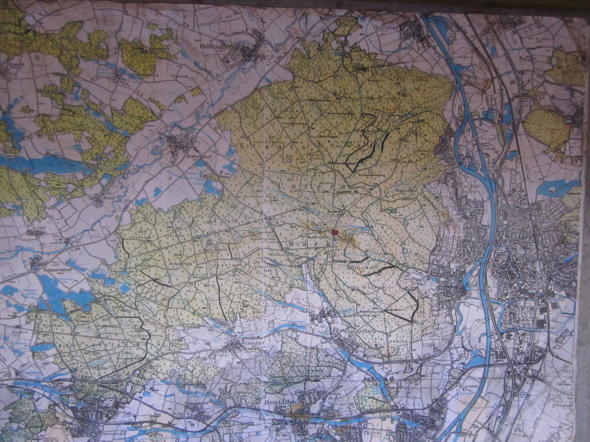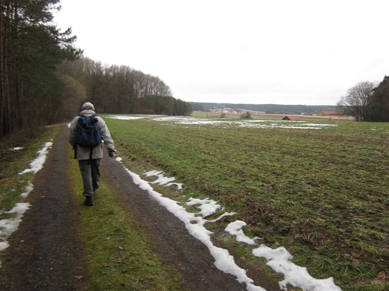 hervorragend und erwartungsgemäß versorgt. Nach dem üppigen Schmaus ging es wieder ins Freie. Unmittelbar an der neoromanischen Kirche bogen wir nordöstlich ab und folgten nun dem gelben Querstrich. Also raus aus Heroldsbach, hinauf bis zum Waldrand. Von dort hatten wir übrigens eine ganz tolle Aussicht auf die nähere Umgebung bis zur Fränkischen Schweiz. Dann aber bog unsere Markierung in den Wald und wieder abwärts bis zu einigen kleinen Fischweihern. Erneut mußten wir aufsteigen, um dann aber direkt auf Wimmelbach zu stoßen. Quer durch den Ort, an der kleinen Kapelle vorbei und leicht bergan in den Wald. Ab der „spöden Marter“ ging es dann wieder abwärts bis wir wieder unseren Einstieg erreicht hatten. Auf gleichem Weg wieder zurück bis zu unseren Autos. |