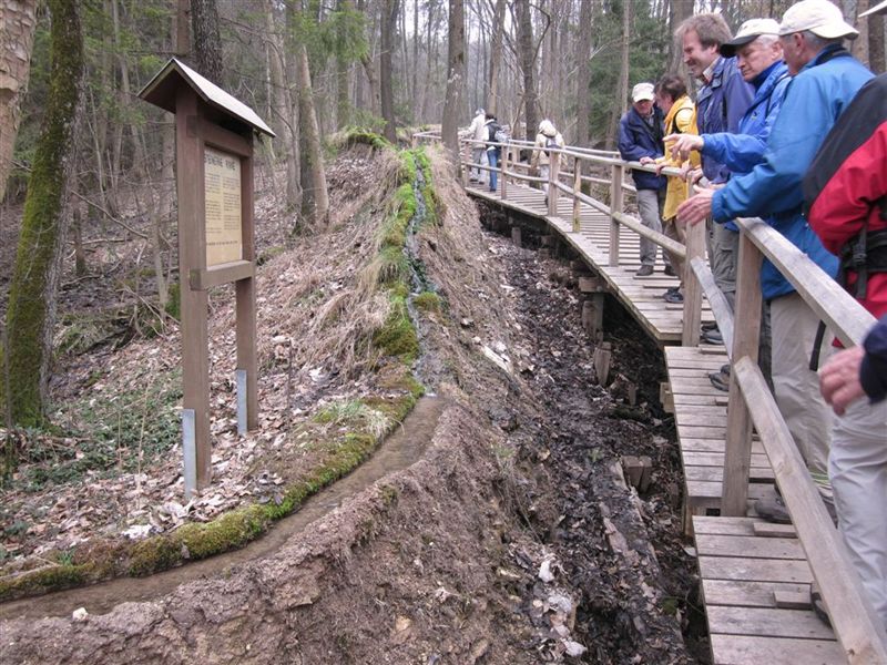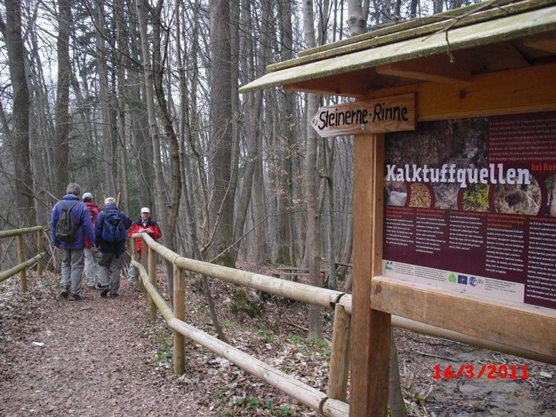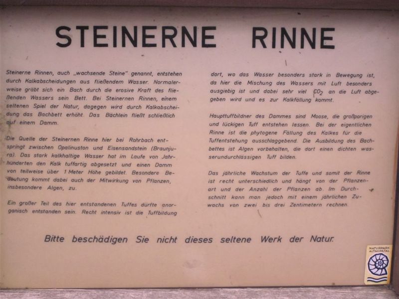 riesiges Wir steigen dann noch einige hundert Meter den Berg hinauf, als der Pfad endet orientieren wir uns westlich in Richtung Kaltenbuch. Bald erreichen wir die Fahrstraße und laufen dann weiter in westlicher Richtung durch den Ort. Am Ortsende schwenken wir auf den südlich verlaufenden Wanderweg (Frankenweg) und haben nun die Hochebene erreicht. Erst über freies Feld und dann am Waldrand entlang bis zur Straße nach Rohrbach. Hier biegt dann auch wieder ein Pfad ab (wenn man möchte, schon vor der Strasse), der uns den Weg zu der Steinernen Rinne weist. Allerdings ist die Beschilderung nicht ganz so, wie sie sein sollte: erst am unteren Ende erreichen wir die Steinerne Rinne (allerdings auf einem sehr schönen Weg). Angekommen stiefeln wir dann auf den Planken hinauf und staunen über dieses Wunderwerk der Natur. Es ist schon schwer zu verstehen, daß dieses kuriose Bauwerk von allein entstanden sein soll. Wir gehen bis zur Quelle und steigen dann auch wieder hinab. Bild: Panoramino Autor: Robert Lutz Nun bleiben wir oberhalb von