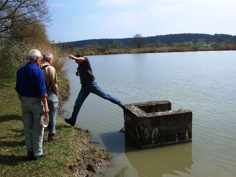 Frösche - leider nicht die "Blauen" - die sich Hals über Kopf ins Wasser stürzen als sie uns bemerken. Also laufen wir ca. 100 m