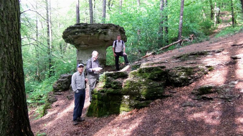 Wir aber gingen ein paar Meter nach rechts und dann nach links mit Blaustrich zum Teufelstisch. Dort und auf dem weiteren Weg "wimmelt" es von Markierungen. Wir gingen weiter bergauf, erstmal Ost/NordOst, bis wir eindeutig den Gelbstrich Richtung Norden nach Guttenburg hatten!!!