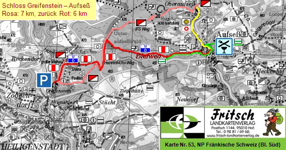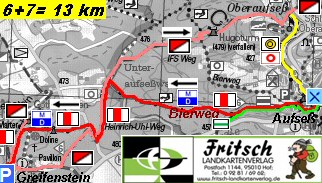 Ausgangspunkt bei der Burg Greifenstein. Fazit: Auch bei schlechtem Wetter sind wir nicht alternativlos. Eine schöne Burg die es lohnt besucht zu werden und dann eine angenehme Halbtageswanderung mit einer sehr schönen Einkehrmöglichkeit in Aufsess. Varianten über Heckenhof sind auch möglich. |