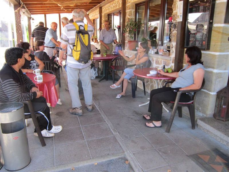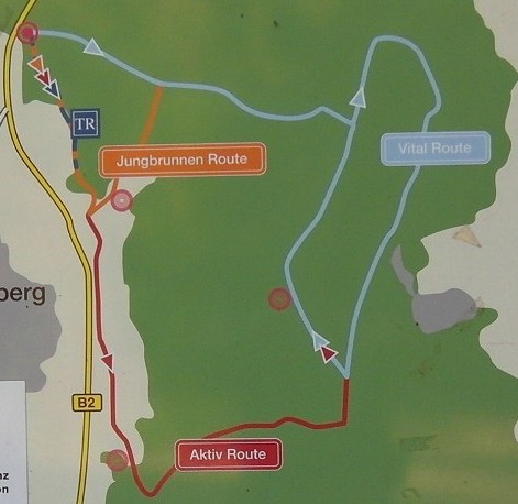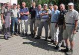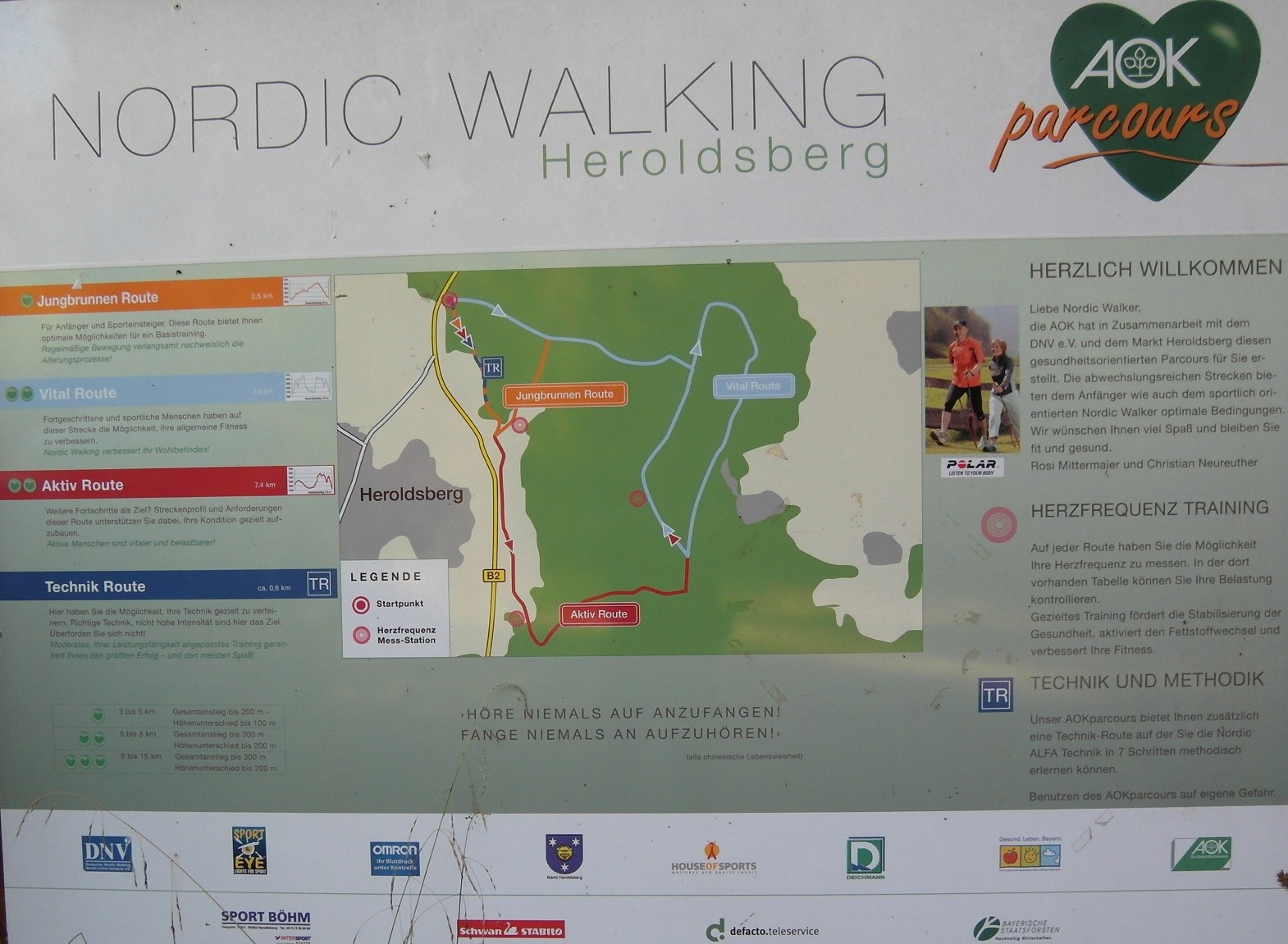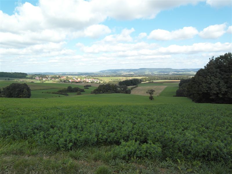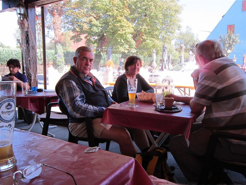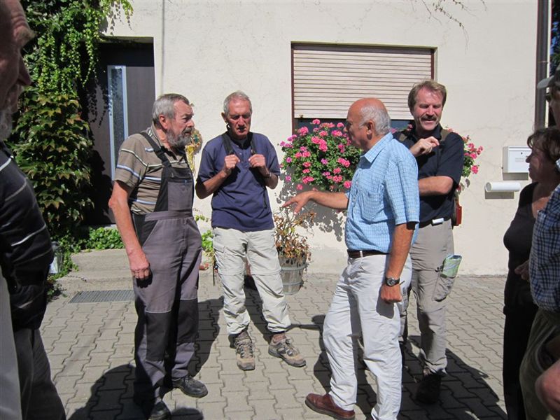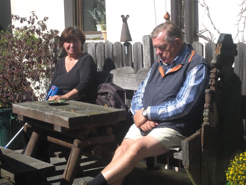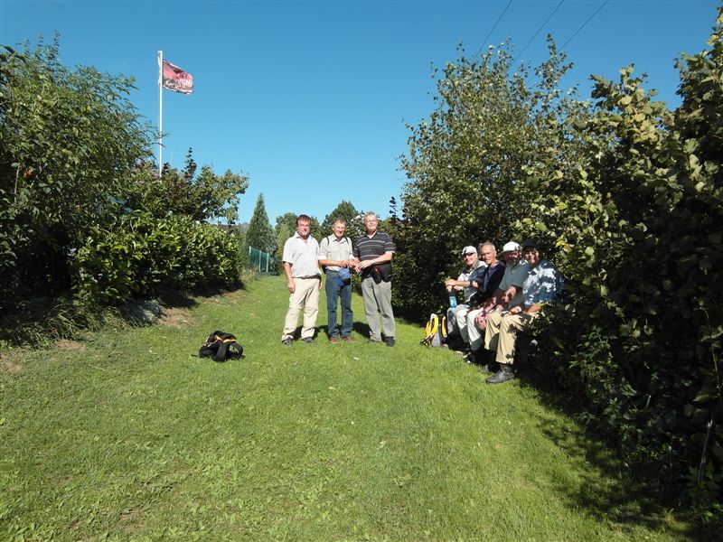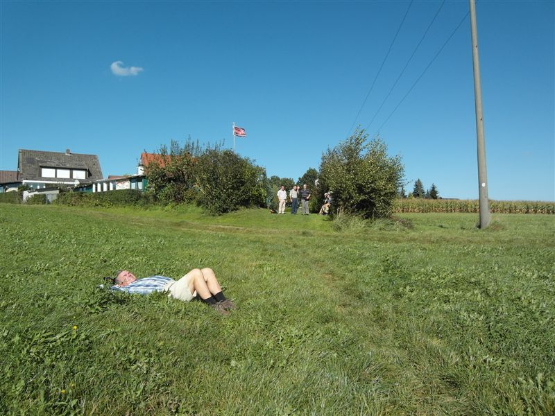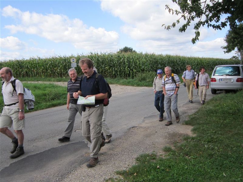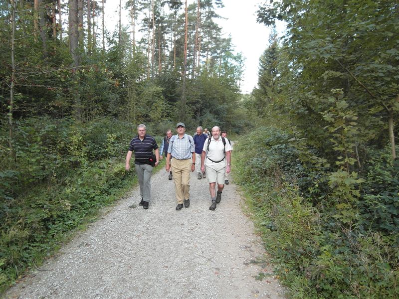 Wanderempfehlungen Teilnehmer: Achim H, Bruno, Clemens, Conni, Günter, Heinz, Klaus-Dieter, Peter, Udo und als Gäste: Inge und Jörg So könnte der Herbst weitermachen: Sonne pur und trotzdem nur 20° im Schatten - das ideale Wanderwetter Als treusorgender Ehemann hat Jörg sich heute seiner noch etwas gehändikäppten Inge angenommen und somit durfte Udo, spätestens nach dem zweiten Verhauer, die übliche, natürlich nur positive, Kritik und die motivierenden Anregungen aufnehmen. Allerdings mit ein klein wenig Berechtigung: denn er hat tatsächlich beim Herrmannswinkel den Blaukreis verloren und ist den schönen breiten Nordic-Walking-Weg weitergelaufen. Also, beim nächsten Mal Achtung: der Blaupunkt verlässt den Hauptweg plötzlich und ohne Vorankündigung! Wer's nicht merkt, der läuft die blaue "Vital Route" über den Reigelsberg südlich Richtung Nürnberg bis zur Vereinigung mit der roten "Aktiv Route" und von dort in spitzem Winkel auf der östlichen blauen "Vital Route" wieder zurück nach Norden bis zum Gelbkreuz - und hat dann ca. 1,5 km zusätzlich auf dem Tacho. Damit und mit einem kurzen Abstecher zu unserem "alten" Freund Hans Häpp in Eckenhaid, kamen wir am Ende auf genau 18 km. Wieder durchqueren wir den Ort und gehen Richtung Norden, nun mit Rotkreuz, zuerst wieder durch einen Wald, dann über eine Hochfläche mit Aussicht zum Moritzberg, Burg Hohenstein und zum Dillberg, nach Eckenheid (das ja jetzt Eckental heißt - so wie viele andere Orte auch, die früher alle eigene Namen hatten, und noch dazu so schöne wie z.B. Mausgesees) Im "früheren" Ekenhaid hat der freundliche griechische Wirt extra für uns geöffnet (sonst, außer Sonntag, erst ab 17:00 Uhr) und uns in seinem schönen Garten hervorragend bewirtet. Wir empfehlen ihn gern weiter. Für eventuelle Nachahmer: Restaurant Kavala, 09126-9119. ![]() Wir verließen Eckenhaid auf der Straße in südöstlicher Richtung nach Neunhof, gingen in die letzte Straße vor dem Ortsende ein paar Meter nach rechts und dort in einen Feldweg weiter südwestlich. Der Weg führte zu einem örtlichen Wanderweg "Rote 4", den wir am Waldrand fanden und nach rechts, nach Westen, in den Wald folgten. Ein sehr schöner Weg durch eine Schlucht, vorbei an einem lauten Steinbruch, zur Straße Neunhof - Eschenau (jetzt auch Eckental!!!). Hier wird aus der roten 4 eine 3. Dieser folgen wir, wieder auf einem sehr schönen Pfad durch einen Wald, vorbei an Obstwiesen und über Felder, mit Blick auf eine schöne Siedlung am Ortsrand von Eschenau, bis nach nach Kleingeschaidt. Kurz vor dem Ort treffen wir auf die Straße von Eschenau mit Blaustrich. Wir folgen jetzt Blaustrich in den Ort und und gehen dann nach links, Richtung Johannisthal. Auf Wunsch von Clemens gibt es hier eine kurze Rast - unter einer Clubfahne - bevor wir am Ortsende eine Wiese nach rechts überqueren und uns wieder im Wald befinden. Nun ist es nur noch ein kurzes Stück bis zu unserem Blaukreis, dem wir nach rechts, also nach Westen, bis zum Parkplatz folgen. |