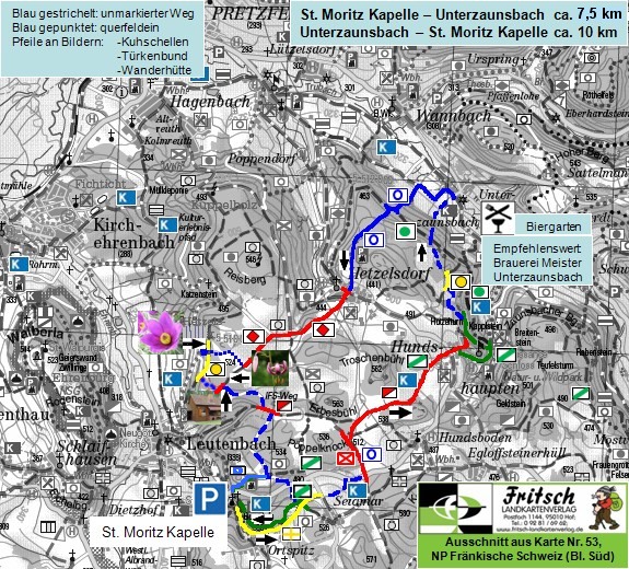 Höhen mit toller Aussicht, saftige Täler, angenehme Wald- und Feldwege, auch Steigungen, ca. 17 km |