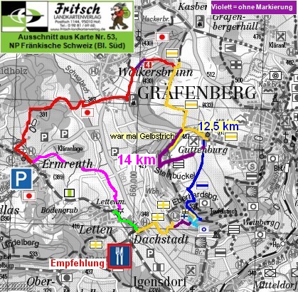 Wald, Felder und Wiesen und .... Kirschen, immer wieder Steigungen aber gute Wege, ca. 14 km, mehr als 3 Std. |