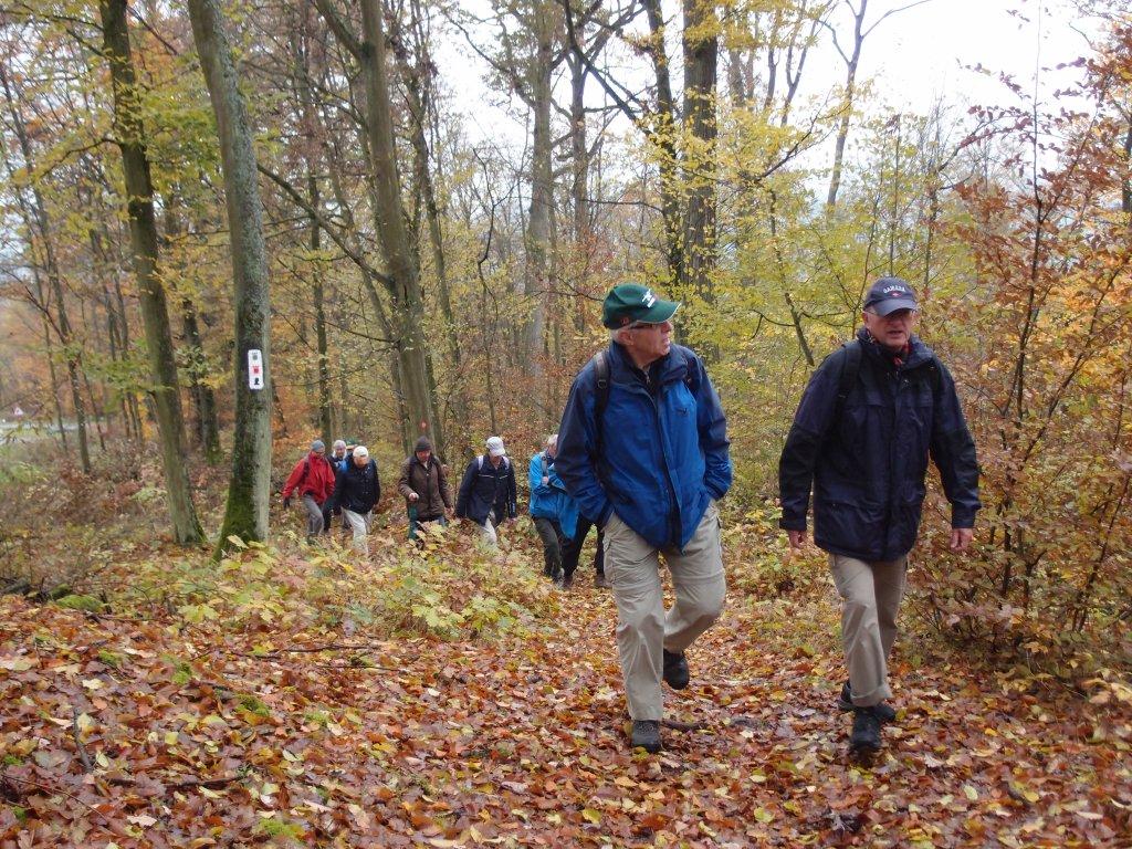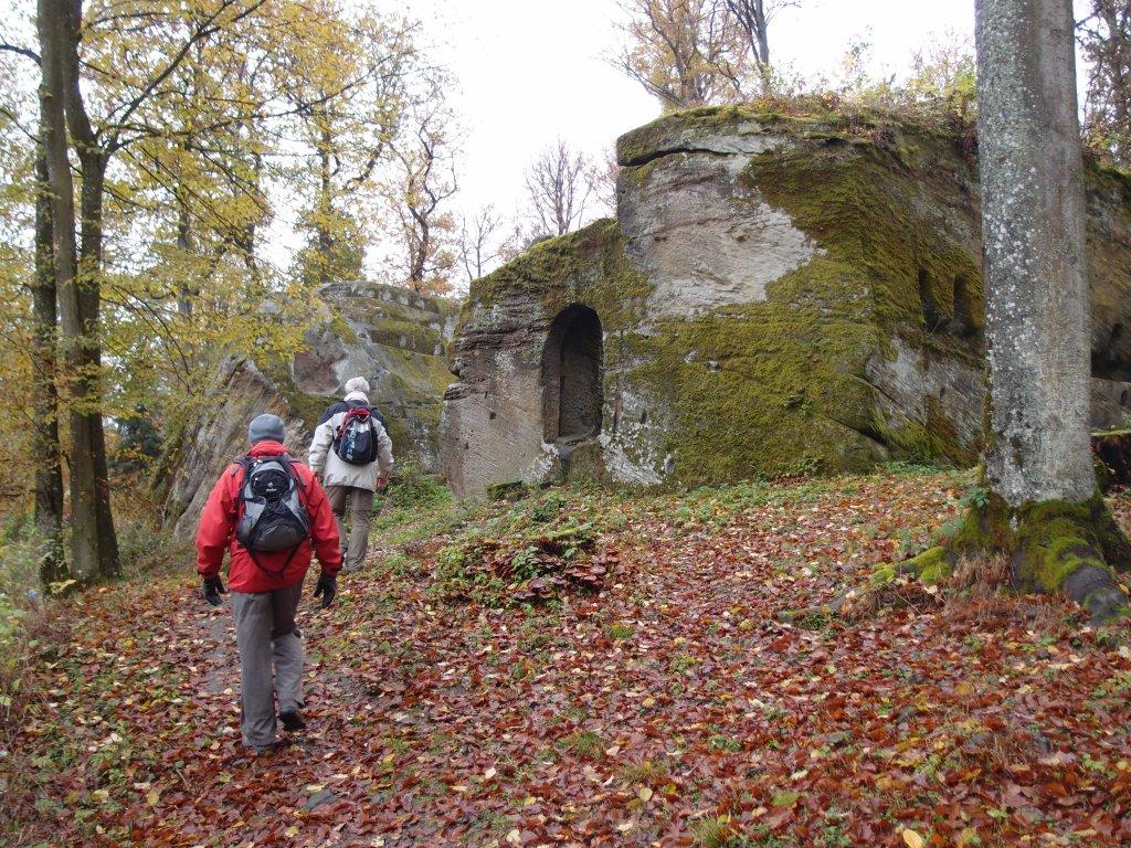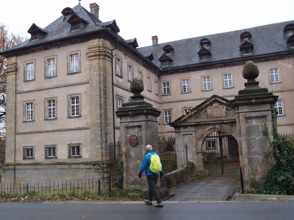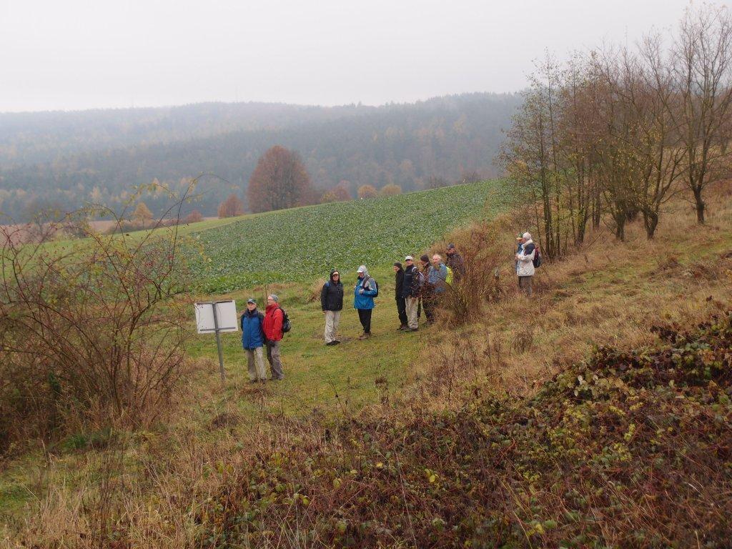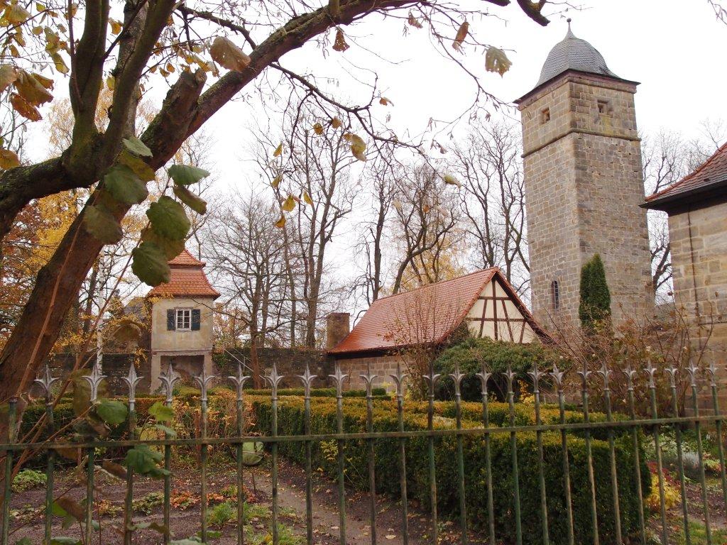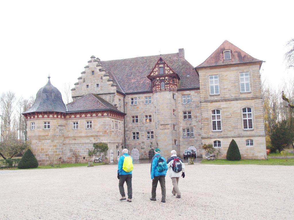 Elf ausgeschlafene Kerlchen trafen sich gerade noch rechtzeitig am Bahnhof, konnten schnell noch das Bayernticket lösen und schon kam der RE, der uns flugs nach Bamberg brachte. Ein schneller Umstieg in den Nahverkehr und nach einer knappen Stunde stiegen wir in Ebern, dem Startpunkt unserer heutigen Wanderung aus. Nur der sonst immer pünktliche Pierre war mit seiner Stahlkarosse noch nicht da. Wir warteten, hinterließen eine Nachricht und liefen langsam los. An den ehrwürdigen Türmen und den sauber restaurierten Stadthäusern vorbei zum Marktplatz, wo gerade der Neptunbrunnen dampfgestrahlt wurde. Ebern verfügt über sehr schöne Fachwerkhäuser und macht einen gediegenen Eindruck. Klar gingen wir noch in die Stadtkirche, bewunderten den Altar und die große neue Orgel, auf der der Organist gerade ein Musikstück einstudierte. Dann liefen wir weiter und fanden kurz darauf auch unser Peterle wieder. Nun war das Dutzend voll und wir gingen durch den frostigen Novembermorgen weiter zum Schloss Eyrichshof. Natürlich bewunderten wir es wieder einmal. Dann schnappten wir uns die „Friedrich-Rückert“ Markierung (es gibt hier auch noch andere Markierungen) und gingen erst einmal bergauf. Südlich konnten wir nun die |