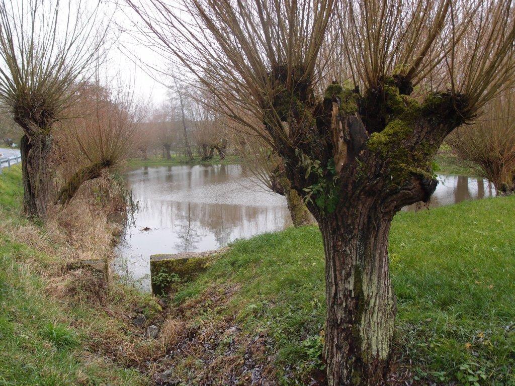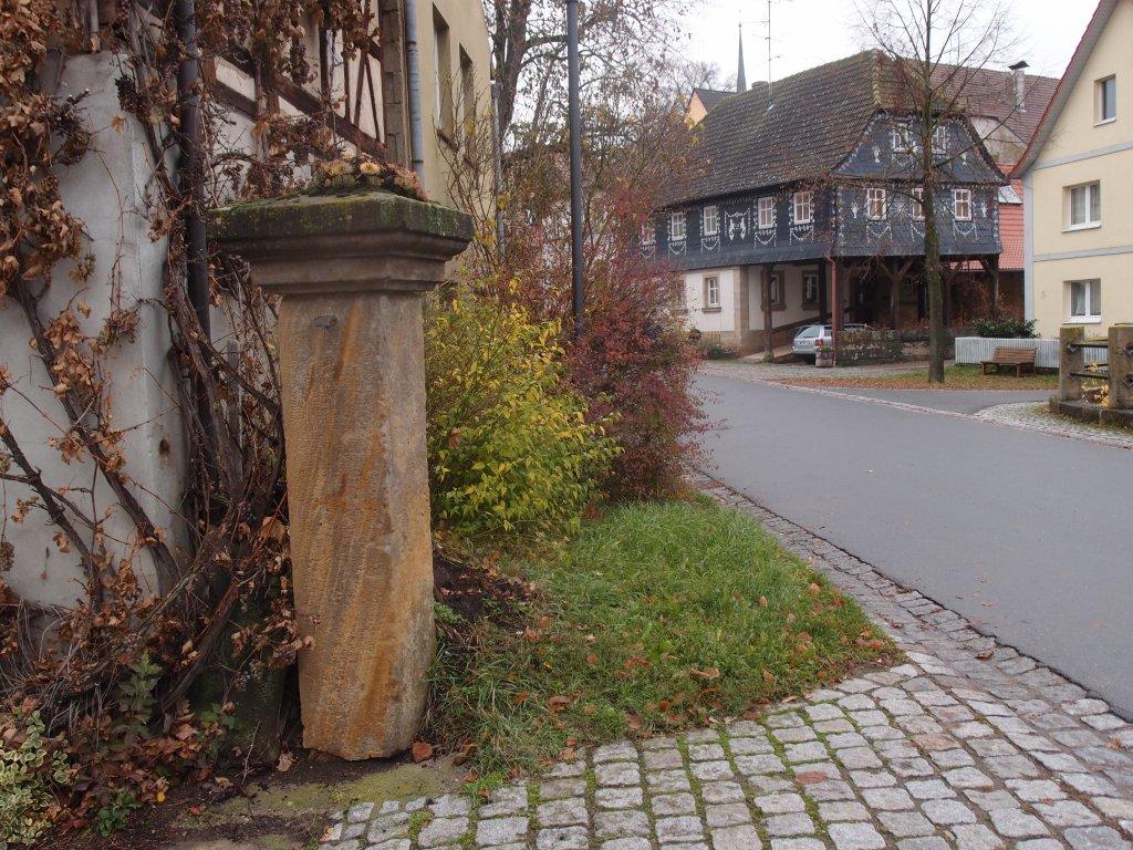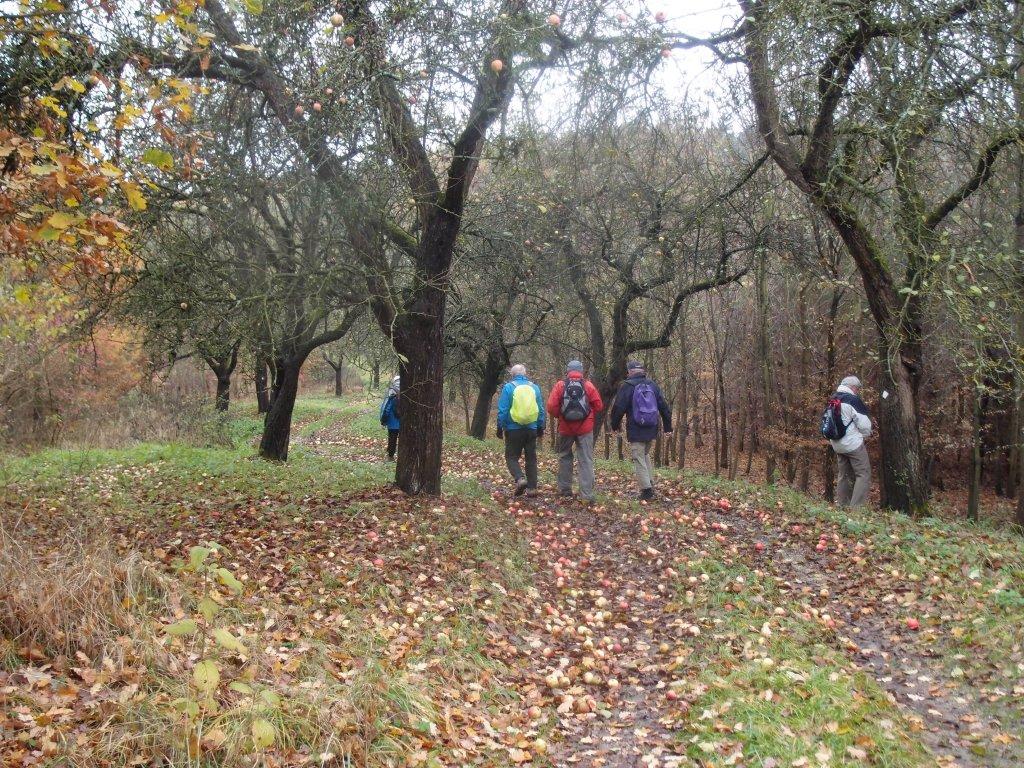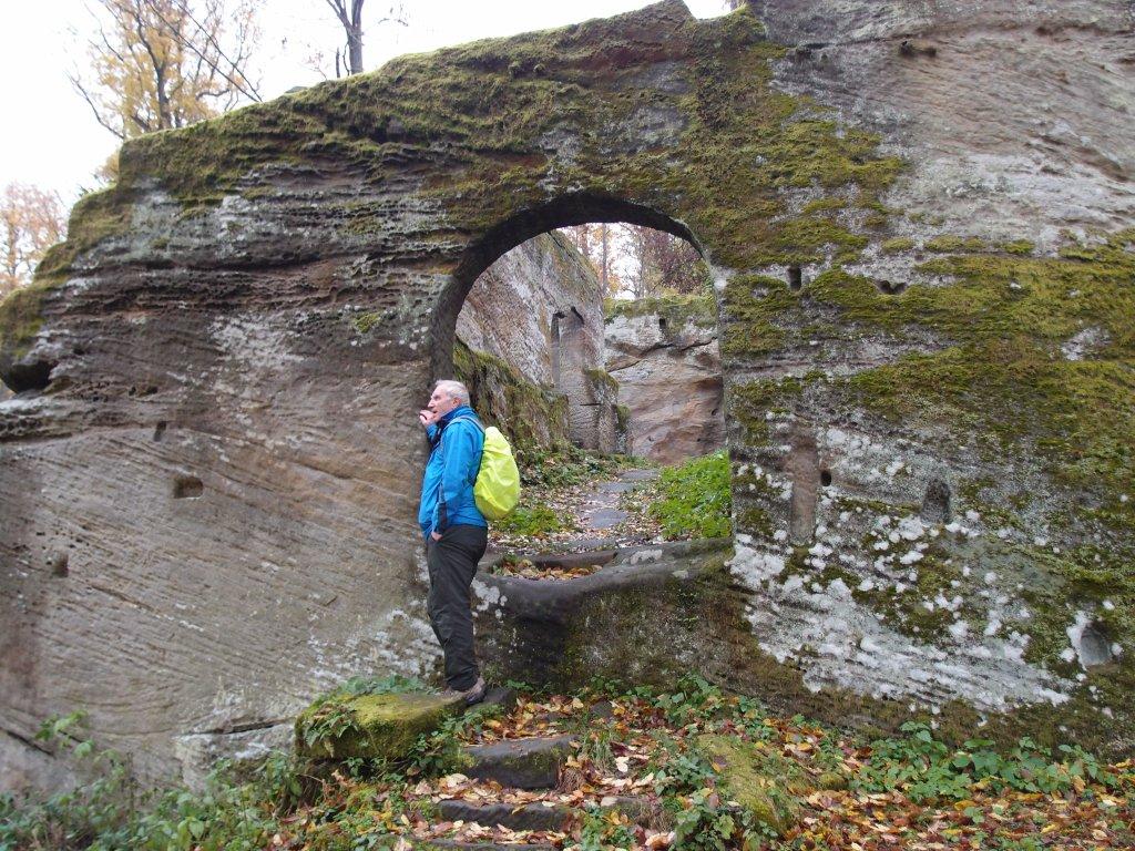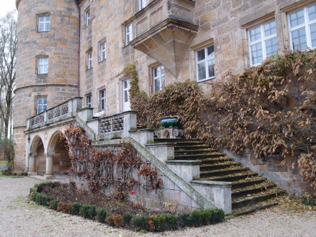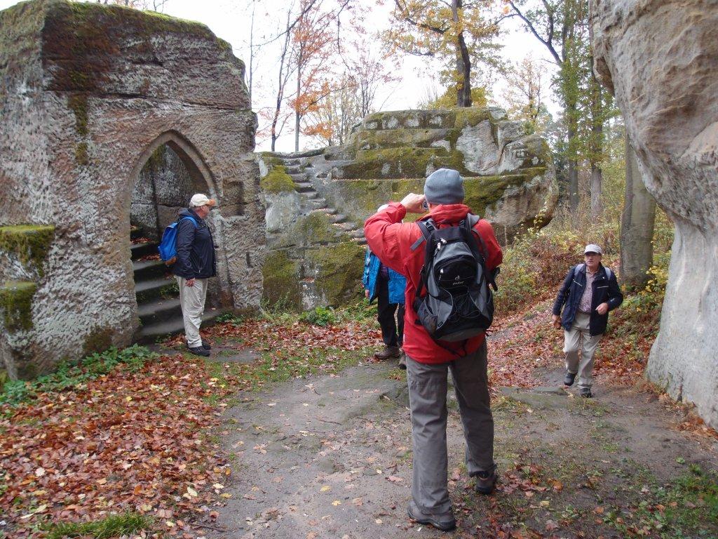 Elf ausgeschlafene Kerlchen trafen sich gerade noch rechtzeitig am Bahnhof, konnten schnell noch das Bayernticket lösen und schon kam der RE, der uns flugs nach Bamberg brachte. Ein schneller Umstieg in den Nahverkehr und nach einer knappen Stunde stiegen wir in Ebern, dem Startpunkt unserer heutigen Wanderung aus. Nur der sonst immer pünktliche Pierre war mit seiner Stahlkarosse noch nicht da. Wir warteten, hinterließen eine Nachricht und liefen langsam los. An den ehrwürdigen Türmen und den sauber restaurierten Stadthäusern vorbei zum Marktplatz, wo gerade der Neptunbrunnen dampfgestrahlt wurde. Ebern verfügt über sehr schöne Fachwerkhäuser und macht einen gediegenen Eindruck. Klar gingen wir noch in die Stadtkirche, bewunderten den Altar und die große neue Orgel, auf der der Organist gerade ein Musikstück einstudierte. Dann liefen wir weiter und fanden kurz darauf auch unser Peterle wieder. Nun war das Dutzend voll und wir gingen durch den frostigen Novembermorgen weiter zum Schloss Eyrichshof. Natürlich bewunderten wir es wieder einmal. Dann schnappten wir uns die „Friedrich-Rückert“ Markierung (es gibt hier auch noch andere Markierungen) und gingen erst einmal bergauf. Südlich konnten wir nun die |