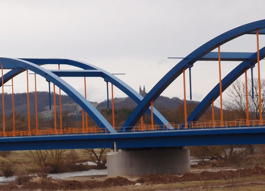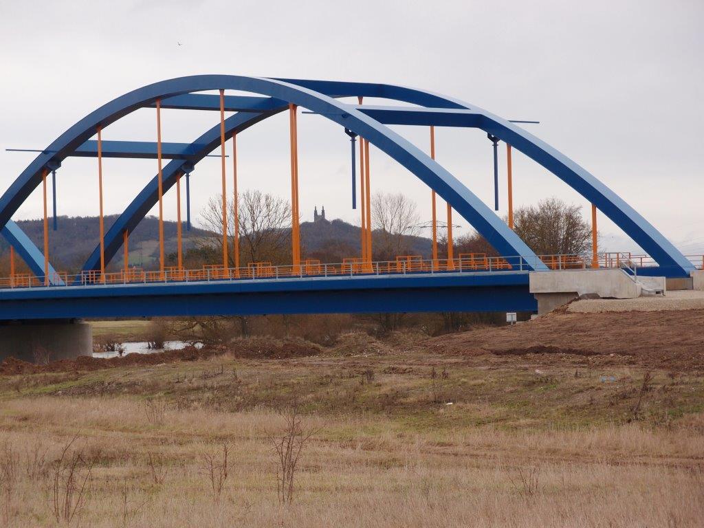 Brücke und ein Tunnel im Hintergrund. Am Wegrand standen einige neue