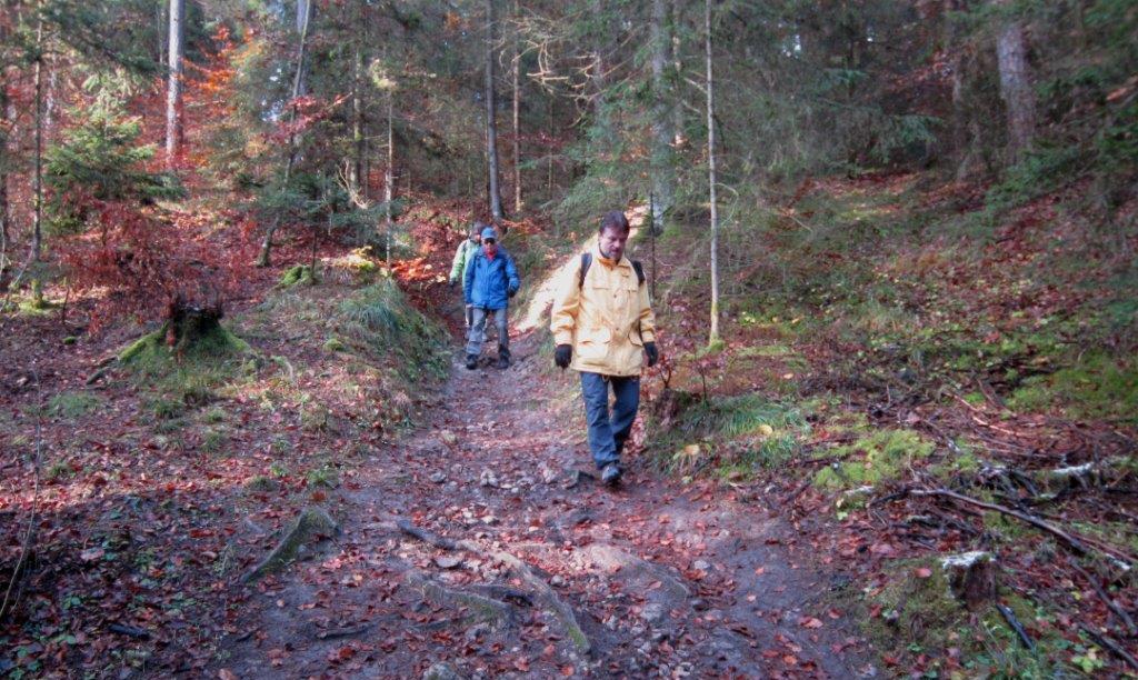 in den Wald und einen schmalen Pfad, dann steil