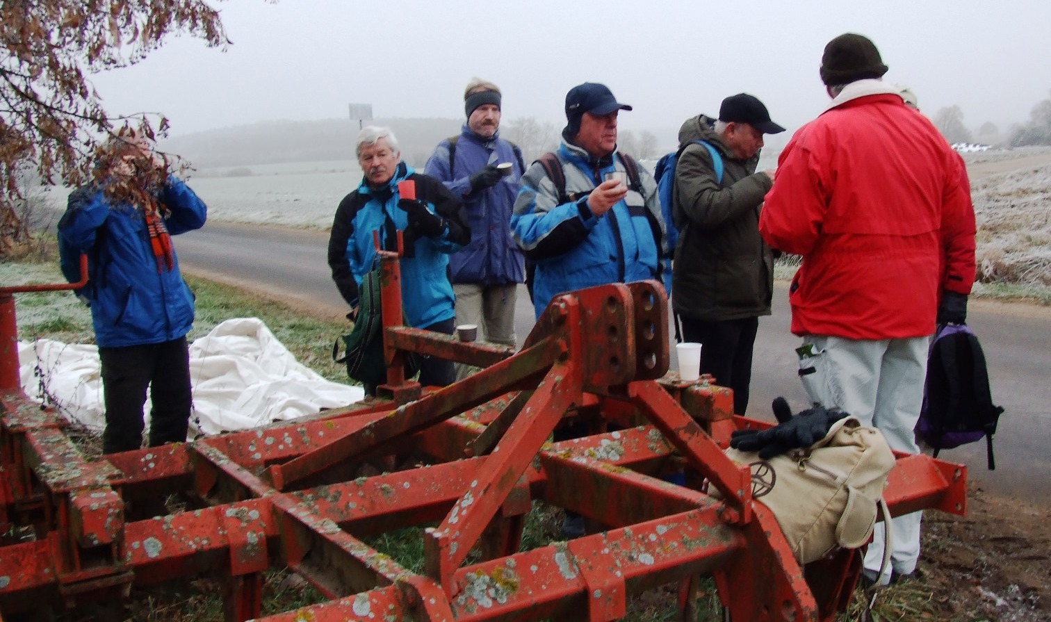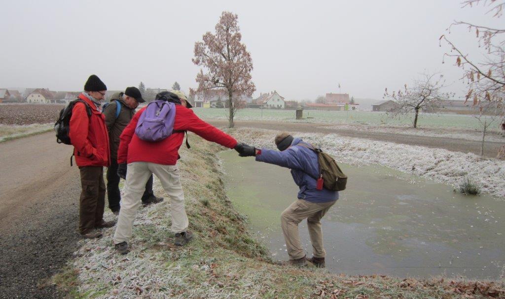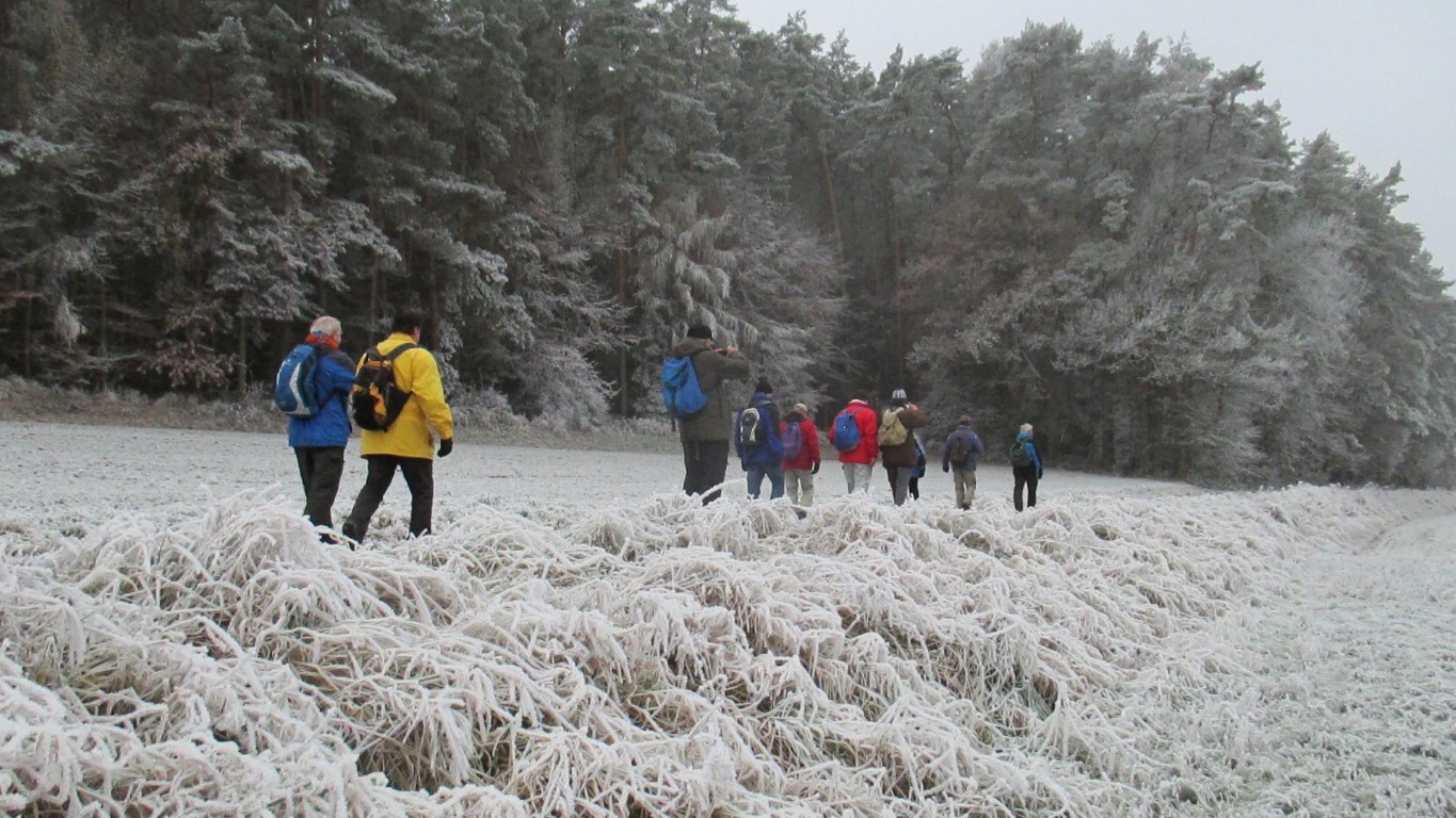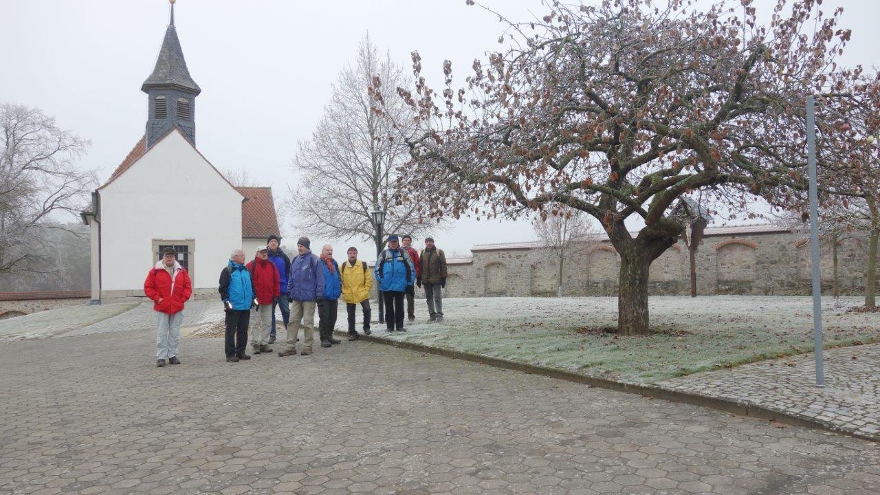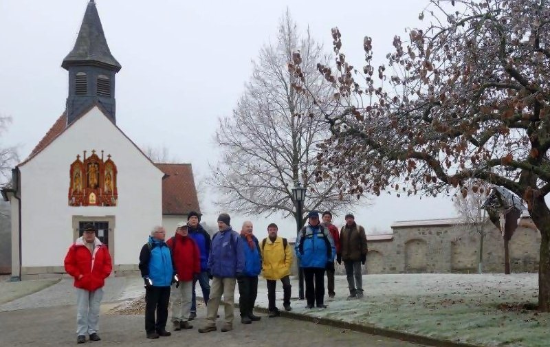 Wir trafen uns in Heßdorf am Supermarkt und fuhren von hier zur Antoniuskapelle (Bild) bei Sterpersdorf. Hier machten wir erst der kleinen Kapelle, umgeben von einer Mauer, unsere Aufwartung - das Lokal ist unter der Woche leider geschlosse. Dann machten wir uns auf unsere Socken, alle warm eingepackt denn es war bitterkalt und selbst im Aischgrund war rundum alles verreift.
