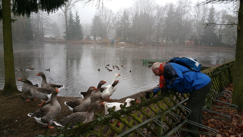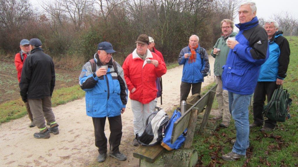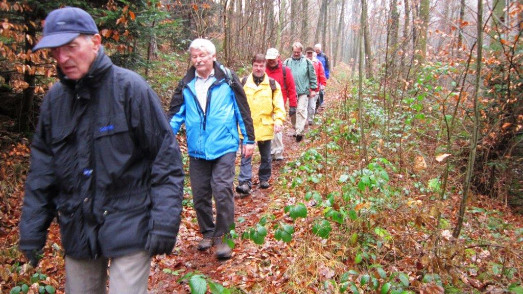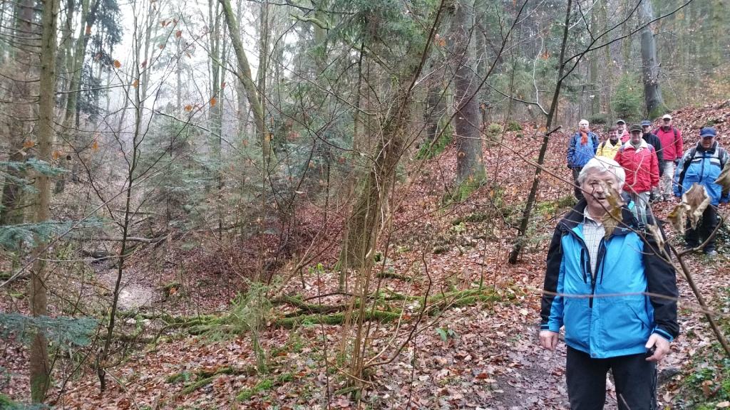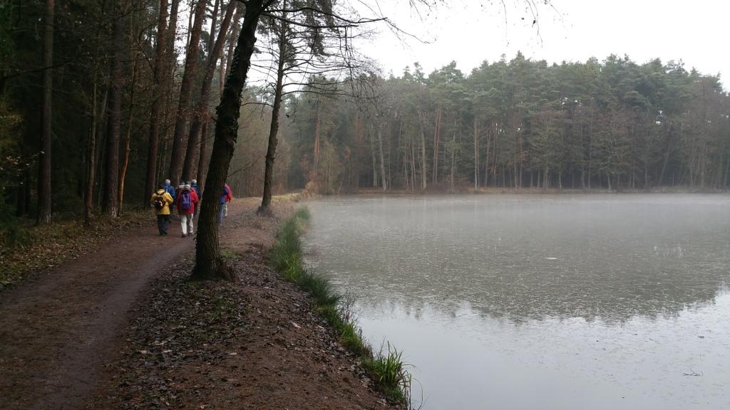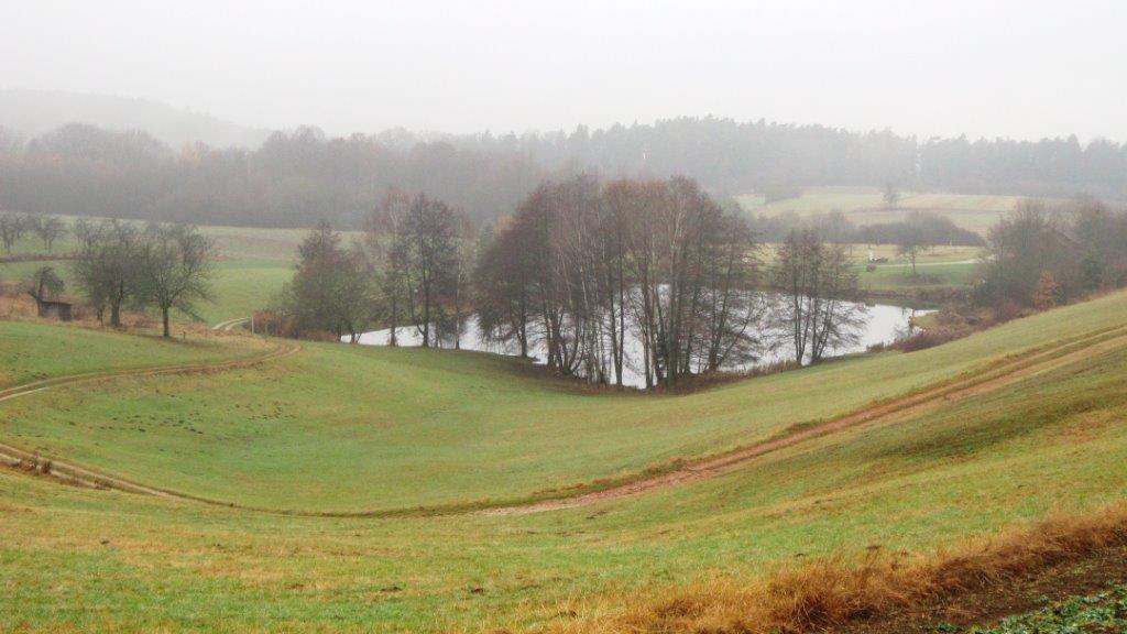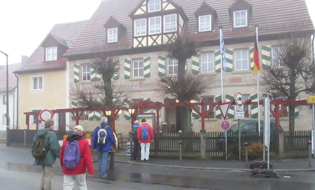 Frühjahr lohnt sich ein Besuch. Der Rotpunkt führt direkt über unseren Parkplatz und wir folgten ihm bis zum Kreuzweiher. Dort folgten wir der weißen 1 in rotem Rechteck südöstlich bis zur Straße Röckenhof - Oberschöllenbach, der wir auch bis zum Wald folgten. Von den beiden Wegen rechts, in östlicher Richtung, nahmen wir den linken, der uns wieder zur weiß/roten 1 bzw. dem RotRing brachte. Diesem folgten wir nun um einige Fischweiher herum auf schmalem Pfad Richtung Süden, an Röckenhof vorbei bis zur Bahnlinie; dieser folgten wir dann nach Westen bis nach Kalchreuth, zur Haupt- (=Heroldsberger-) Straße. Jetzt war es nur noch ein kurzes Stück bis zum VerkehrsKreisel und zum Gasthaus Drei Linden. Dort wurden wir, wie immer hervorragend, von einem bemerkenswert aufmerksamen Ober bewirtet. Renner waren Schlachtplatte und Knöchla. Obwohl drinnen viel gemütlicher als in der feuchten Dezemberluft, zog es uns bald wieder hinaus. Wir gingen nun ein Stück
