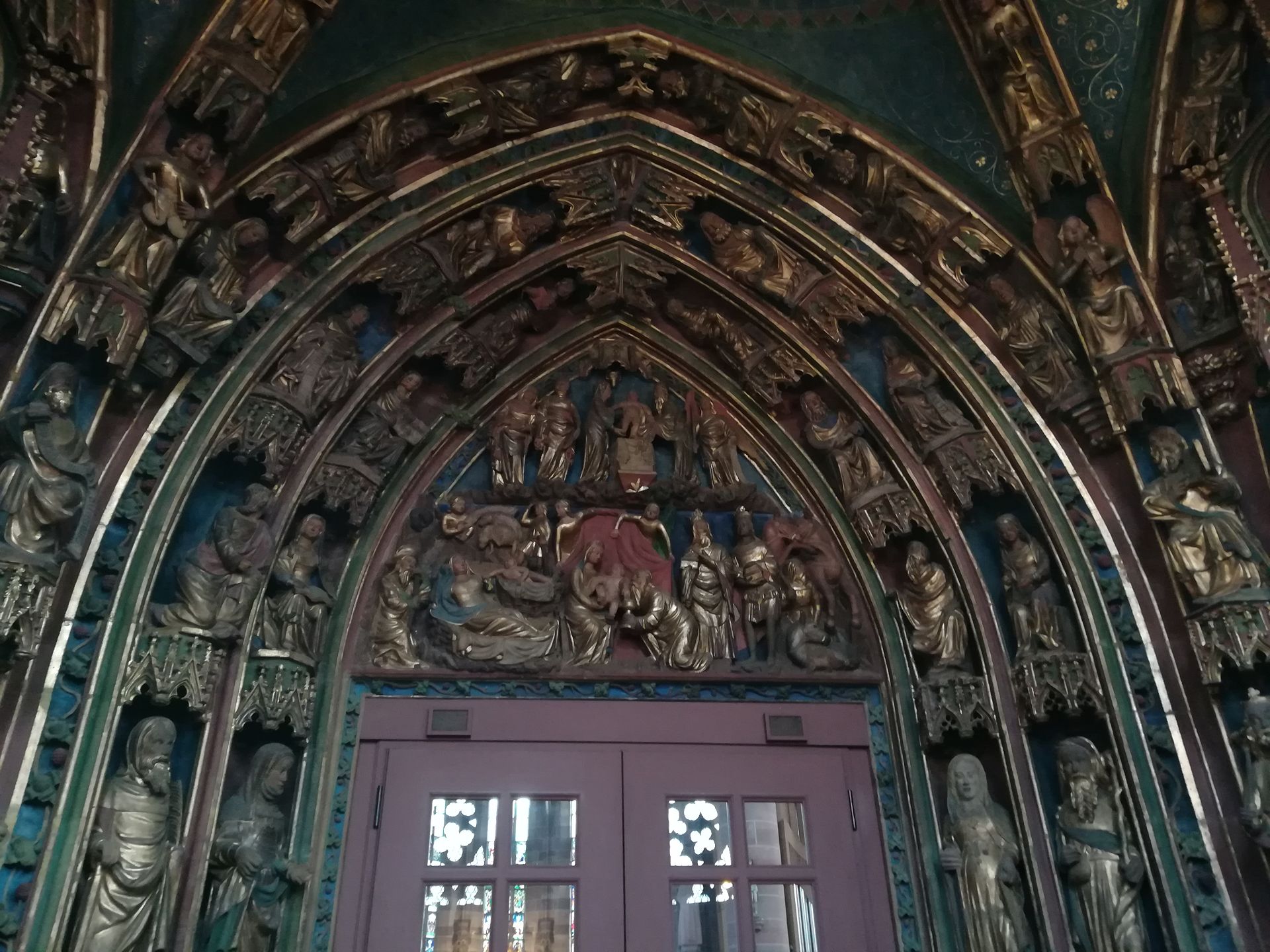 Frau Huck erläuterte auch die Bedeutung der Frauenkirche als Verehrungsort der Reliquien und erklärte die Darstellungen im Bogenfeld über dem Innenportal. Dort sieht man Maria im Wochenbett, die Geburt Jesu mit der Verkündigung des Engels an die Hirten, die 3 Weisen aus dem Morgenland und Jesus im Tempel. Wie oft bei solchen Darstellungen wurde auch Bezug genommen auf die Stifter; so war wohl der Beweggrund für das erste Motiv, dass Anna von Schweidnitz, die 3. Frau Karls, zu dieser Zeit auch gerade im Wochenbett lag.