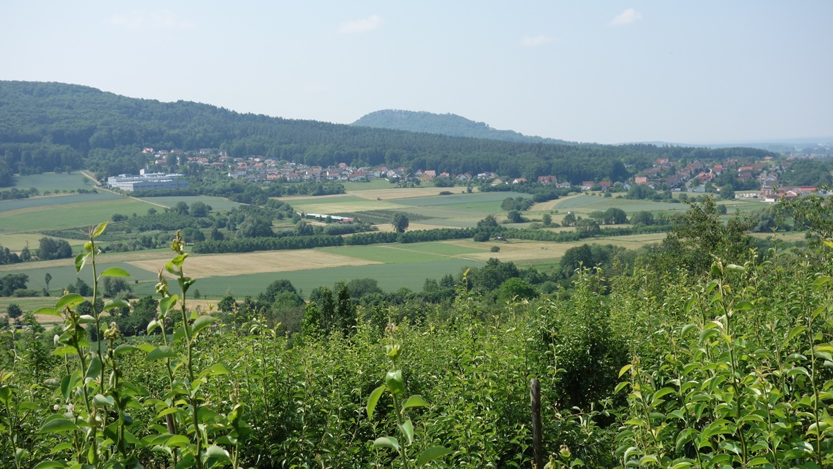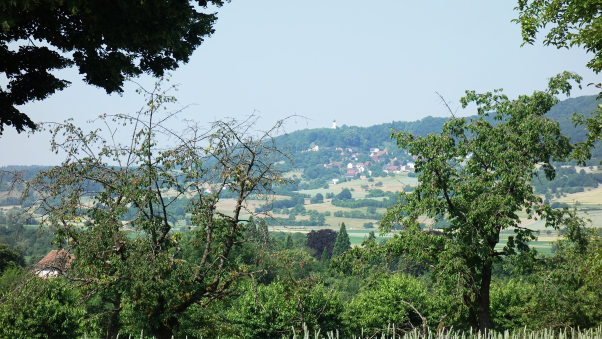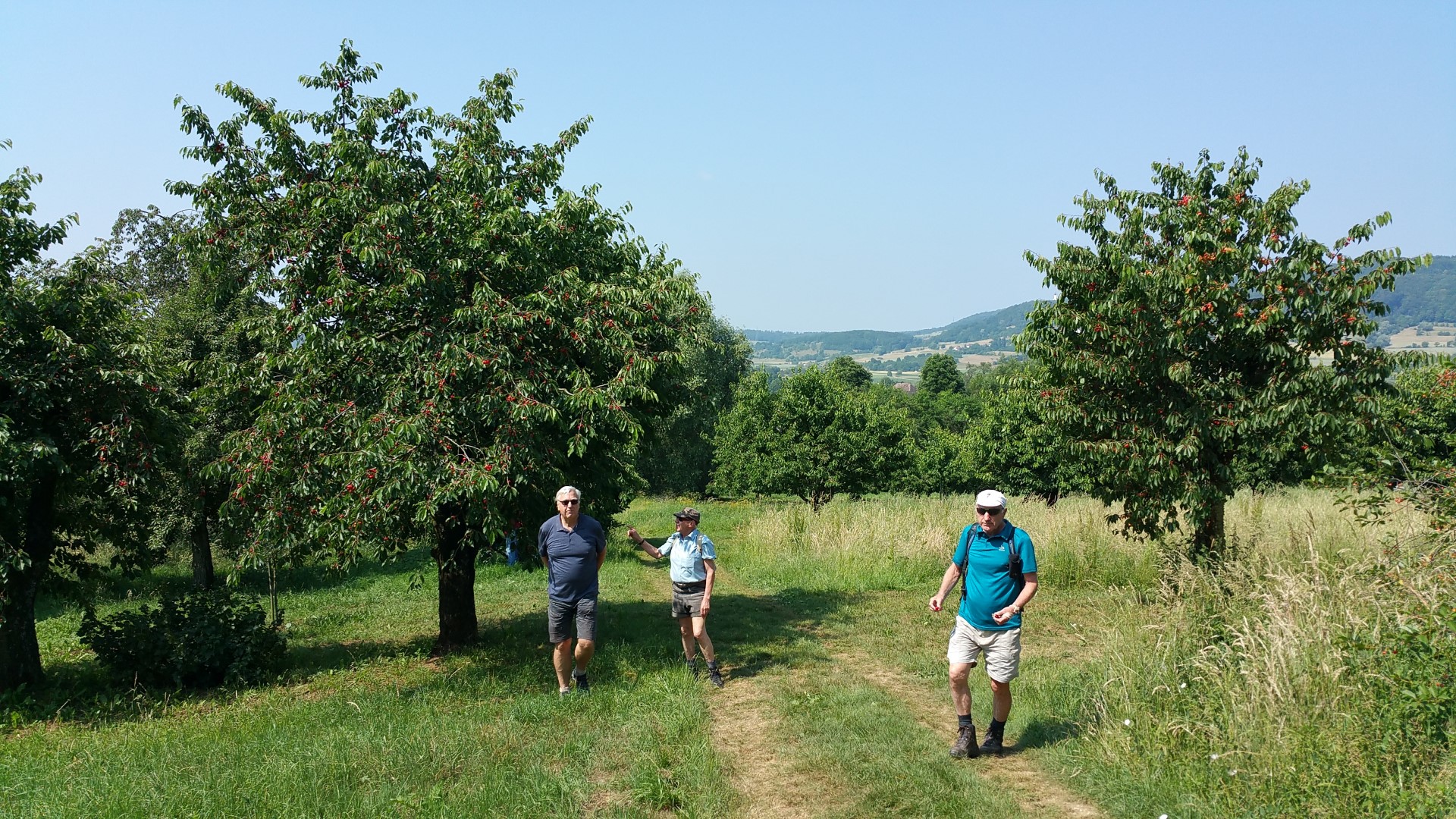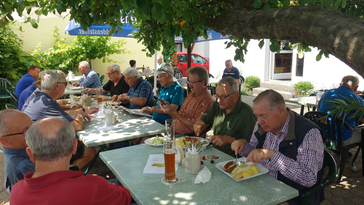 Über Forchheim ging's mit sieben Sockies per Bahn bis Pretzfeld. Von da an leicht ansteigend auf halber Höhe des Judenbergs unterhalb des Waldrands durch ausgedehnte Kirschplantagen. Da gab es manch pralles, rotes Früchtchen zu probieren und zugleich die schöne Aussicht auf das Trubachtal und das gegenüber liegende Walberla zu genießen. In Hagenbach im Garten des Gasthauses "Richter" saßen bereits Henry, Achim, Clemens sowie Peter - die alle mit dem Auto gekommen waren - beim Bier und Essen im Halbschatten unter einem breit ausladenden Apfelbaum. Henry spendierte zu seinem Geburtstag alle anfallenden Getränke - nochmals herzlichen Dank. Nach einer halben