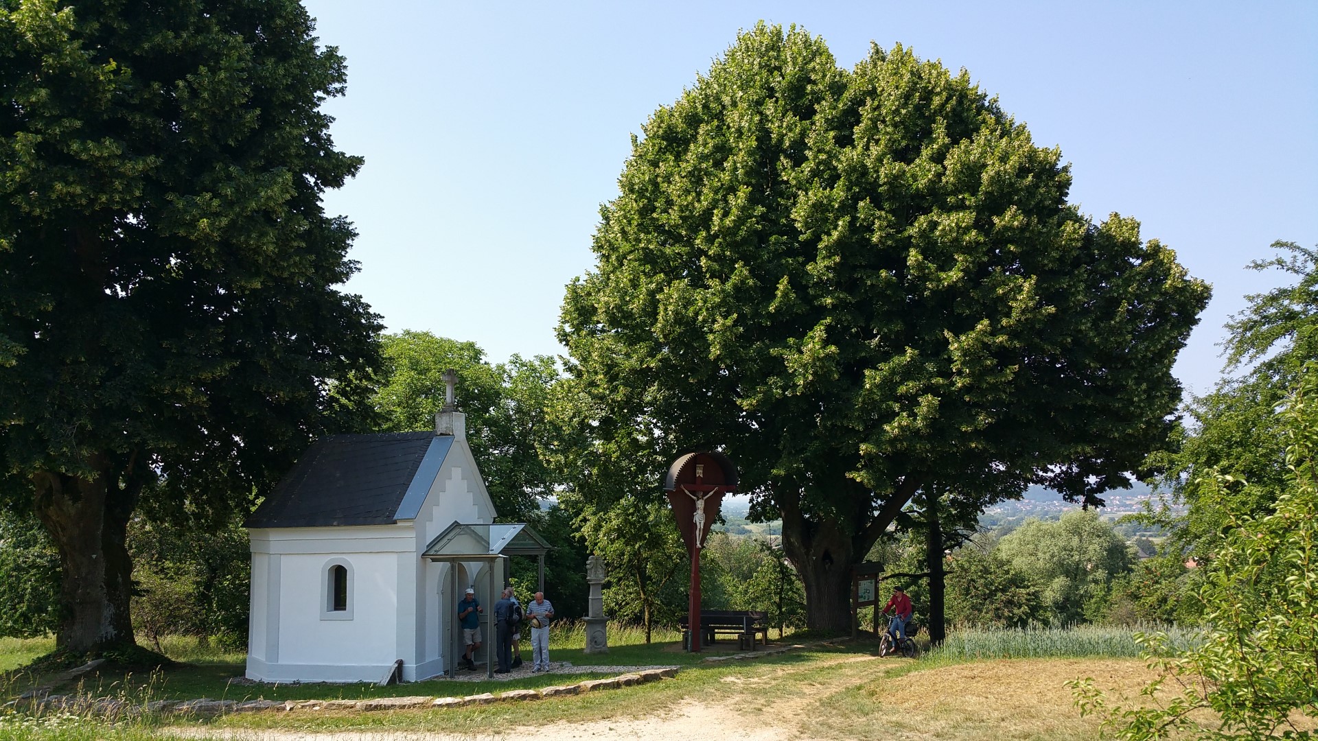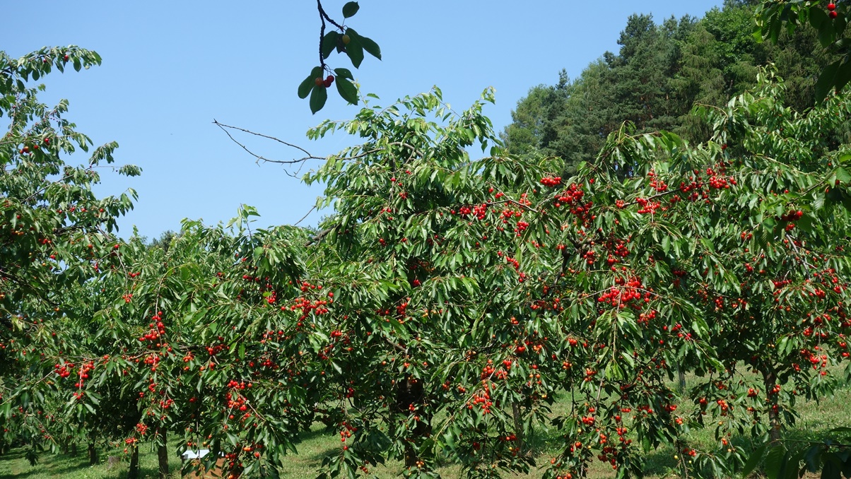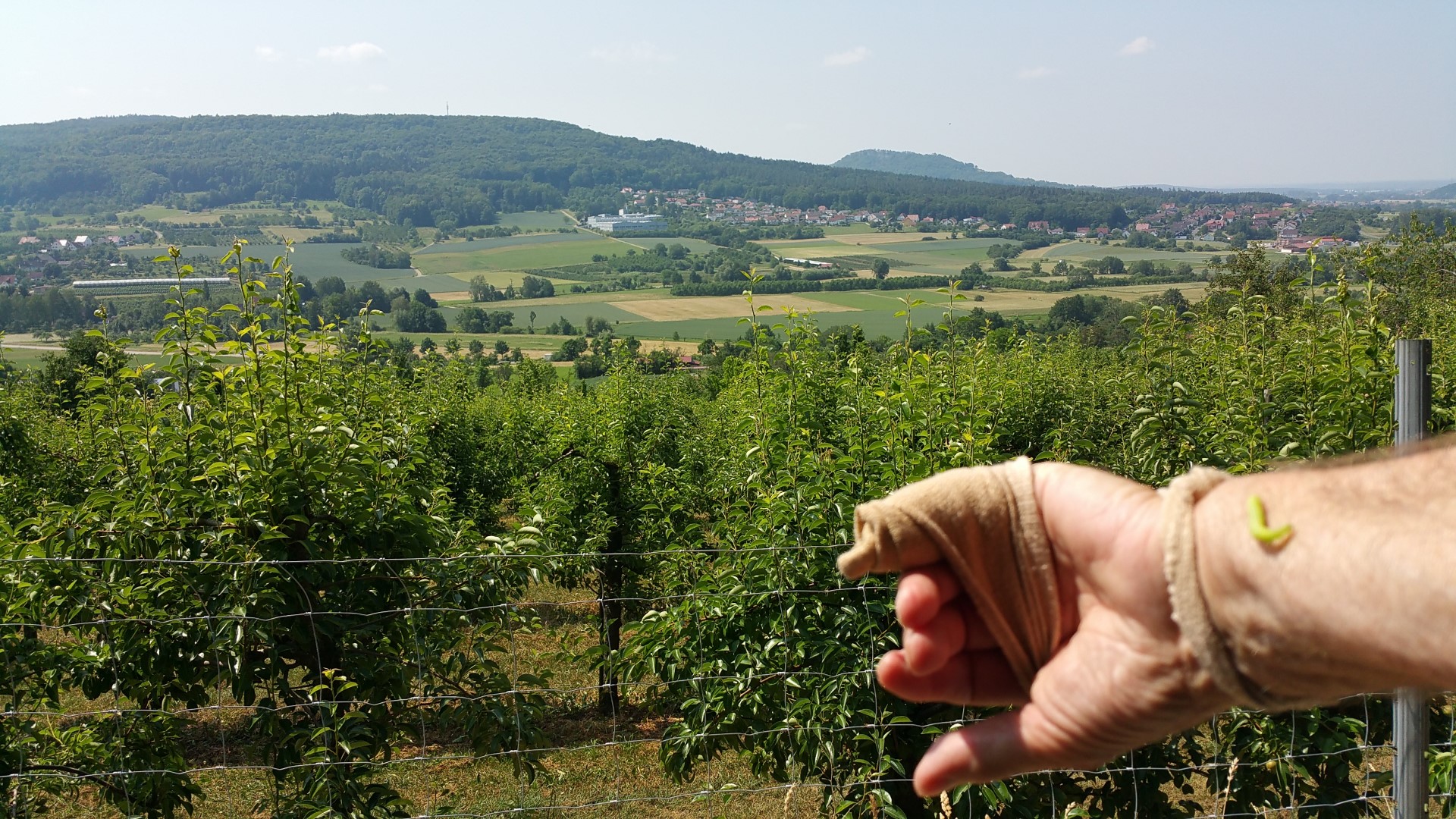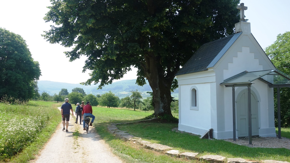 Über Forchheim ging's mit sieben Sockies per Bahn bis Pretzfeld. Von da an leicht ansteigend auf halber Höhe des Judenbergs unterhalb des Waldrands durch ausgedehnte Kirschplantagen. Da gab es manch pralles, rotes Früchtchen zu probieren und zugleich die schöne Aussicht auf das Trubachtal und das gegenüber liegende Walberla zu genießen. In Hagenbach im Garten des Gasthauses "Richter" saßen bereits Henry, Achim, Clemens sowie Peter - die alle mit dem Auto gekommen waren - beim Bier und Essen im Halbschatten unter einem breit ausladenden Apfelbaum. Henry spendierte zu seinem Geburtstag alle anfallenden Getränke - nochmals herzlichen Dank. Nach einer halben