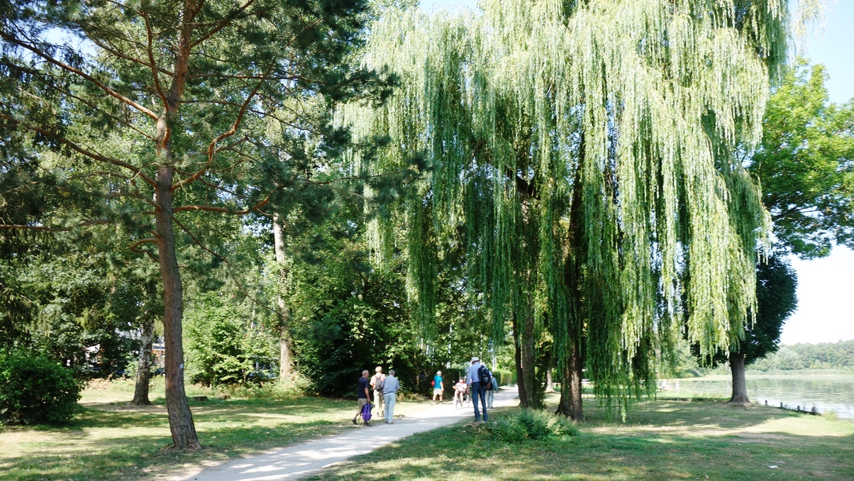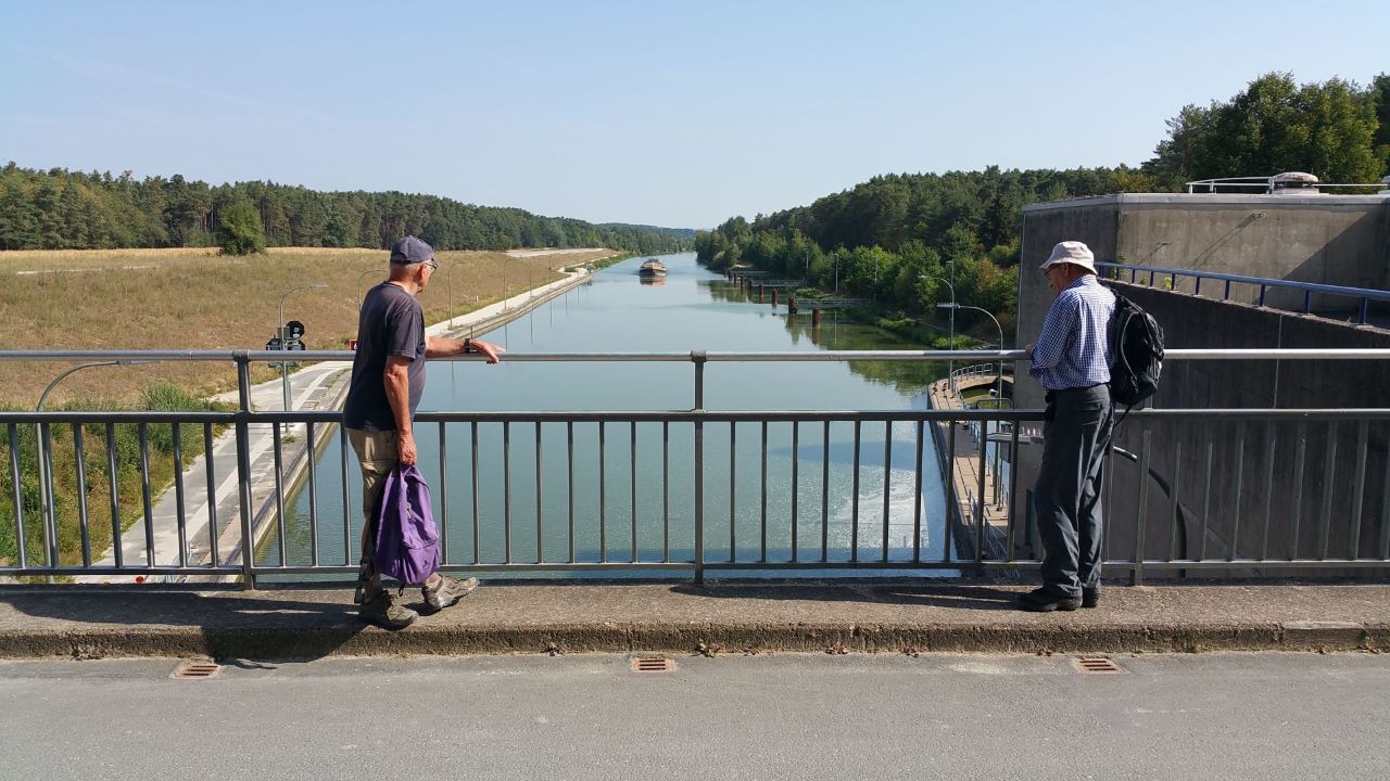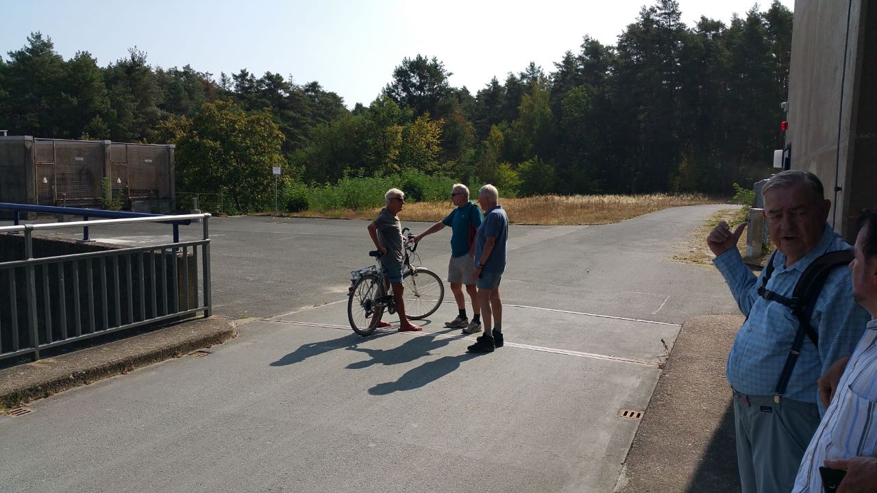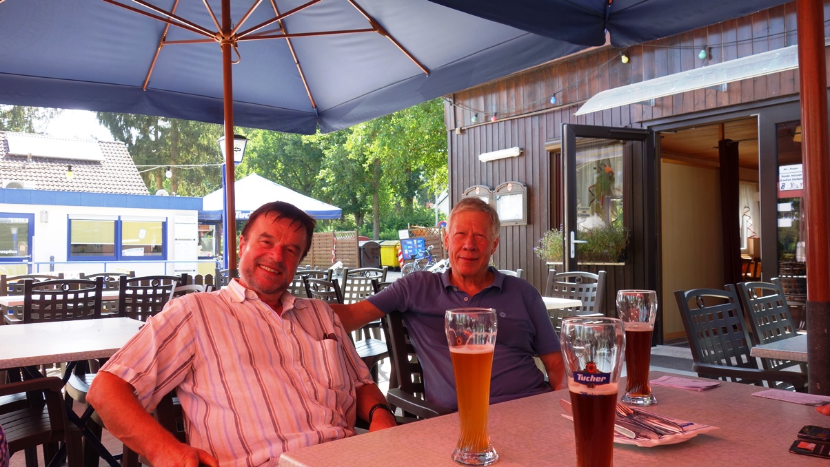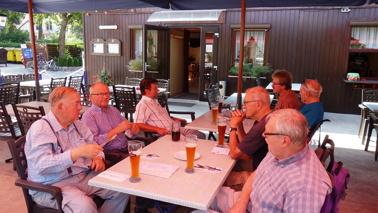 Querung anboten. Nun ging es noch gut einen Kilometer am Ufer des mit Grünalgen bedeckten Weihers entlang, bis wir schließlich kurz vor 12 Uhr den Campingplatz “Rangau“ erreichten. Auf der Terrasse gruppierten wir uns unter großen, schattenspendenden Marktschirmen zu einer gemütlichen Runde. Die erste selbigen Namens spendierte dann Günter zu seinem Geburtstag – immer wieder eine schöne Geste bei den Sockenqualmern! Zurück ging es wieder über die Heusteg-Brücke, jetzt aber schon in Dechsendorf südlich, vorbei an den Villen der Reichen und Schönen? dann ein Stück quer durch den Wald, dann direkt am Seebach entlang - ein viel schönererer, schattiger Pfad.