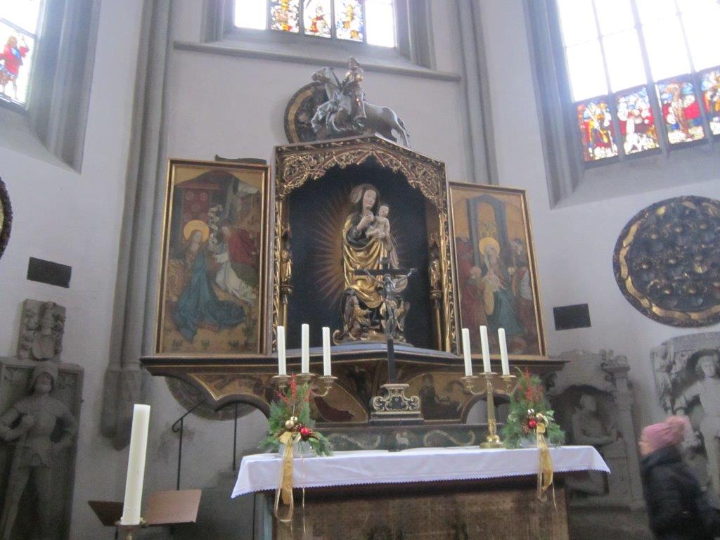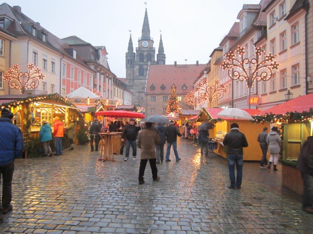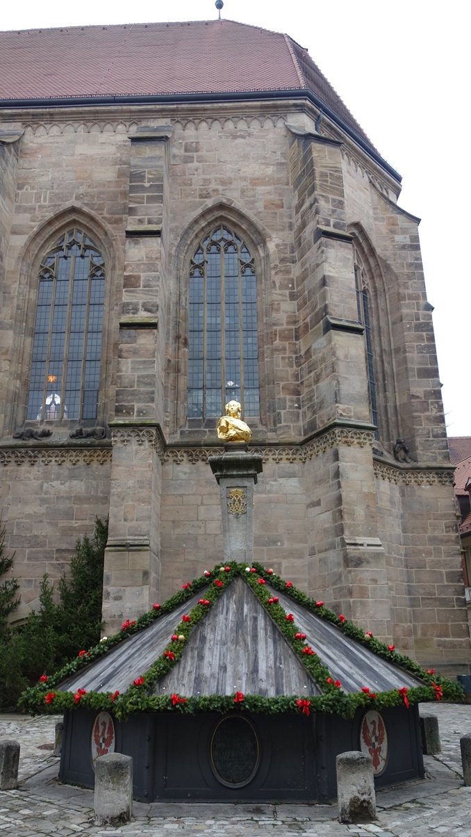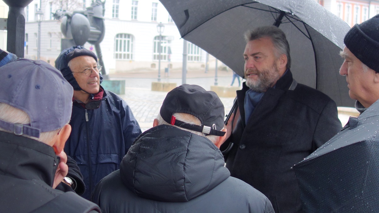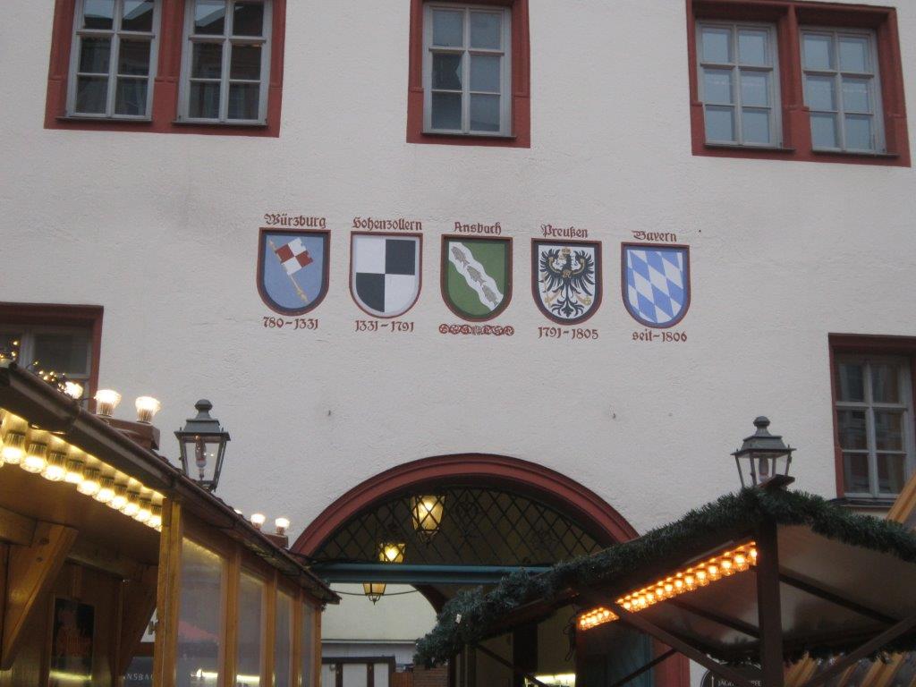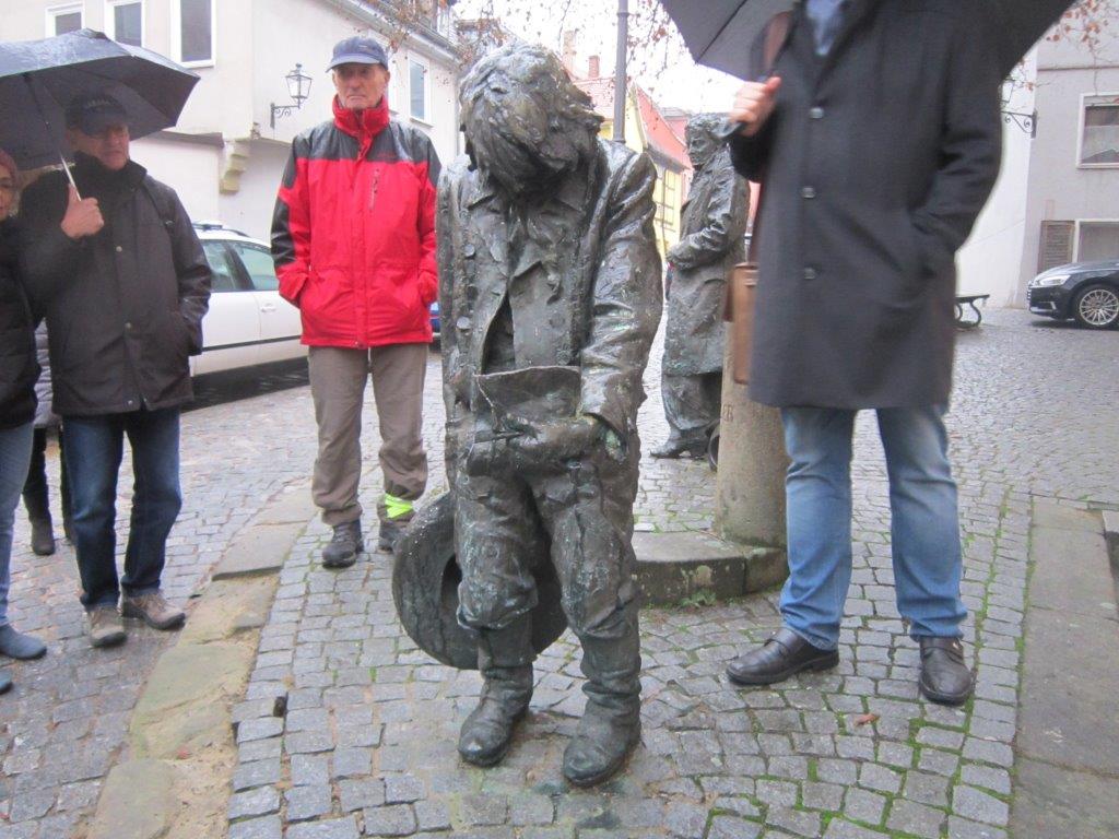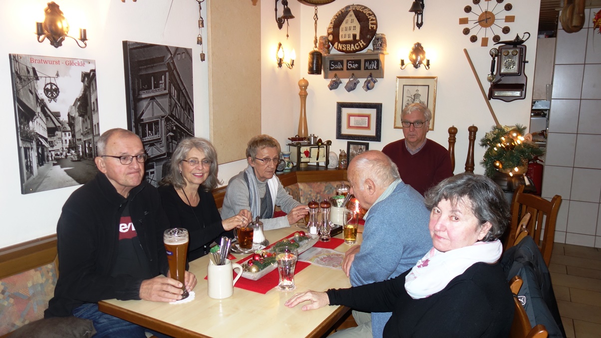 Weihnachtsmarktes. Um 10 Uhr starteten 15 Sockies und Sockinnen vom Erlanger Hbf mit einem RE. In Fürth stieg Günter zu und in Nürnberg erwartete uns Willi bereits am Bahnsteig. Weiter ging’s wiederum im RE nach Ansbach, wo wir nach 11 Uhr ankamen. Nach kurzem Marsch in die Stadt war Programmpunkt 1: Mittagessen. Im gemütlichen “Bratwurst Glöckle“ mit seiner tief gezogenen Decke und den Teelichtern auf den Tischen ließen wir uns die bereits vorbestellten Gerichte schmecken, dazu u.a. ein frisches Helles vom Fass. Pünktlich um 13:30 trafen wir uns dann vor der beeindruckenden Residenz zu einer Führung: Auszüge aus/ Vorlage: Wikipedia: Im Jahre 748 wurde im Mündungswinkel des Onoldsbaches zur Rezat vom fränkischen Edelfreien Gumbert ein Benediktinerkloster gegründet; vom heute meist Onolzbach geschriebenen Rezatzufluss ist der spätere Name Ansbach abgeleitet. In den folgenden Jahrhunderten wuchsen das Kloster und die daneben liegende Siedlung zu einer Stadt zusammen. 1139 wird erstmals die Stadtkirche St. Johannis urkundlich erwähnt. 1221 wurde der Ort das erste Mal als Stadt erwähnt. In den Jahren zwischen 1144 und 1157 wurden die Herren von Schalkhausen und Dornberg, erstmals erwähnt am 18. Oktober 1144 in einer Urkunde von Bischofs Embrico von Würzburg als Geschlecht namens „Scalchusen“, von den Bischöfen von Würzburg mit der erblichen Vogtei über Kloster und Stadt Ansbach sowie das ganze Umland inklusive Liegenschaften belehnt. Die Sitze des Adelsgeschlechts waren die Burgen Schalkhausen und Dornberg. Das Wappen von Schalkhausen erinnert an die frühere Herrschaft und auch die Form des Ansbacher Stadtwappens wurde an das Wappen der Dornberg angelehnt. Nach dem Aussterben der männlichen Linie der Dornberg im Jahr 1288 endete die Schirmvogtei und Ansbach kam auf dem Erbwege an Ludwig von Oettingen, der mit einer Tochter von Wolfram von Dornberg verheiratet war. 1331 verkaufte Ludwig von Oettingen diesen Besitz an Friedrich IV., dem damaligen Burggrafen von Nürnberg. Ab 1385 (bis 1791) war Ansbach die Haupt- und Residenzstadt verschiedener Zollerscher Herrschaftsbereiche. Als die Hohenzollern 1415 (unter Friedrich I.) zu Kurfürsten von Brandenburg aufstiegen, wurde Ansbach nicht mit Brandenburg vereinigt, sondern blieb als Brandenburg-Ansbach unabhängig. Nach Daten der Gesellschaft für Leprakunde ist in Ansbach seit 1342 ein mittelalterliches Leprosorium nachweisbar, das sich nordöstlich der Stadt im "Wolfstal" befand. Es wurde als "Feldsiechenspital" und "Siechenhaus" bezeichnet. Herr Engerer brachte weitere interessante Aspekte aus der Reformationszeit über die napoleonische Epoche bis zur Gründung des Königreichs Bayern. Dann folgte eine Führung durch den Innenhof der Residenz, einem beeindruckenden Bauwerk für so ein relativ kleines Fürstentum, In der evangelischen Kirche St. Georg, die wir danach betraten, befinden sich in der “Schwanenkapelle“ viele gesammelte Gegenstände des Mittelalters. Wir kamen nun in die Markgrafen-Gruft. Dieser Raum diente noch vor kurzem als Lagerstätte von Fleisch für die hiesigen Metzger, heute aber stehen hier Särge – zwei davon sehr prunkvoll gestaltet - der ehemaligen Markgrafen. Unser Stadtführer erzählte einige Anekdoten über den sogenannten “Wilden Markgraf“, der hier ebenfalls zur Ruhe kam – ein begeisterter Falkner und Frauenheld. Danach besuchten wir St. Hubertus, eine Kirche, dessen romanischer Mittelteil von diesem Markgrafen durch ein Barockgebäude ersetzt wurde. In dem schlichten, großen Kirchenschiff – ganz im Sinne der Reformation - befand sich eine beeindruckende Orgel. Der Raum war zu damaliger Zeit unbeheizt, und bei den niedrigen Temperaturen in dieser Epoche erwärmte sich das Gesinde der Markgrafen im Quergang (“Schnapsloch“) innerlich mit Hochprozentigem. Vor dem alten Rathaus erklärte uns Hr. Engerer die Wappen an der Fassade, insbesondere dasjenige mit den Fischen, die gegen die Strömung der angedeuteten Fränkischen Rezat schwimmen: „Überall auf der Welt geht’s den Bach runter, nur in Ansbach geht’s rauf!“, pflegen hier die Einheimischen zu sagen. In der verwinkelten Altstadt mit ihren Gassen, kamen sie nun in die Utz-Straße, benannt nach Johann Peter Utz, wo der Führer ein freches, frivoles aber romantisches Liebesgedicht dieses Poeten vortrug. Zum Abschluss gab es noch den Besuch in der nicht mehr benutzten Synagoge. Vor dem 2. Weltkrieg wohnten in Ansbach noch fast 400 Juden, der Raum wurde von den Nazis geplündert, das Gebäude aber nicht zerstört. Beim Gottesdienst saßen die Frauen oben auf einer Empore und blickten nach Osten auf die Wand mit der “Heiligen Lade“ und dem Tora-Schrein. Darüber befinden sich zwei kleine “Misrach“-Fenster (Misrach = Osten), die den Blick nach Jerusalem ermöglichen sollen. Mittig im Raum steht auf einem Podest das säulenumgebene Lesepult (“Bima“) für die Predigt des Rabbiners. Nach dieser gut 2-stündigen Führung - meist im Nieselrehgen – meldete sich bei allen der Durst. Am weitläufigen Weihnachtsmarkt gönnte man sich unter einem schützenden Holzdach an einem der Glühweinstände ein heißes Getränk, zu dem wir auch unseren Stadtführer einluden, dazu schmeckte eine würzige “Ansbacher Bratwurst“. Hier gab‘s im Gegensatz zu Erlangen sogar einen Glühwein Rosé. Kurz vor 5 Uhr traten wir wieder die Rückfahrt an. Gegen 18 Uhr kamen wir wieder in Erlangen an.