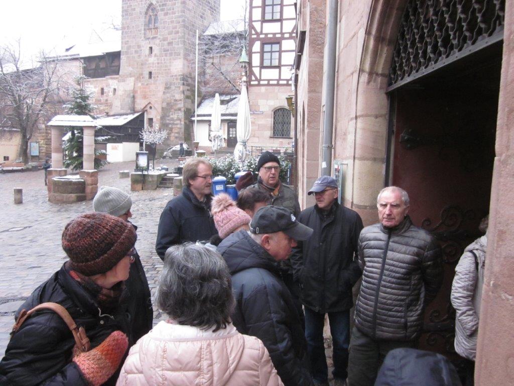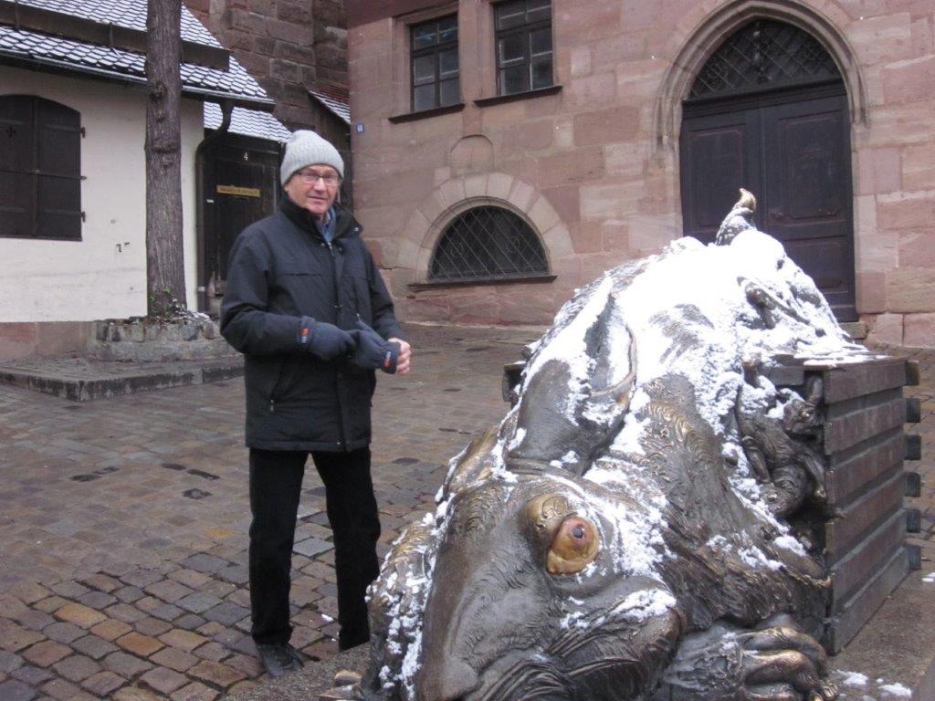 Verabredungsgemäß trafen wir uns um 11:15 Uhr am „Albrecht Dürer Hasendenkmal“ am Tiergärtner Tor-Turm. Über die allseits bekannte Bronzeskulptur des Bildhauers Jürgen Goertz (nach Motiven des Dürer Bildes „Feldhase“) haben sich schon Viele die Mäuler zerrissen. Des Künstlers Grundgedanke war wohl einen markanten Treffpunkt für die Besucher aus dem In- und Ausland zu schaffen. Und das ist ihm gelungen auf diesem stimmungsvollen Platz mit dem Dürer Haus, dem Pilatus Haus mit dem Ritter St. Georg und seinem Drachen und der allseits bekannten „Schlenkala“ Schänke nahe der Kaiser-Burg. Unsere nette Führerin erwies