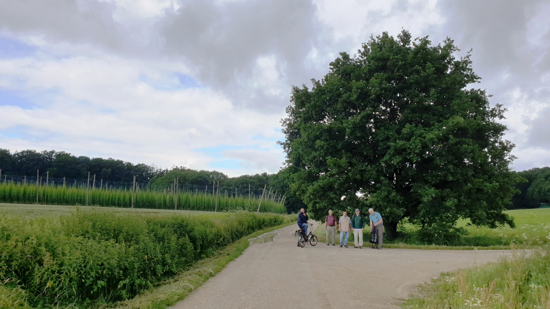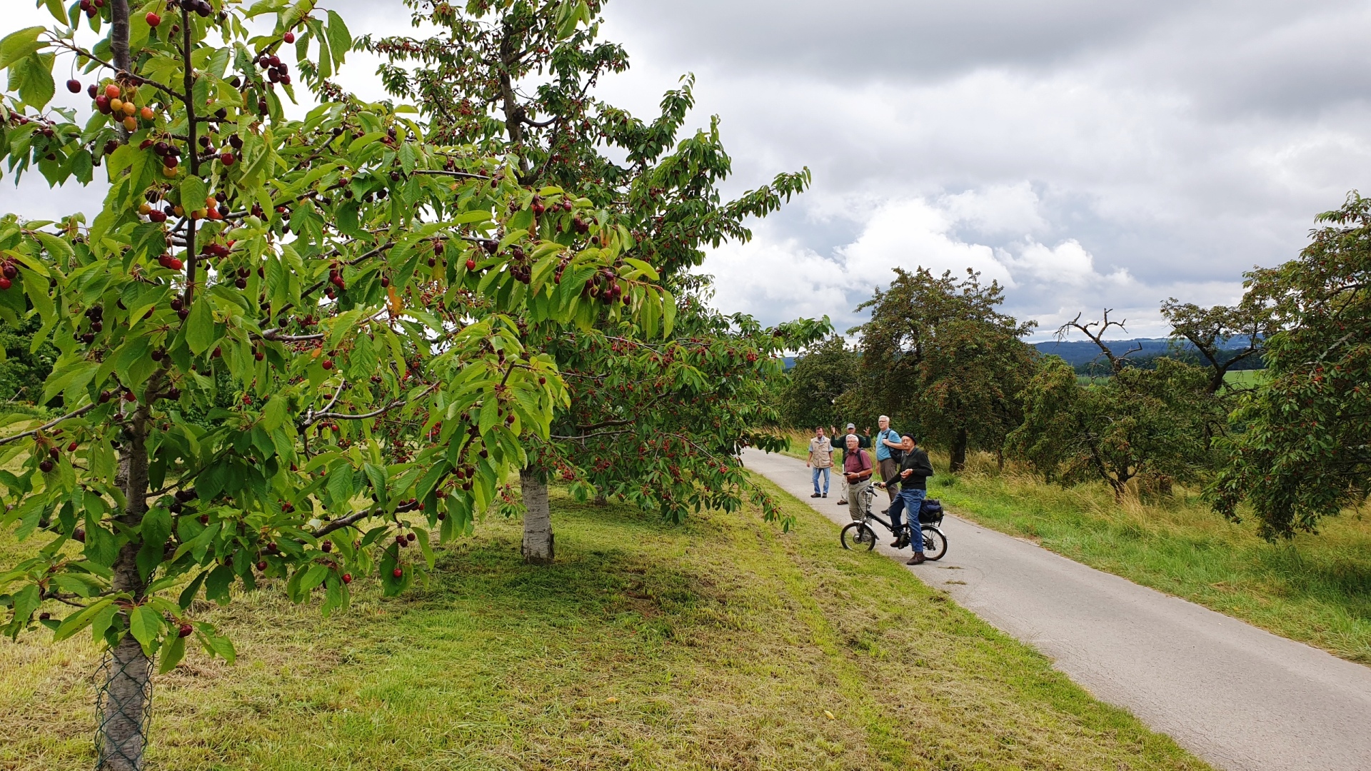 Im Gegensatz zum schwarzblauen Himmel haben wir also wegen des verlorenen Kampfes gegen die Brexitterrier keine Träne vergossen, es war halt nicht verdient – wenn Taktik nicht passt und keiner Lust hat ... und vom Hin und Her im eigenen Strafraum haben wir ja auch wirklich genug gesehen! Aber auch der Himmel hat nicht lange getrauert - nur bis wir an unserem Startpunkt ankamen - an der Gräfenbergbahn in Igensdorf, pünktlich um 10:00 Uhr. Trockenen Fußes erklommen wir so den ersten Anstieg zu den Kirschen oberhalb Igensdorf. Willi mit seinem Stahlross keuchte hinterher und rang nach Luft. Henry motivierte ihn mit der Aussicht auf dunkelrote Kirschen und den dann leichten Höhenweg. „In fremden Revieren zu