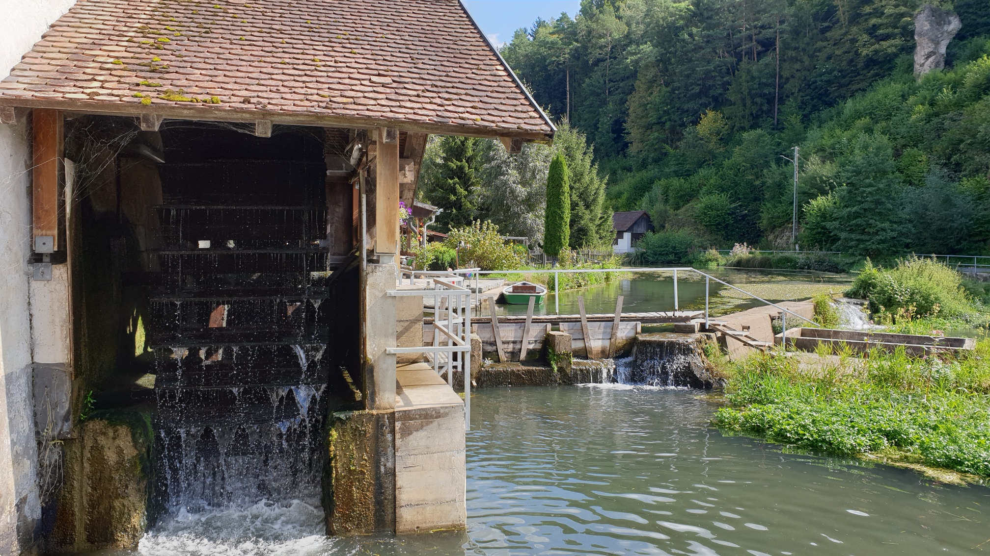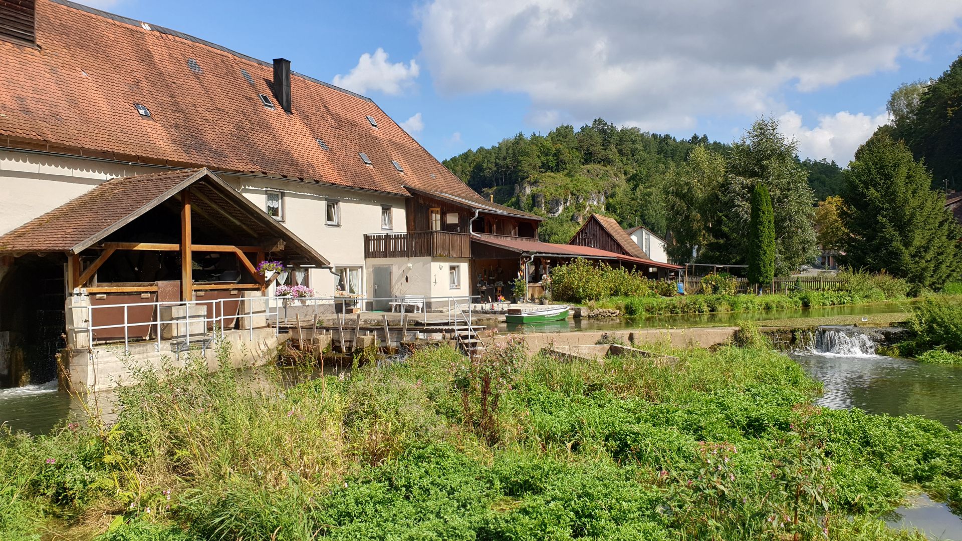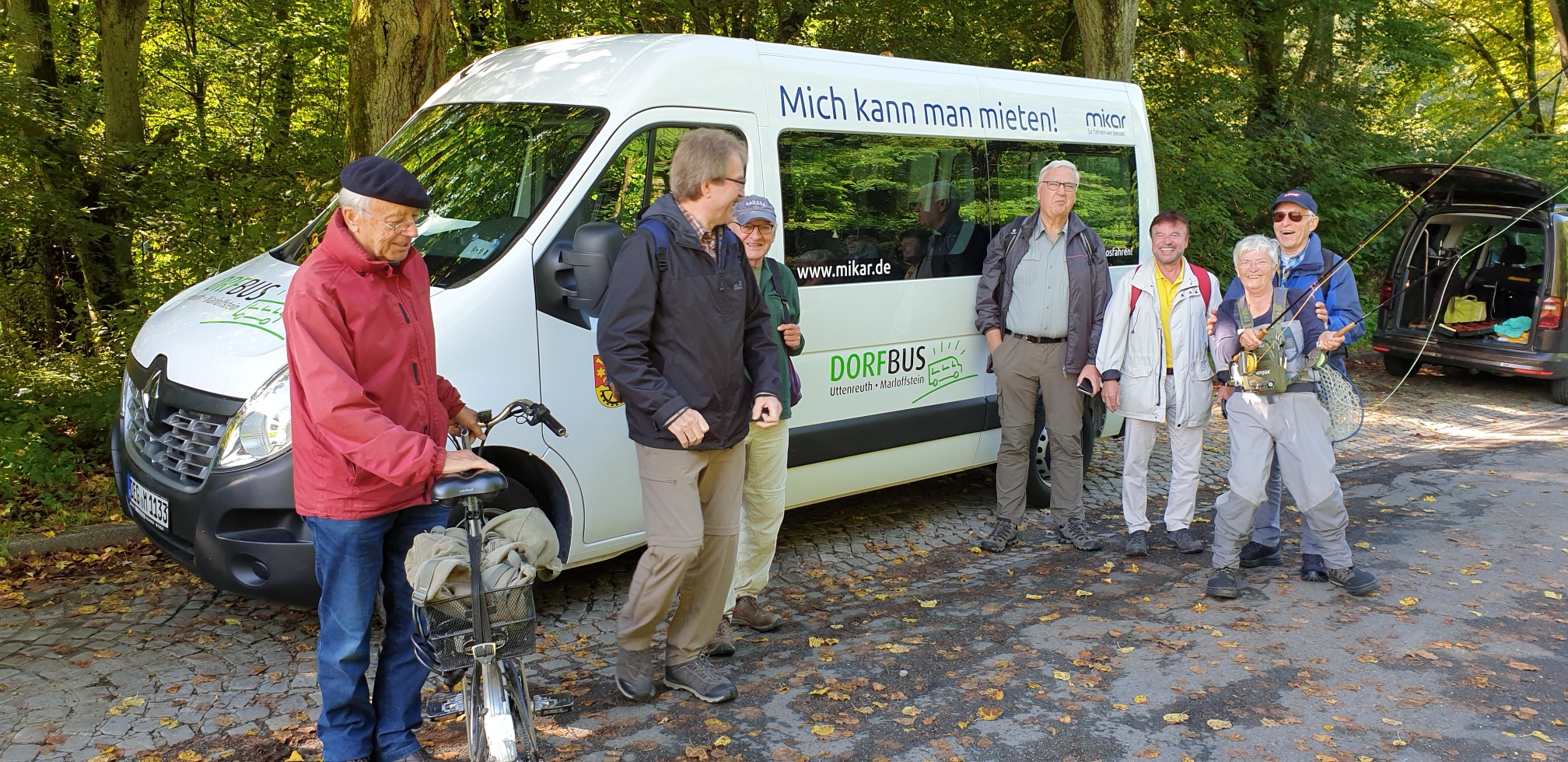Führer Udo. Der Nebel verzieht sich und die Burgruine Neideck begrüßt uns auf der Fahrt entlang der Wiesent bis zur Pulvermühle. Dort erwartet uns ein Anglerpaar aus Nienburg. Die