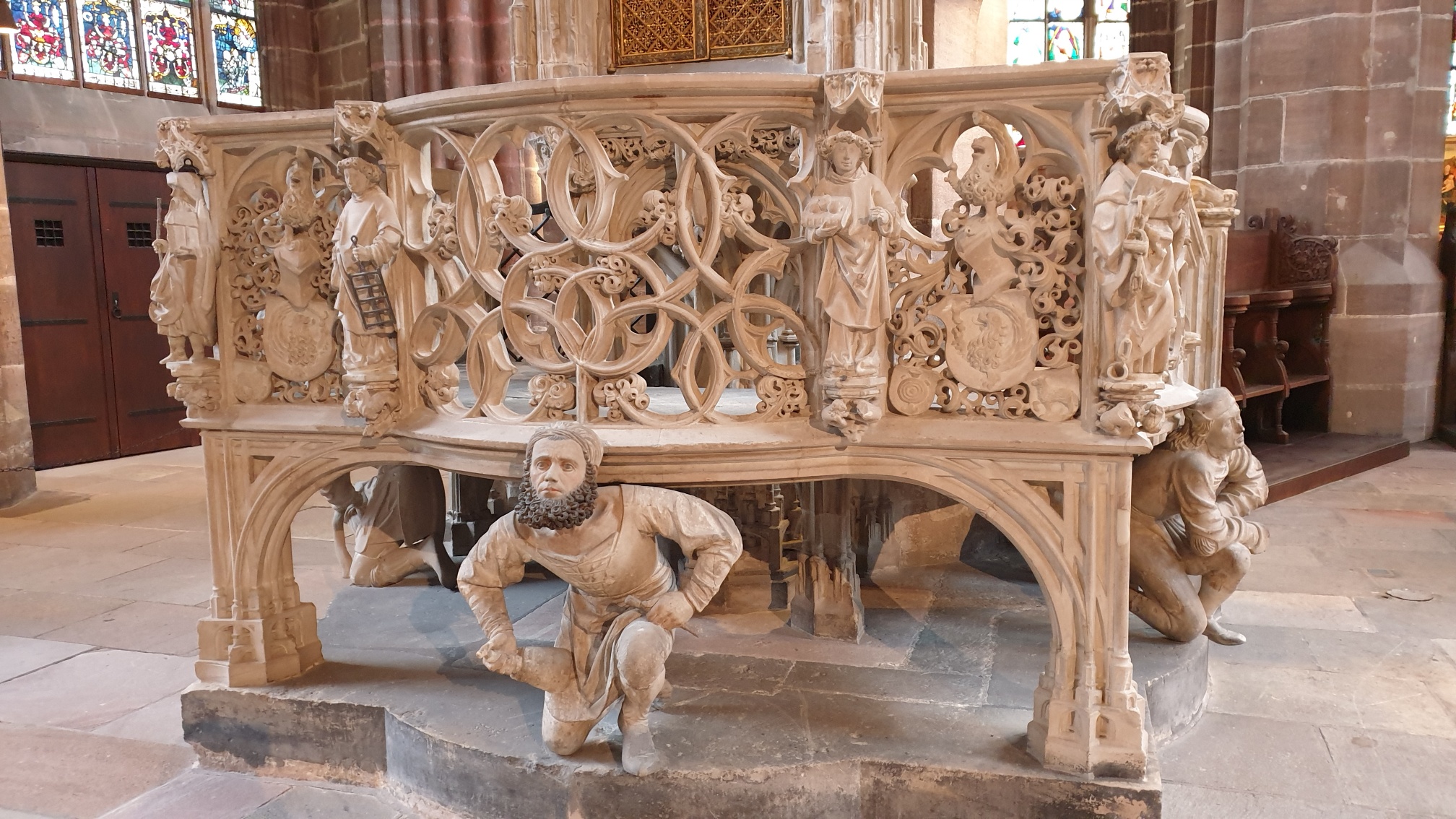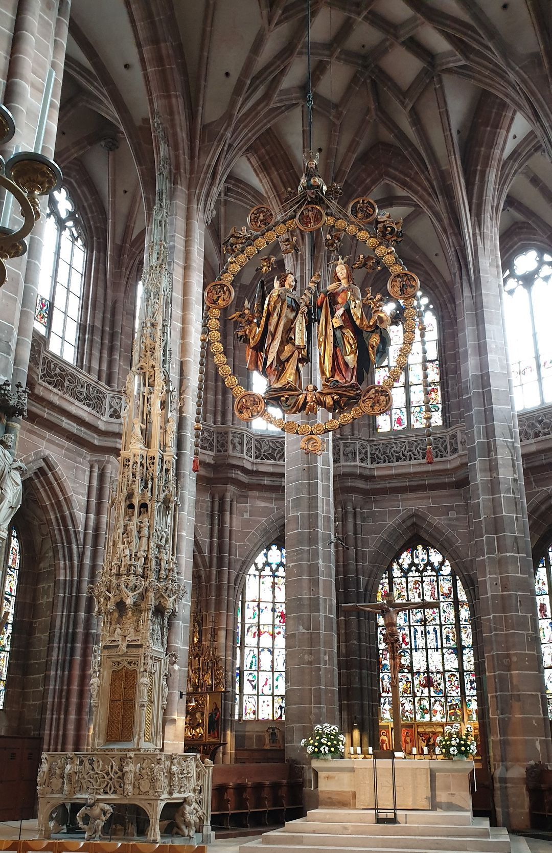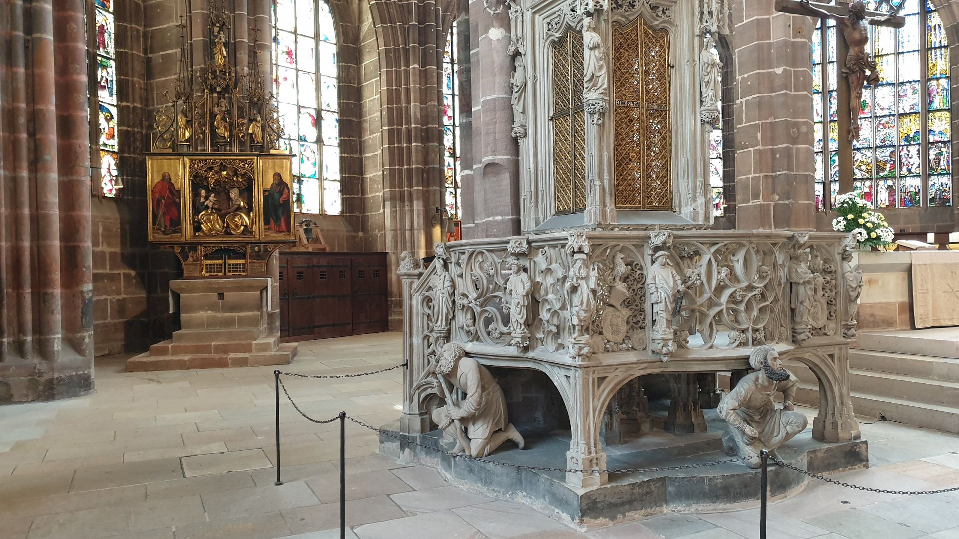 ![]() oben, im Hintergrund: Annenaltar, vorn rechts, als einer der Träger des "Sakramentshauses" hat sich Adam Kraft selbst verewigt unten: Adam Kraft ![]() unten: "Schmidtmayer-Fenster" von Albrecht Dürer und Hans/ Süß von Kulmbach |