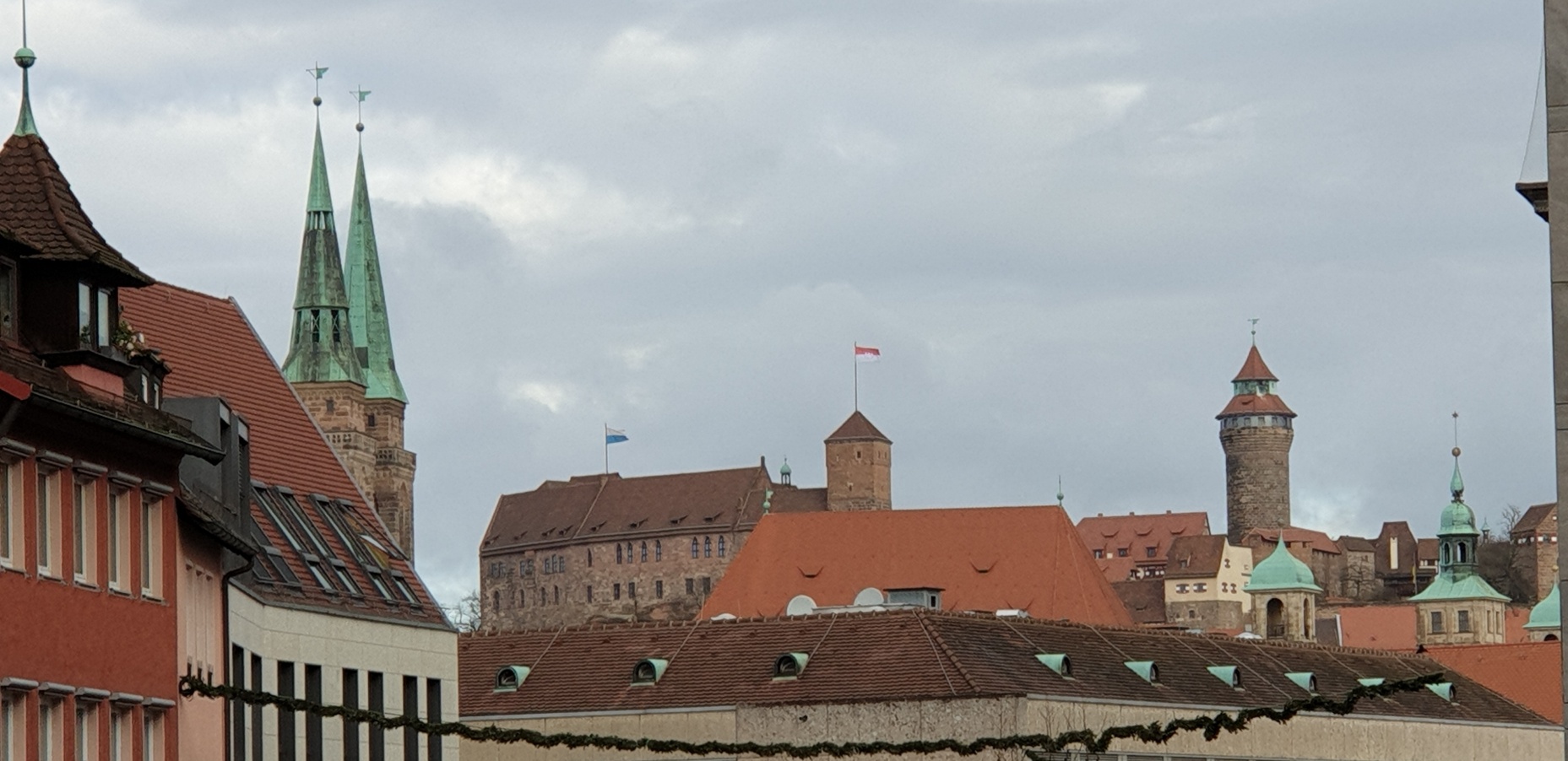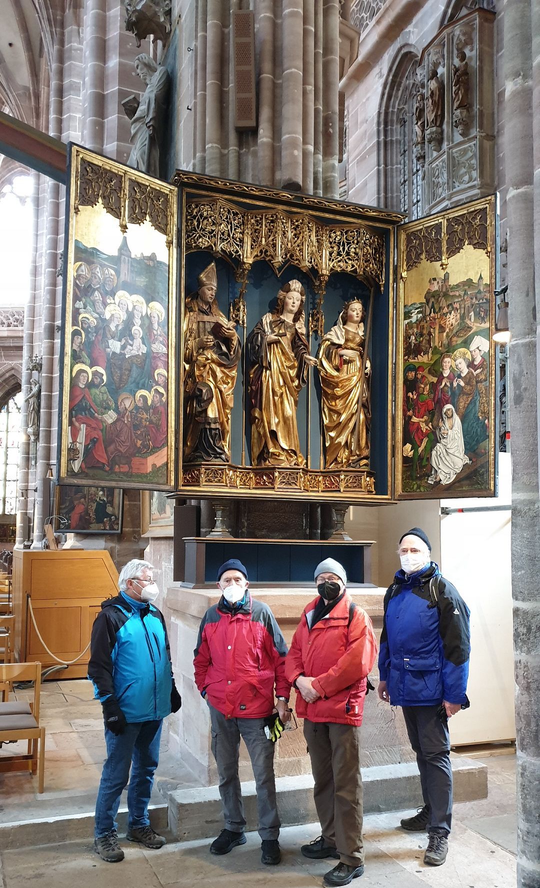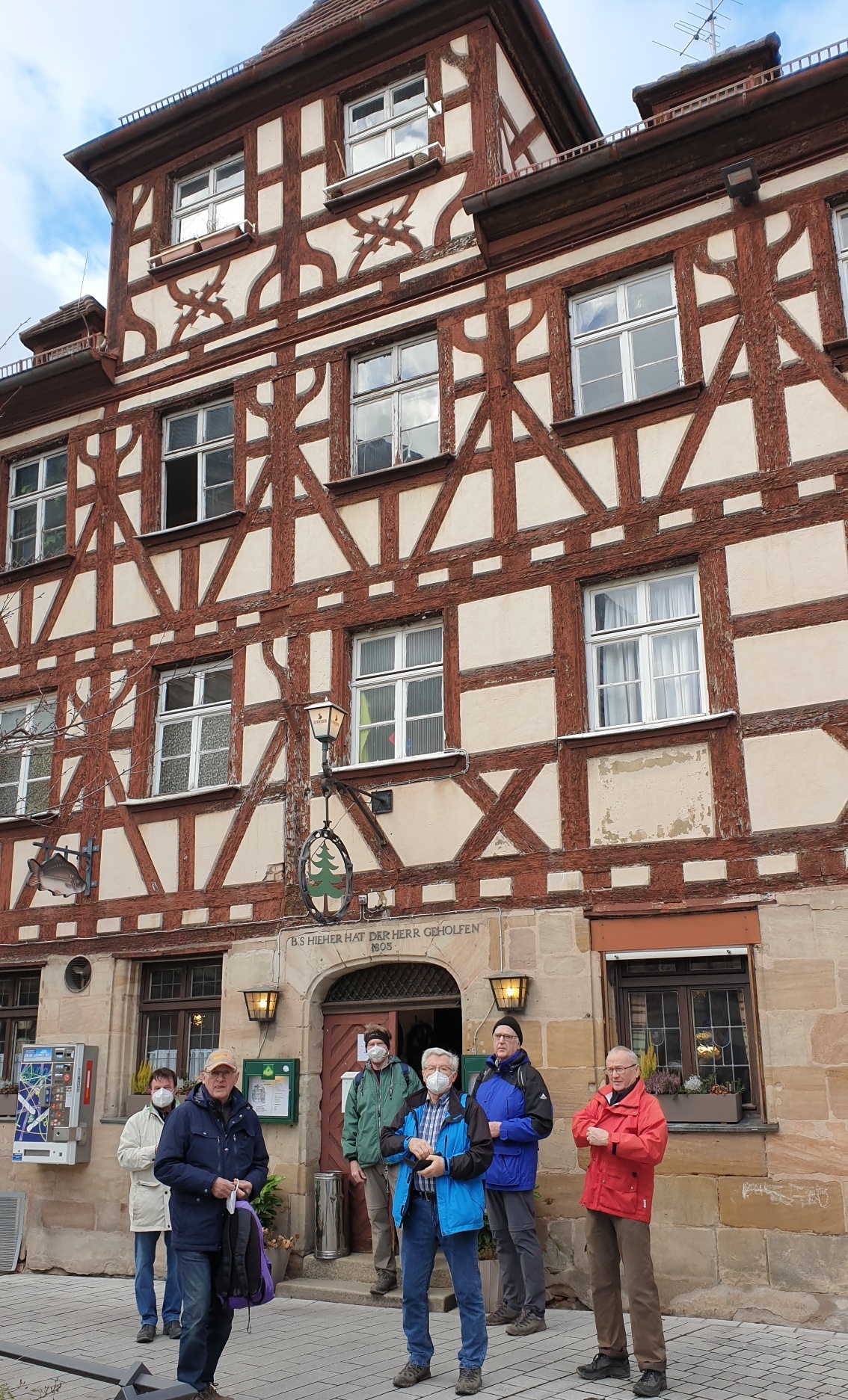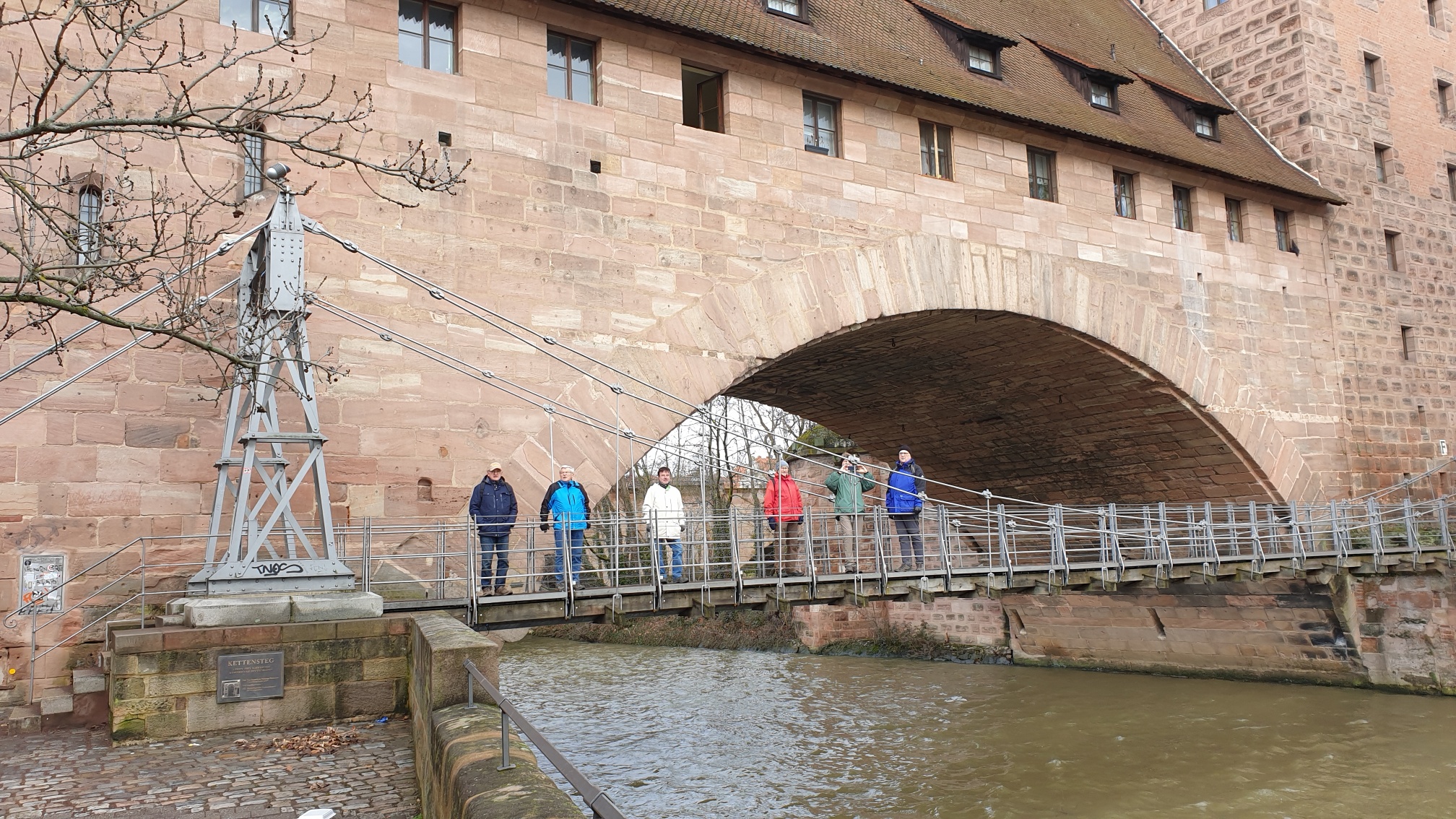 über die Fleischbrücke zum Kettensteg, Wieder starten wir bei leicht wolkenverhangenem Himmel am Bhf Erl Paul-Gossen-Straße. Günter nimmt uns am Eingang zum Handwerkerhof in Nbg in Empfang > und alle wissen natürlich noch, dass der Turm am (nicht mehr vorhandenen) Königstor NICHT Königstor-Turm heißt, sondern Frauentor-Turm. Vorbei am "Neuen Museum" kramen ManniKe und Udo in der Luitpoltstrasse in der Erinnerungskiste, dann geht es zwischen Hertie und Kaufhof zur Lorenzkirche - die wir natürlich besuchen. Nachdenklich schweigen alle