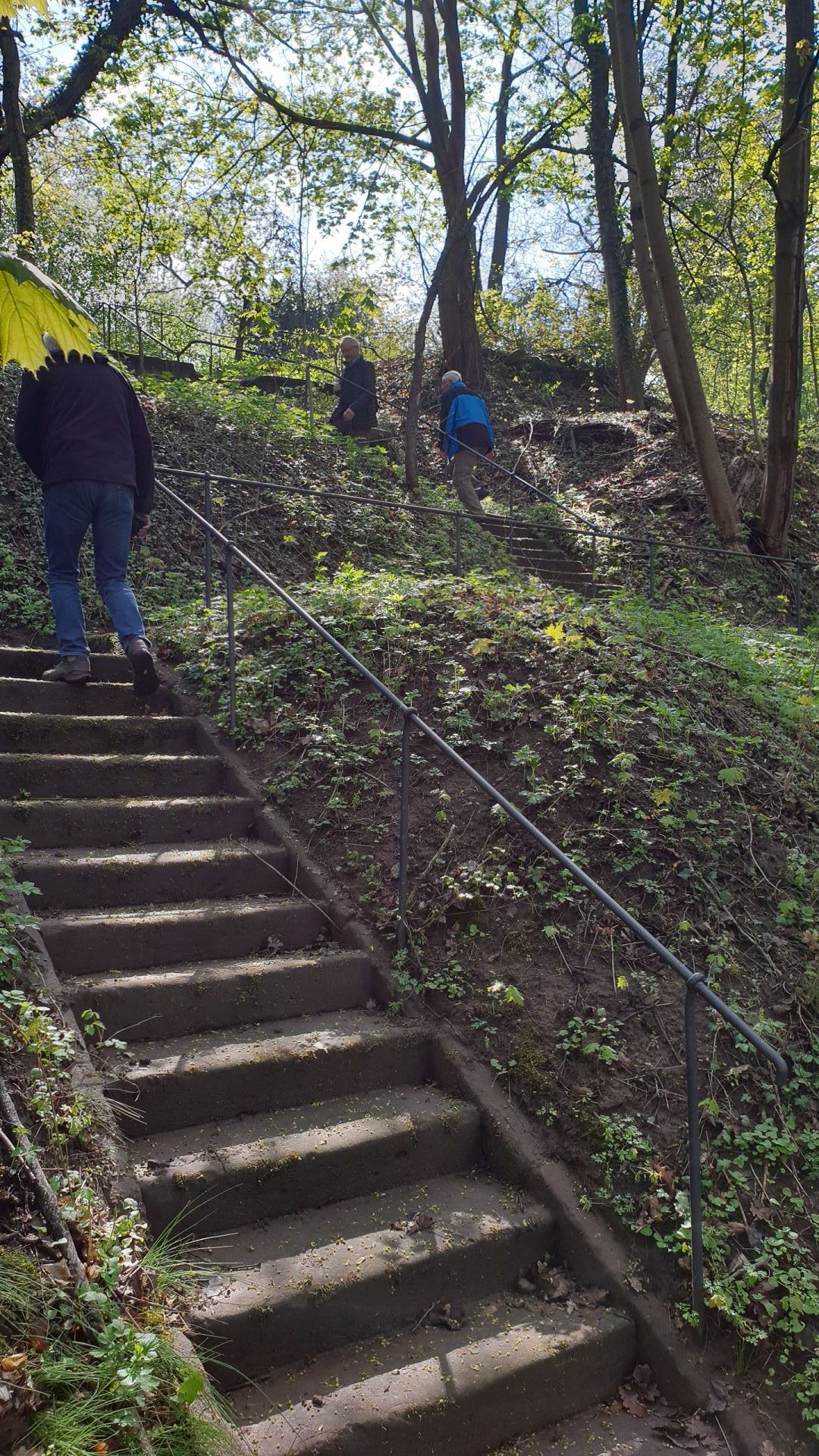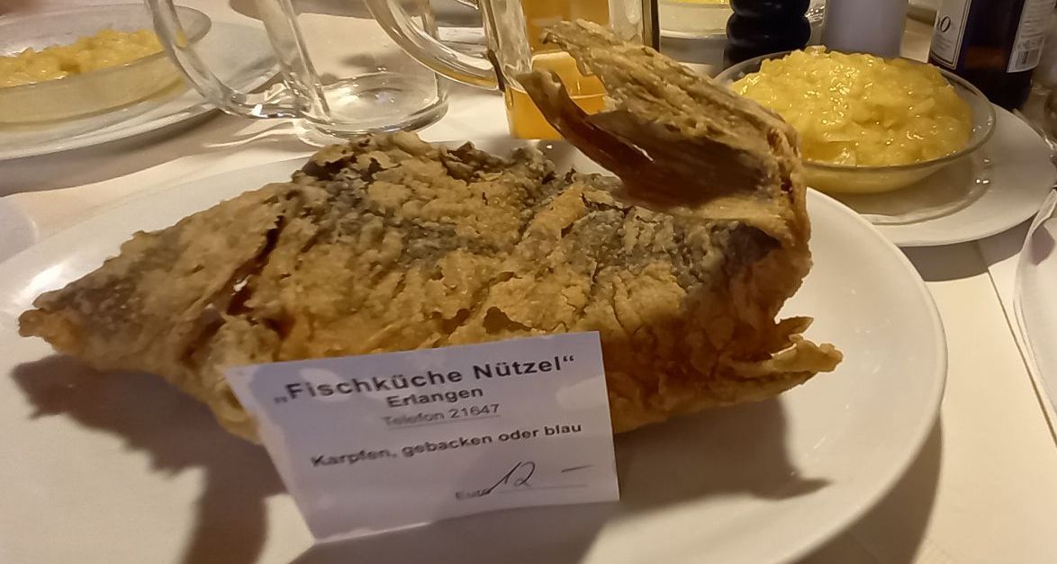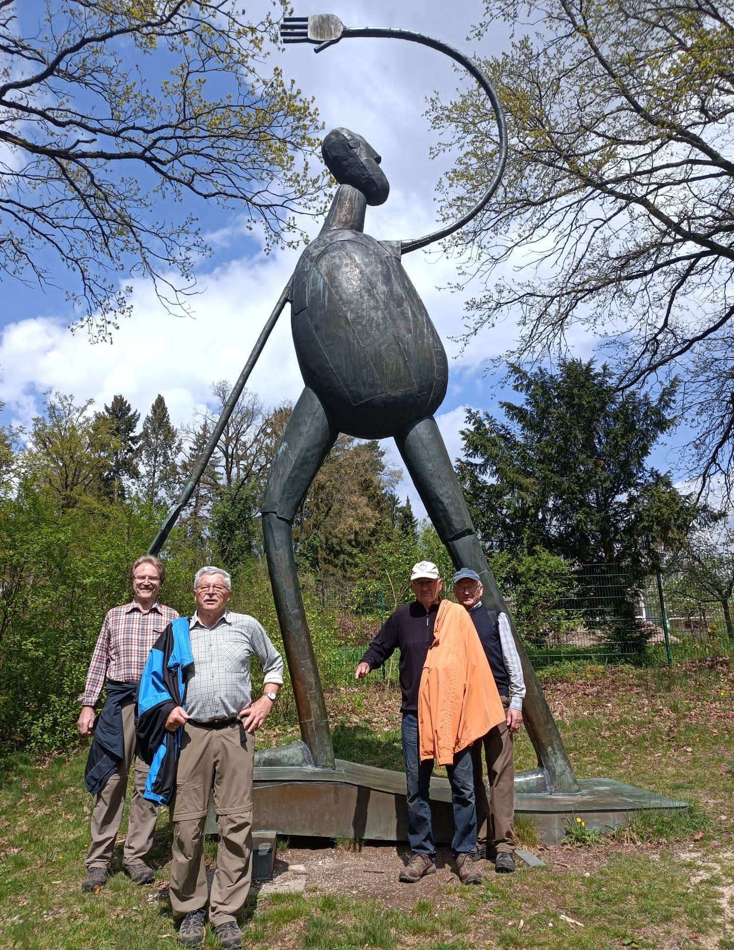 Bild-Kommentar). Wieder geht es durch den schönen (eigentlich Steckerlas-) Wald, der, wegen vieler Sträucher und Büsche, einen bemerkenswert frischen, grünen Eindruck erweckt - allerdings auf etwas breiteren, festen Forstwegen. Wir laufen jetzt auf der rückwärtigen Flanke eines Hügels zwischen Bubenreuth und Rathsberg, müssen aber ein paar Höhenmeter mehr als auf dem Hinweg "erklimmen". Beschwerden waren aber keine zu hören. Selbst einen kurzen Einwurf zu einer möglichen Abkürzung hat Henry halb verschluckt ☺ Am Waldkrankenhaus erreichen wir wieder erschlossenes Gelände. Über den Burgberg und den Skulpturengarten geht es dann auf direktem Weg zur Fischküche Nützel. Der Karpfen ist wie immer sehr gut und der