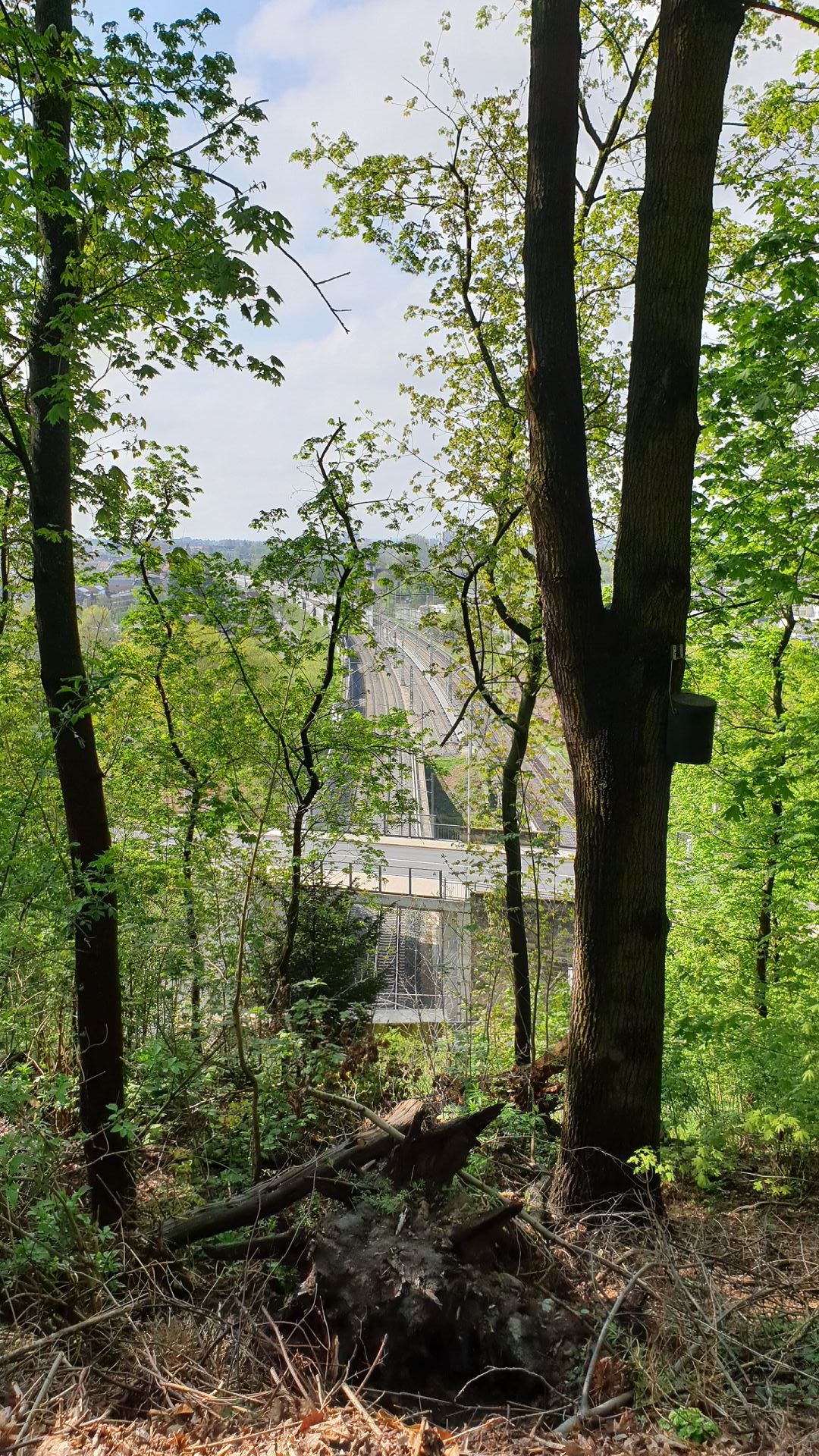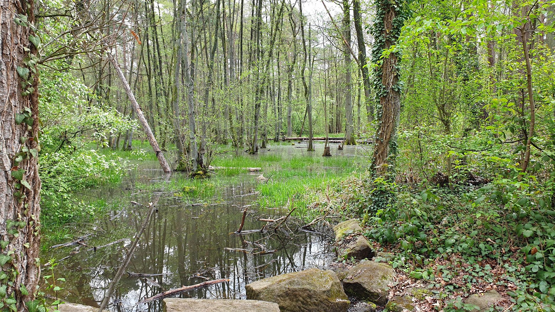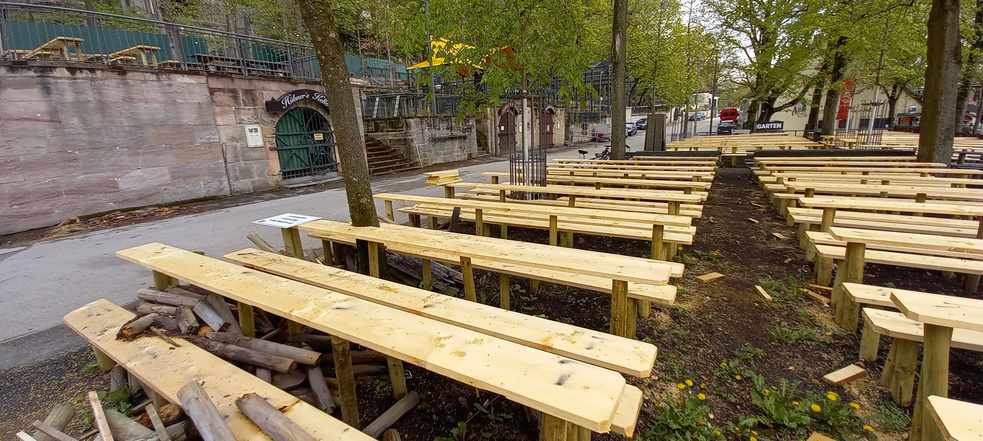Bild-Kommentar). Wieder geht es durch den schönen (eigentlich Steckerlas-) Wald, der, wegen vieler Sträucher und Büsche, einen bemerkenswert frischen, grünen Eindruck erweckt - allerdings auf etwas breiteren, festen Forstwegen. Wir laufen jetzt auf der rückwärtigen Flanke eines Hügels zwischen Bubenreuth und Rathsberg, müssen aber ein paar Höhenmeter mehr als auf dem Hinweg "erklimmen". Beschwerden waren aber keine zu hören. Selbst einen kurzen Einwurf zu einer möglichen Abkürzung hat Henry halb verschluckt ☺ Am Waldkrankenhaus erreichen wir wieder erschlossenes Gelände. Über den Burgberg und den Skulpturengarten geht es dann auf direktem Weg zur Fischküche Nützel. Der Karpfen ist wie immer sehr gut und der