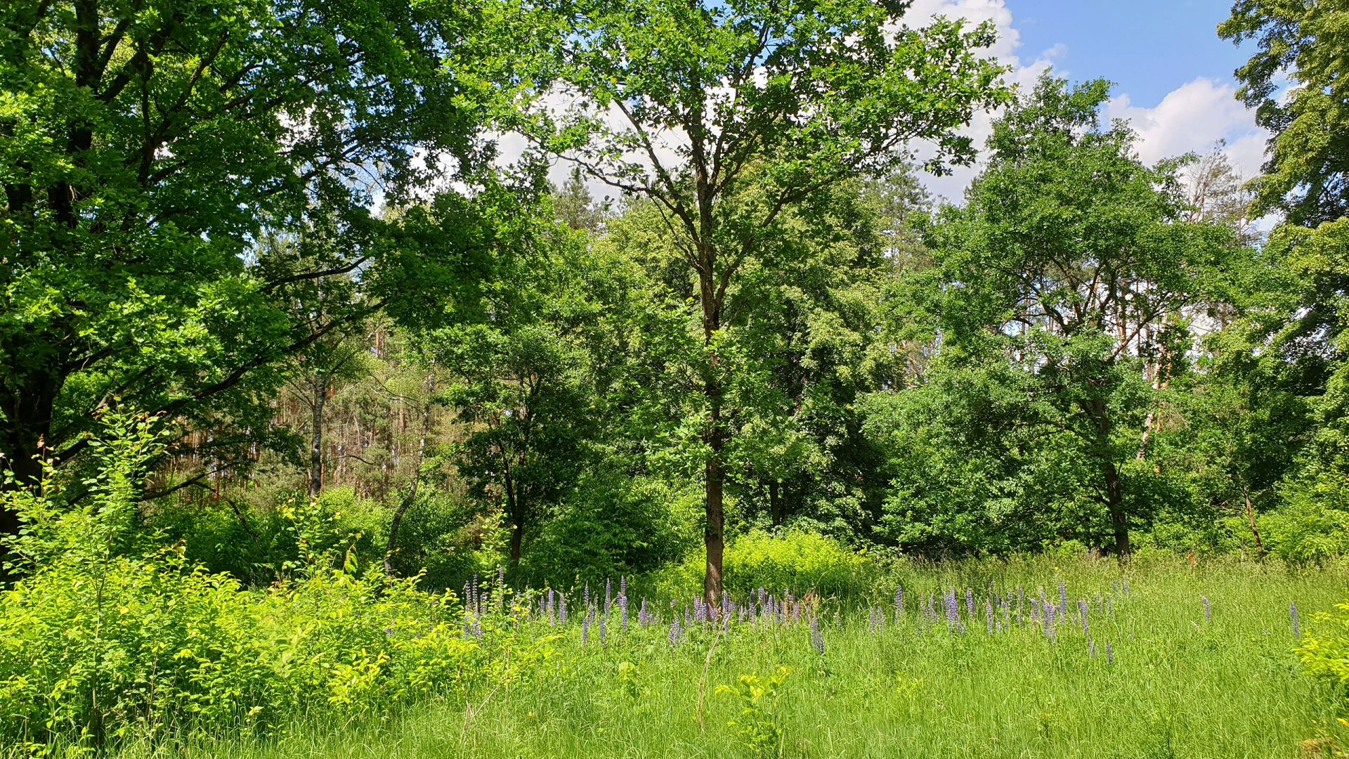 blühenden Blumen (u.a. Lupinen) und Sträuchern,