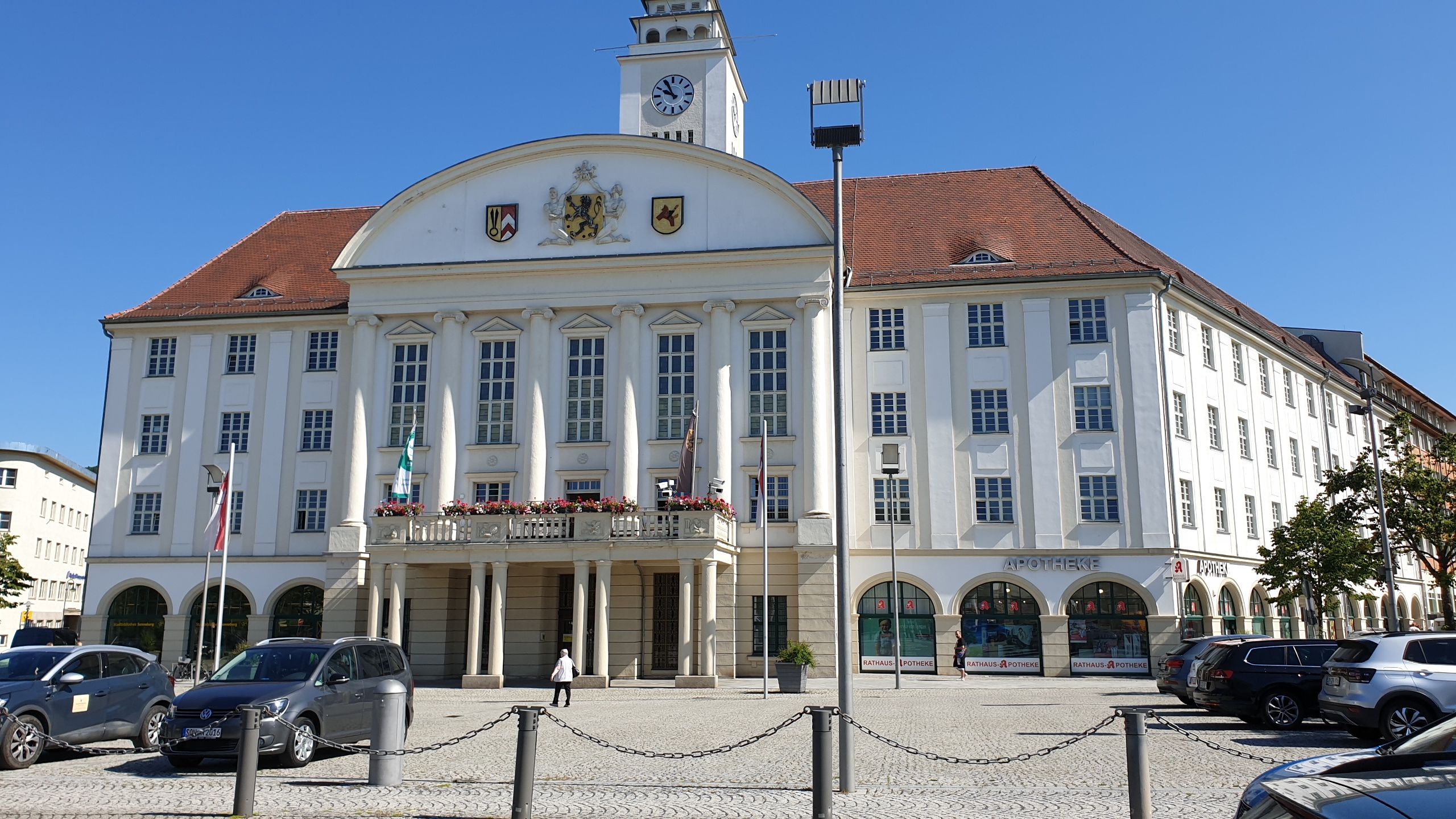 Rathaus Sonneberg: 1928 erfolgte die Einweihung des "neuen" Sonneberger Rathauses. Mit dem Neubau, gekrönt von dem imposanten 40m hohen Turm, fand zugleich das damals vielbeachtete städtebauliche Ensemble um den Bahnhofsvorplatz in Sonneberg seine Vollendung. https://www.komoot.de/smarttour/9573430/zoom