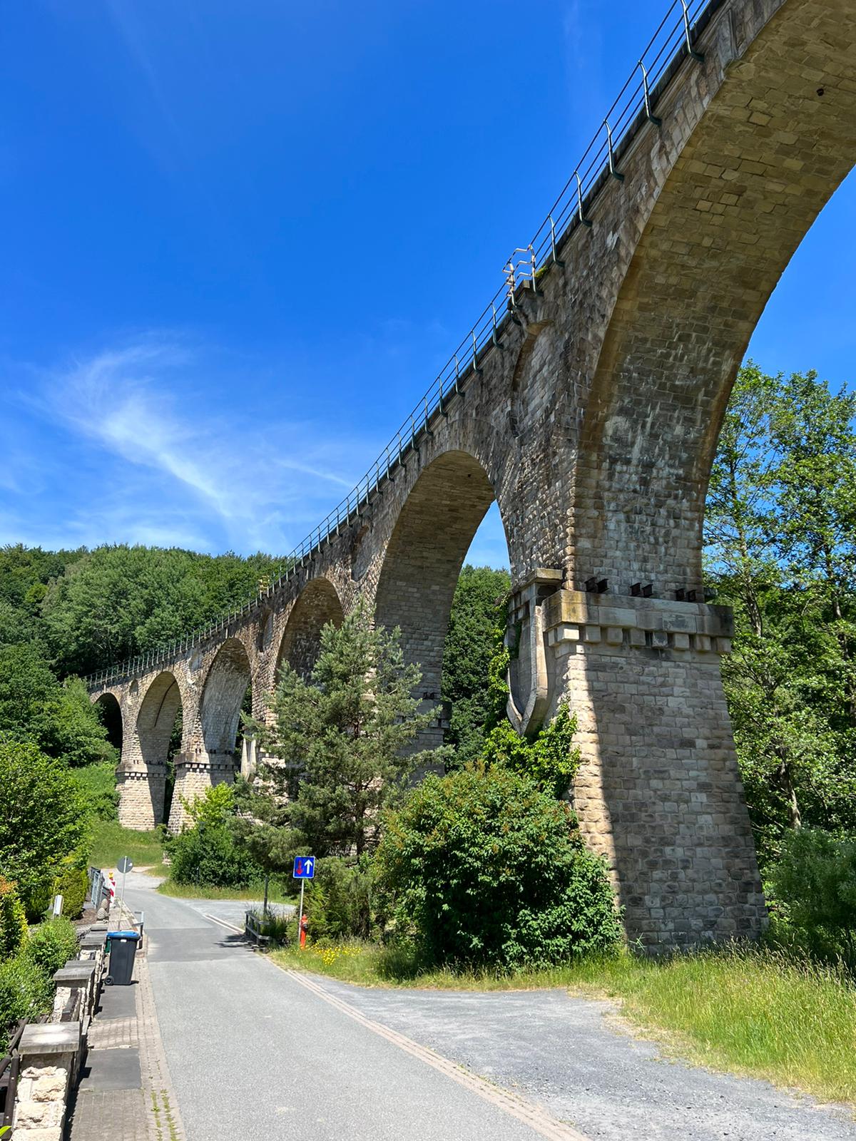 Das imposante Teufelsbachtal-Viadukt in Sonneberg-Mürschnitz, unweit des Haltepunktes Sonneberg/West, wurde 1909 im Rahmen der eingleisigen, heute noch in betrieb befindlichen Bahnstrecke Eisfeld–Sonneberg, nach Plänen der Königlichen Eisenbahndirektion Erfurt als mit Sandstein verkleidete Bruchsteinkonstruktion auf einer Länge von 250m errichtet. Im April 1945 sprengte die Wehrmacht die beiden östlichen Gewölbe. 1947 war das Bauwerk wiederhergestellt. Das im Grundriss gekrümmte überspannt mit acht Gewölben von je 17 Meter lichter Weite den Teufelsgraben. Quelle: de.wikipedia.org/wiki/Liste_der_Kulturdenkmale_der_Sonneberger_Ortsteile