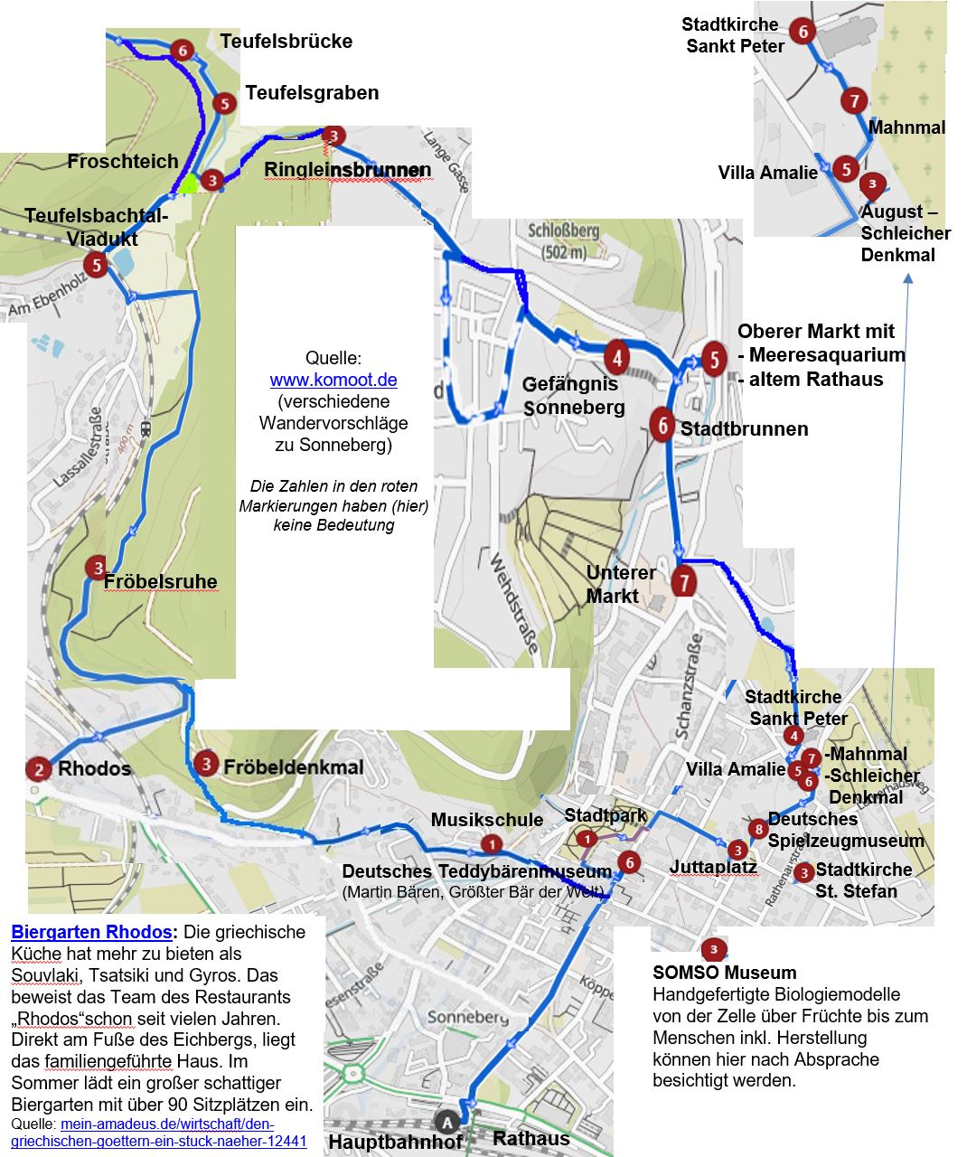 Das 9,- Euro-Ticket zieht uns in die Ferne - zumindest so weit, dass Fahrzeit und Wanderzeit in einem vernünftigen Verhältnis stehen. Und wir haben gelernt: Wenn man die Züge meidet, für die die DB Mitnahmewarnungen meldet, sind sie auch nicht voller oder/ und verspäteter J, als in der Vor9Euro-Zeit! Empfehhlenswert ist das Lokal "Rhodos, abgerundet hat den Tag ein Eisbecher im Stadt-Cafe'. Unsere Tour: Sonneberg (Thür) Hbf: Der Hauptbahnhof Sonneberg wurde schon für die Bahnstrecke Eisfeld–Sonneberg, der „Hinterlandbahn“, errichtet. Er löste 1907 den heute als Wohngebäude genutzten Alten Bahnhof ab, der für den ersten Teilabschnitt der Bahnstrecke Coburg–Ernstthal am Rennsteig, einer Zweigstrecke der Werrabahn, 1857 bis 1858 errichtet wurde. Basis: Wikipedia